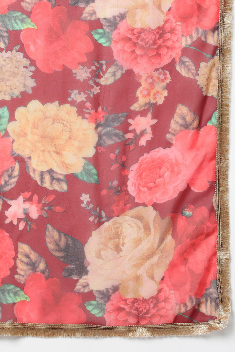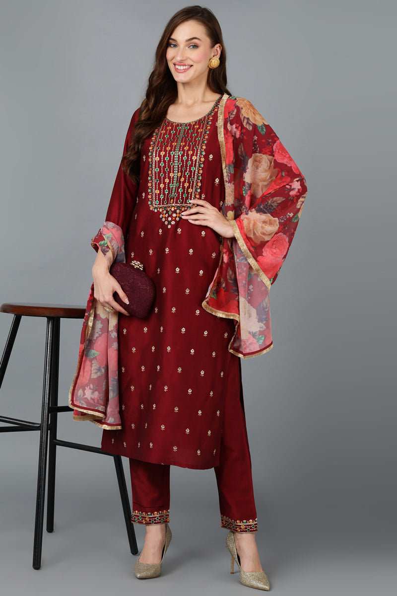 Enhance Your Looks By Sporting This Maroon-Colored Suit Set Crafted From The Smooth Silk Blend Fabric. This Embroidered Kurta Features A Round Embroidered Neckline, Three-Quarter Sleeves, A Straight Hemline, And Side Slits For A Comfortable Feel. It Is Paired With A Straight Bottom Having An Embroidered Hemline And A Pocket. The Poly Georgette Dupatta Has A Digital Print On It Which Compliments The Look Of This Embroidered Kurta.