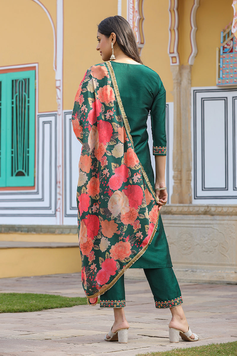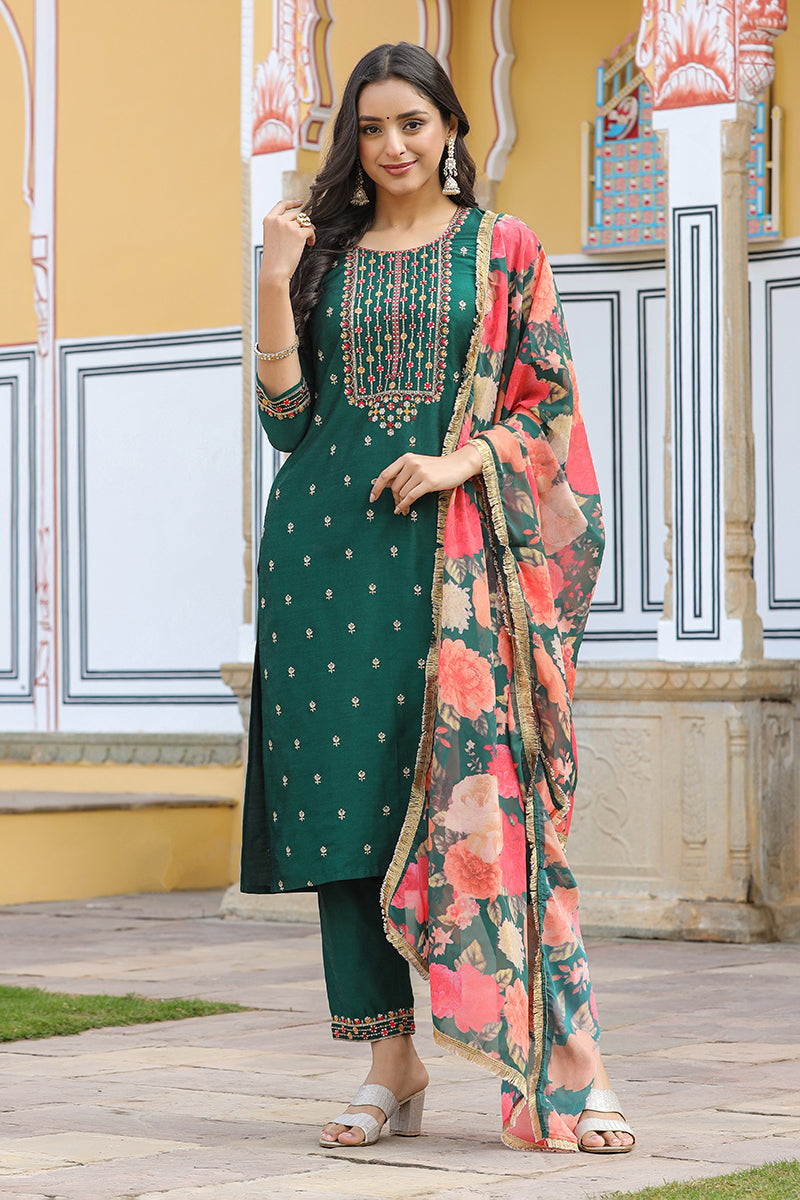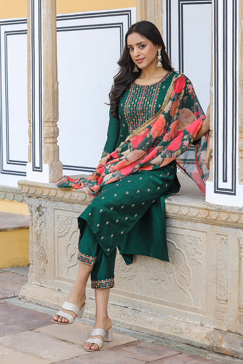Tailored From The Finest Silk Blend Fabric, The Kurta Has An Embroidered Round Neck And Three-Quarter Sleeves. It Is Designed To Grab The Attention With The Poly Georgette Pocketed Bottom With An Embroidered Hem And A Digitally Printed Dupatta. Pair It With Block Heels And Oxidized Jewelry For A Ravishing Look.