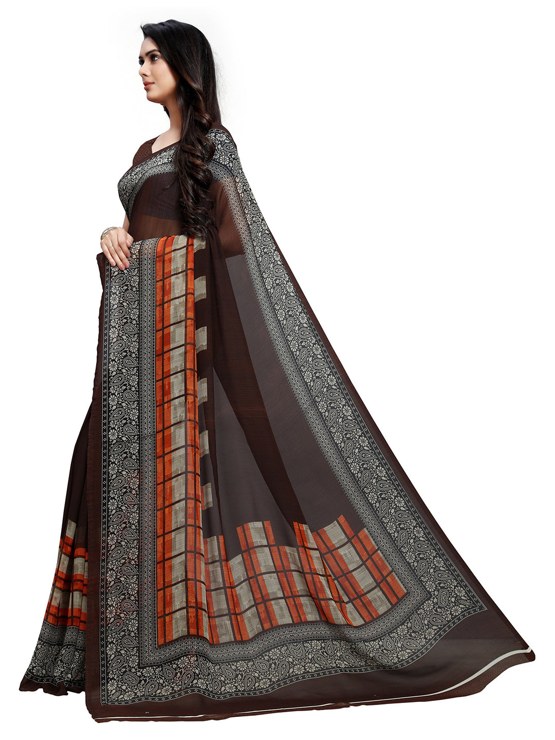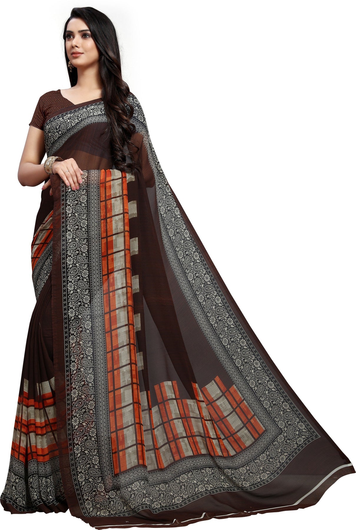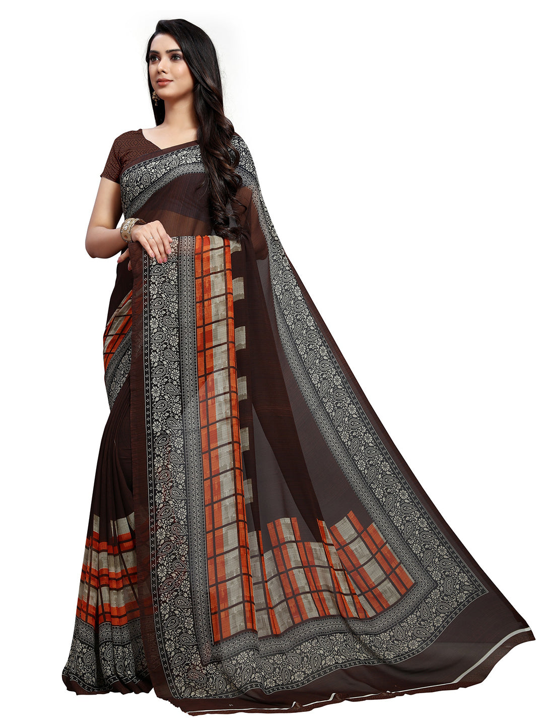 Classy Saree Look Pretty Like Never Before.Wearing This Brown Color Saree Which Made From Georgette With Brown Color Georgette Blouse,Saree Has Also Decorative Work Like Printed.This Beautiful Saree Features A Classy Printed Work All Over,Which Makes It A Smart Pick For All Occasions. You Can Wear This Saree In Different Styles. You Can Wear It Occasionally Or Casually.