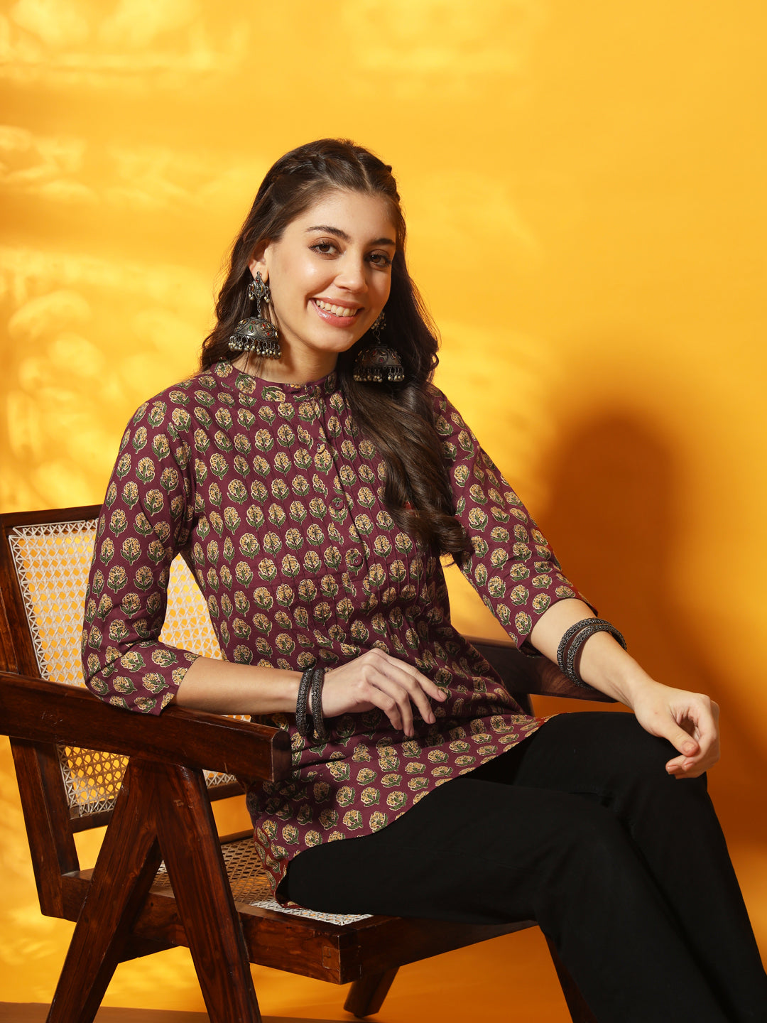 Brown And Mustard Yellow Floral Bagru Printed Mandarin Collared Three Quarter Sleeves Apple Cut Hem Tunic With Side Slits