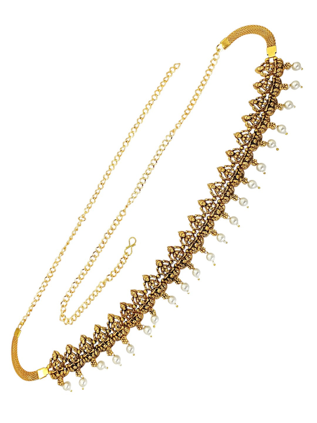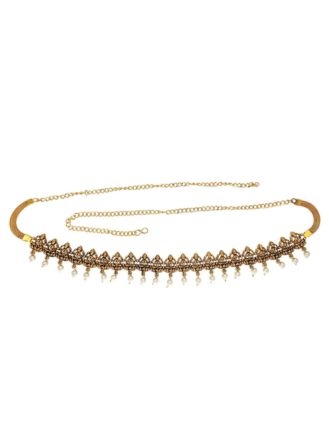Gold Toned Laxmi Design Waist Belt, Studded With White Beads. Secured With S Hook Closure.