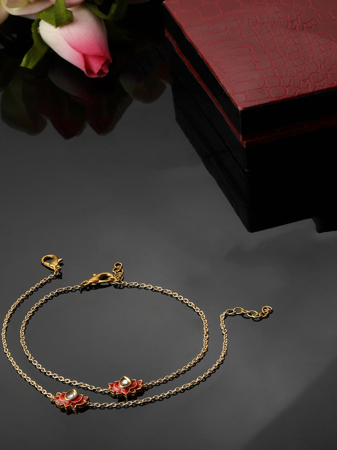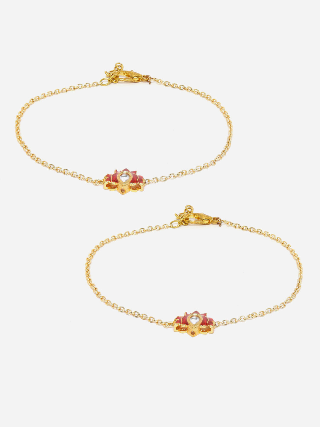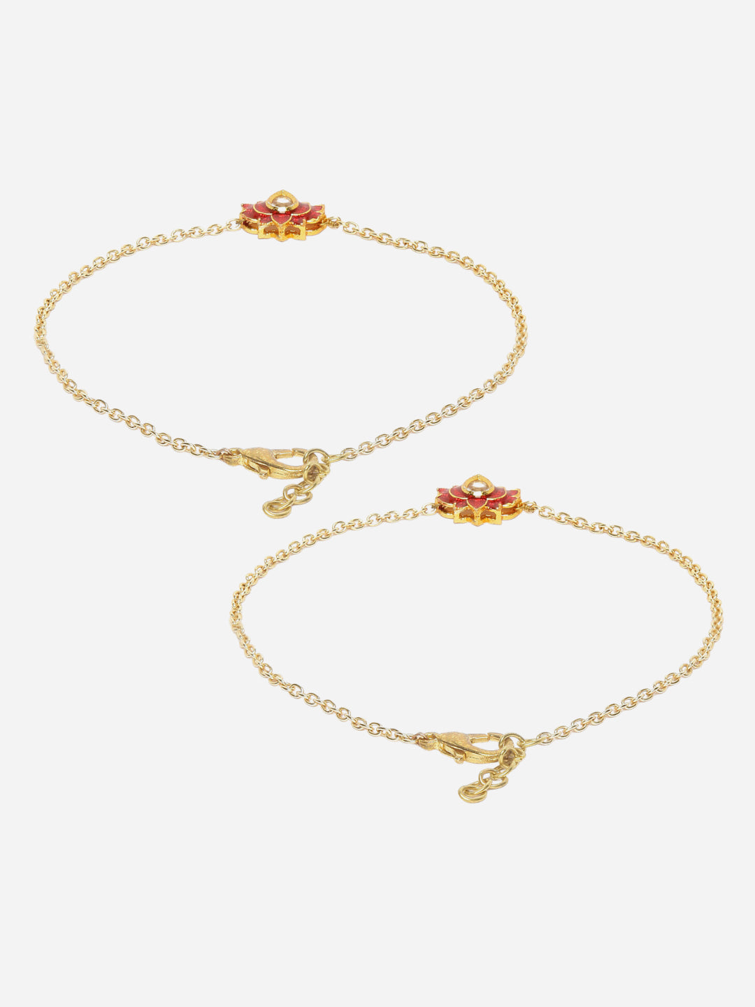 Meenakari Lotus With Chain In Gold Polish Wiyth Finish Finish Payal.. Elegant And Simple To Give U Classy Look This Festive Season; Category Of Jewellery Is Other Accessories; Sub Category Is Anklet; Ideal For Women; Color Is Red, Gold, White; Gemstones Used - Kundan, Pearls, Natural Stones; Plating Is Gold-Plated; Base Metal Is Alloy; Other Material Used - Adjustable Chain; Size Is Freesize; Adjustable - Yes; Weight Is 5 Gms; Mesaurements - Length Of Payal =25.3 Cm; Width Of Payal = 1.2 Cm; Adjustable - Yes; Content 1 Pair Anklet