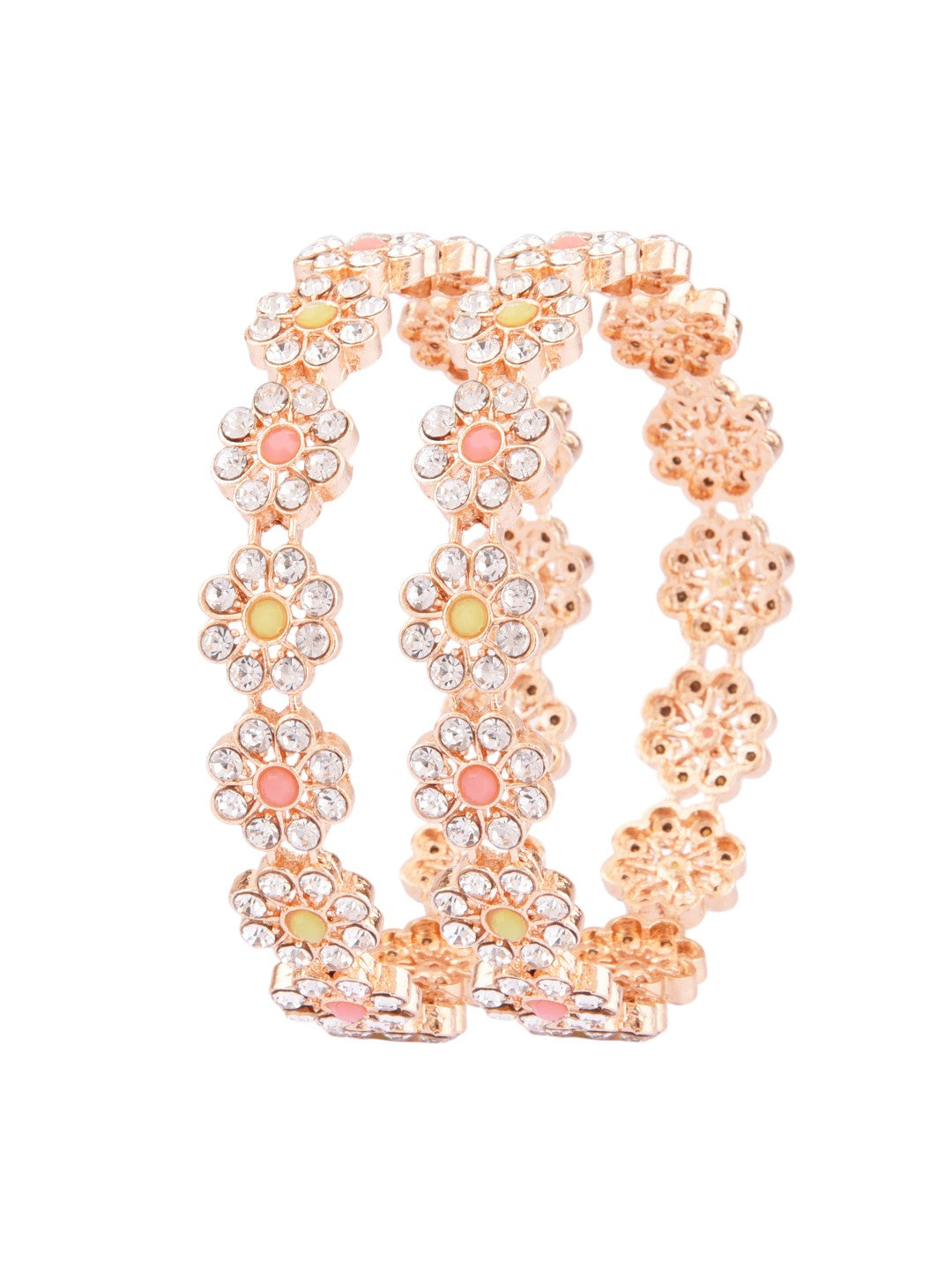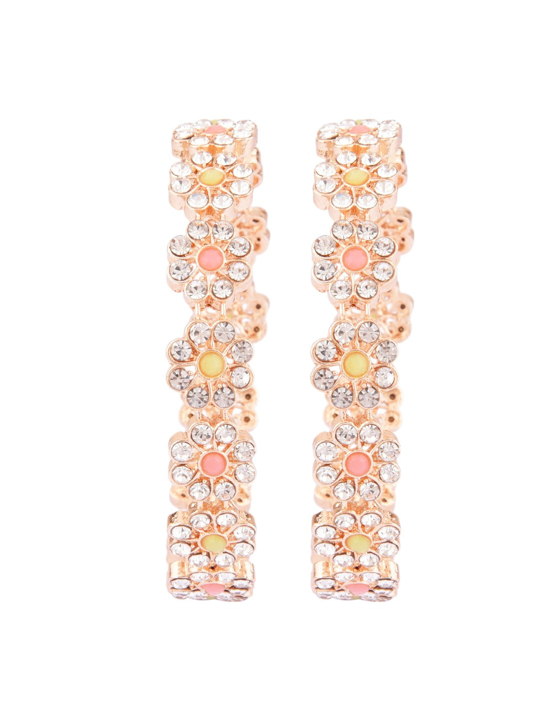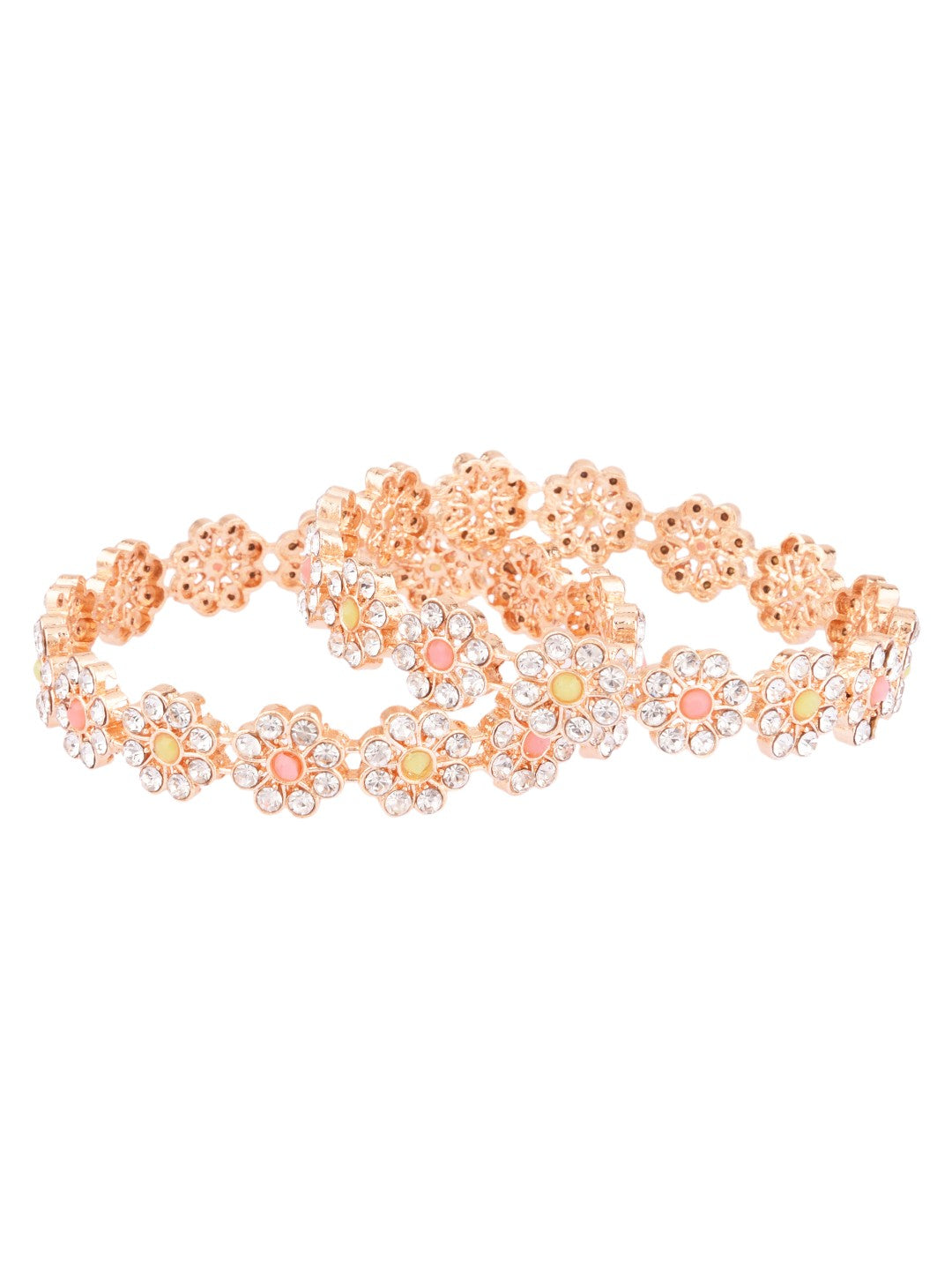 Women's Rose Gold Plated 2Pc Floral Multicolor Cz Bangles Girls