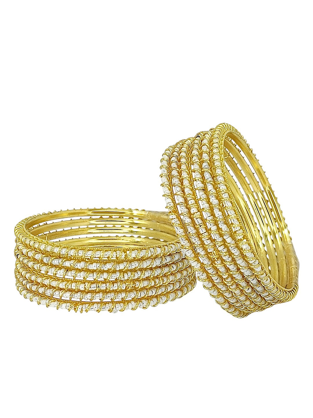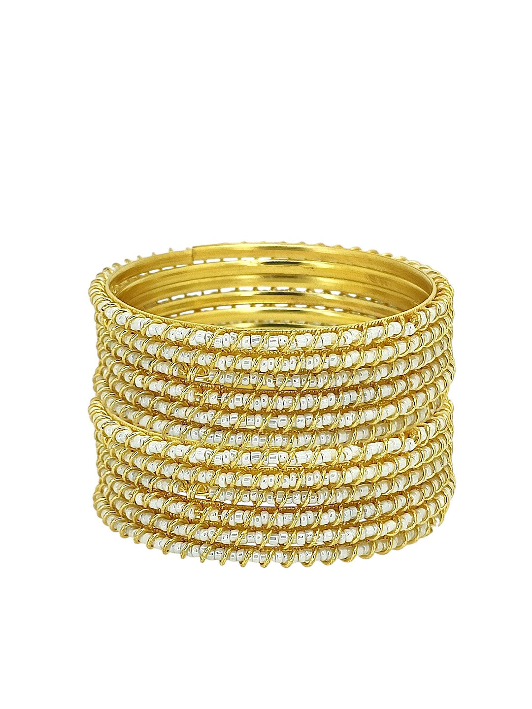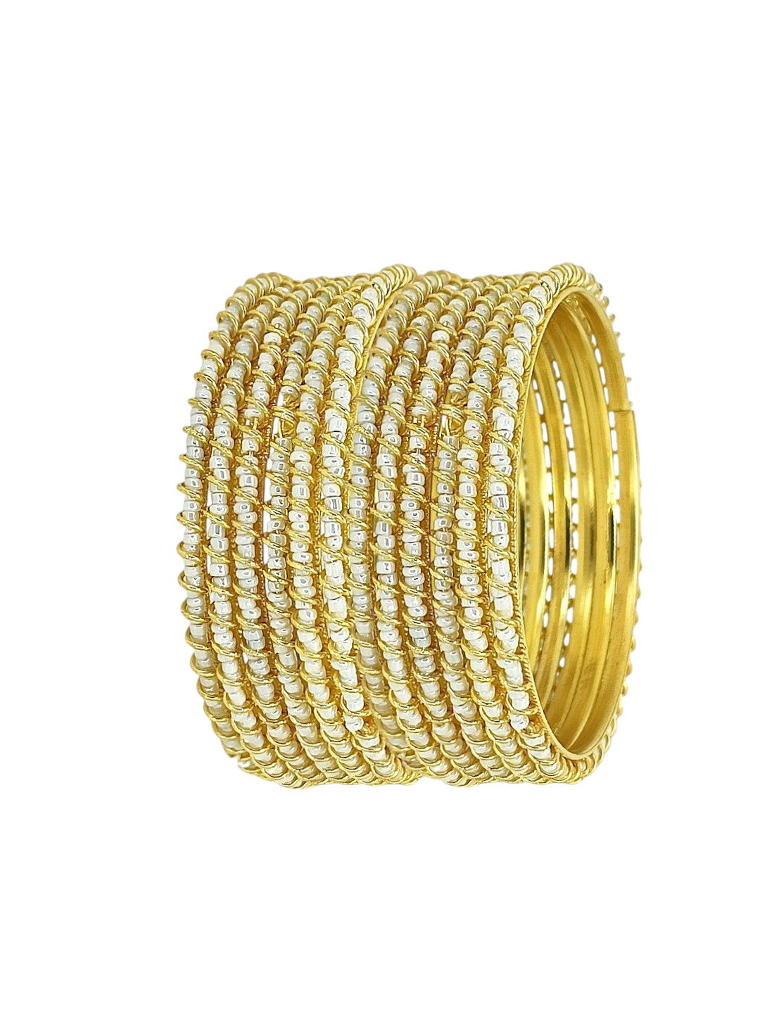 Set Of 12 Gold Plated Beads Studded Metal Bangles Set. Secured With Slip On Closure