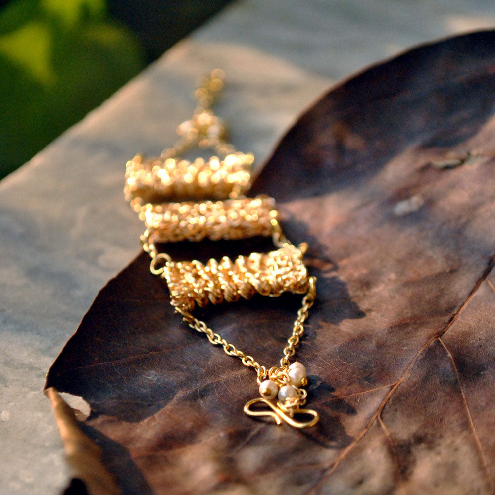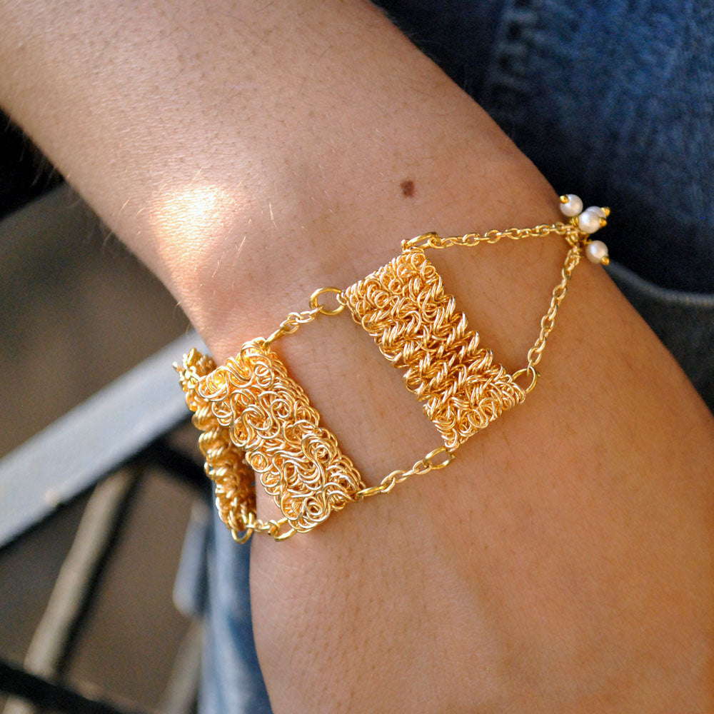 Flaunt This Gorgeous Mesh Bracelet This Season . Three Rectangular Alloy Mesh Components Has Been Beautifully Arranged And Horizontally Linked With Metal Chain. Bunch Of Beaded Pearls At Both Ends Enchance The Look.