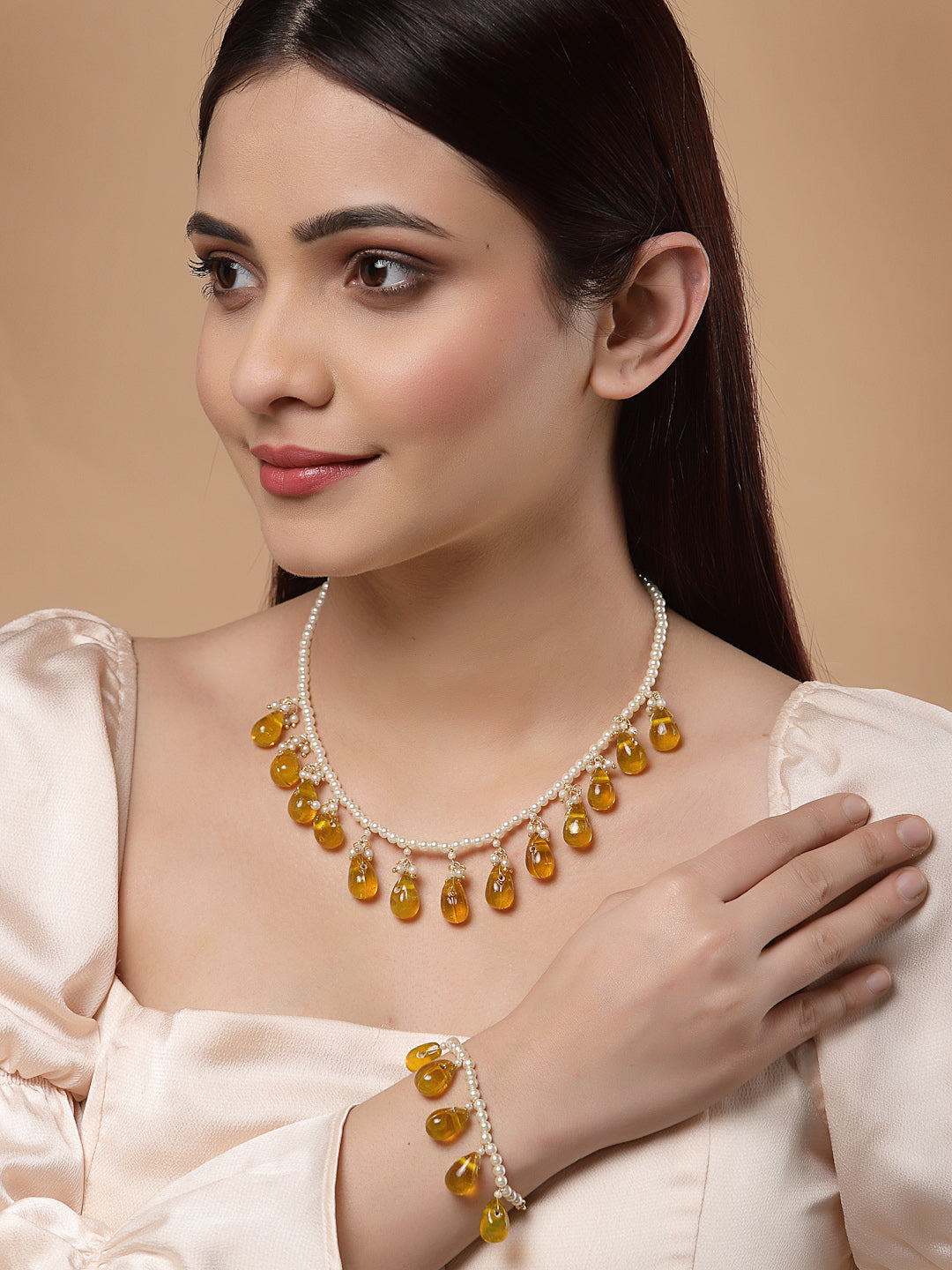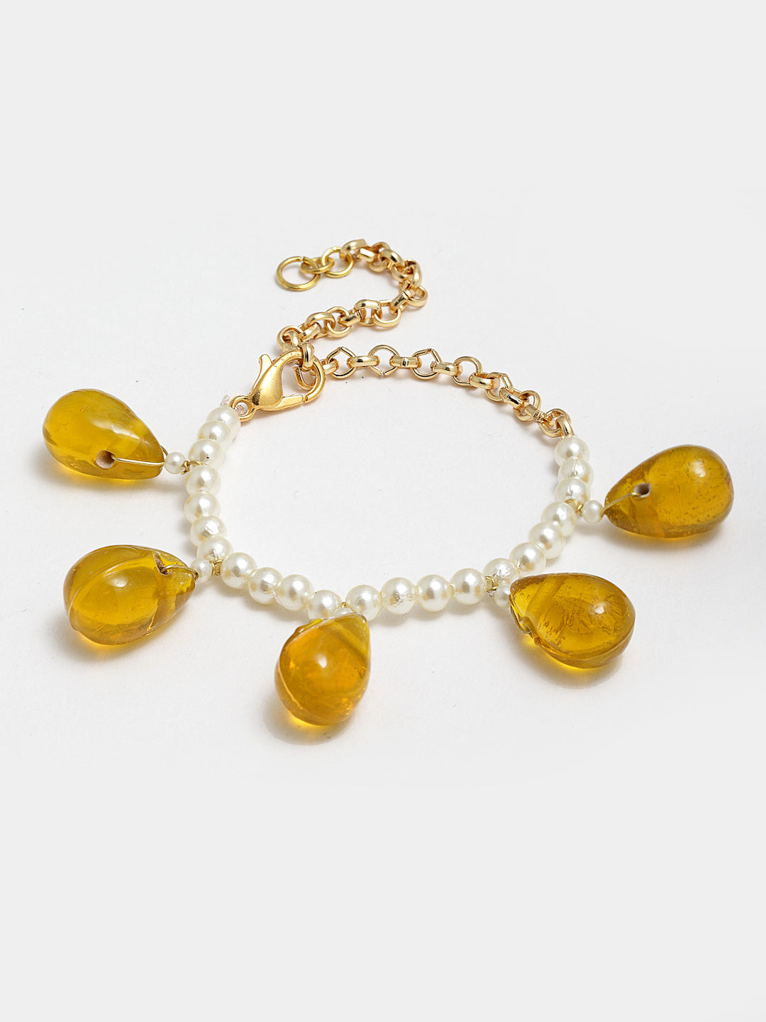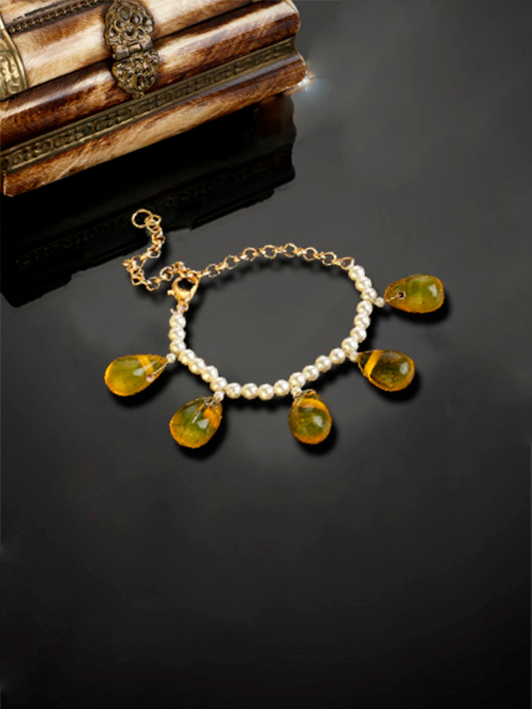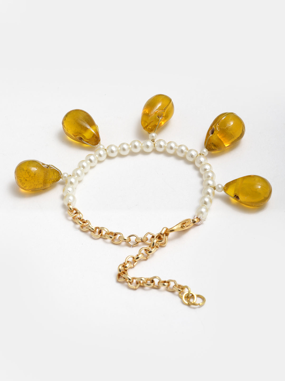 Beauty Of Semi Precious Stones Charms With Pearls To Give U Classy And Cool Evening Look; Category Of Jewellery Is Hand Jewellery; Sub Category Is Bracelets; Ideal For Women; Color Is Yellow, Gold, White; Gemstones Used - Pearls, Natural Stones; Plating Is Gold-Plated; Base Metal Is Alloy; Other Material Used - Adjustable Chain; Size Is Freesize; Adjustable - Yes; Weight Is 11 Gms; Mesaurements - Width Of Bracelet = 0.9 Cm; Diameter Of Bracelet =6.03 Cm; Circumference Of Bracelet = 18.95 Cm; Adjustable - Yes; Content 1 Bracelet