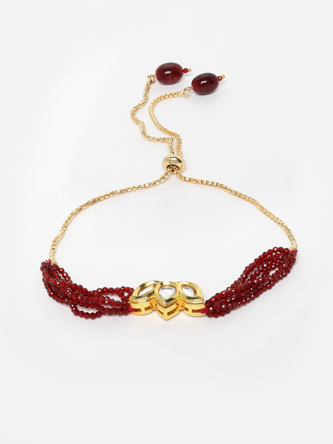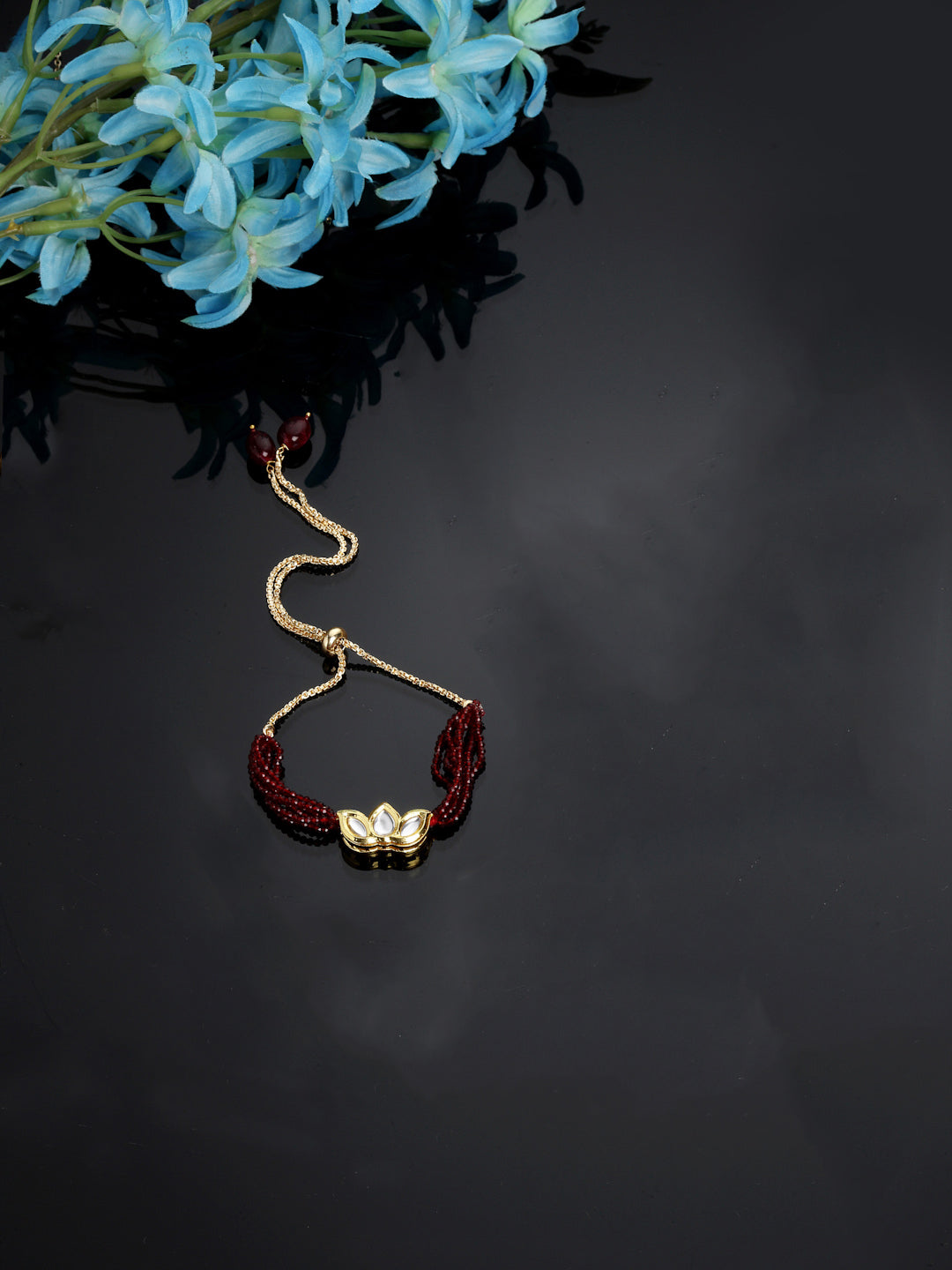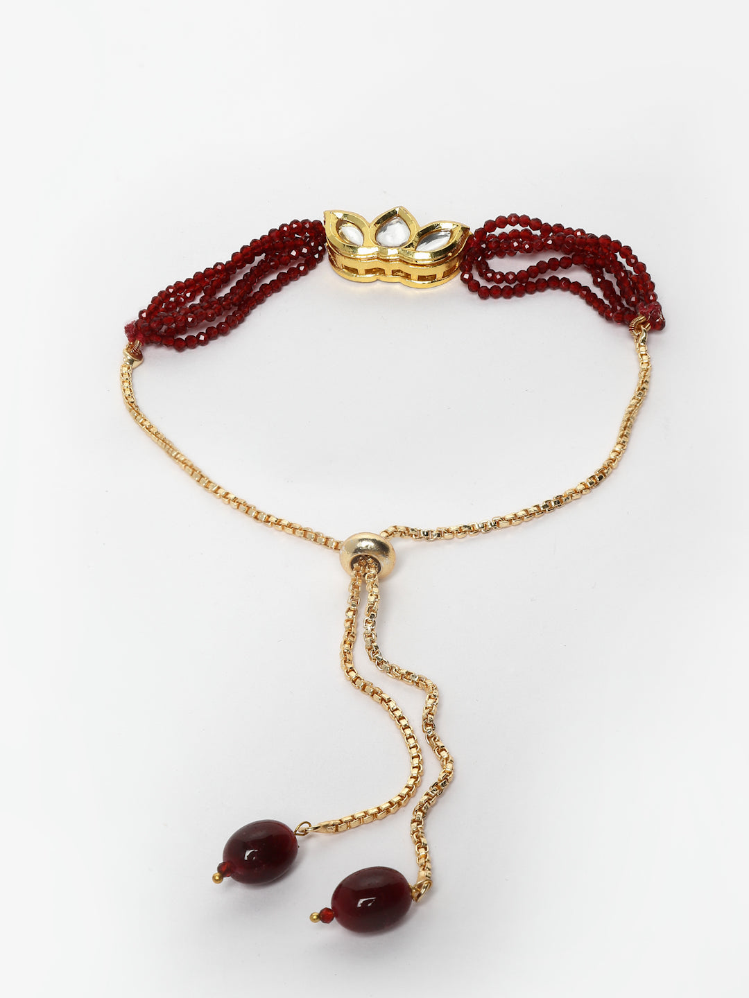 Kamal Bracelet With Red Hydro Work Is Of Excelance.; Category Of Jewellery Is Hand Jewellery; Sub Category Is Bracelets; Ideal For Women; Color Is Red, Gold, White Cream; Gemstones Used - Kundan, Pearls, Natural Stones, Faux Ruby; Plating Is Gold-Plated; Base Metal Is Alloy; Other Material Used - Adjustable Chain; Size Is Freesize; Adjustable - Yes; Weight Is 12 Gms; Mesaurements - Width Of Bracelet = 1.3 Cm; Diameter Of Bracelet =6.03 Cm; Circumference Of Bracelet = 18.95 Cm; Adjustable - Yes; Content 1 Bracelet