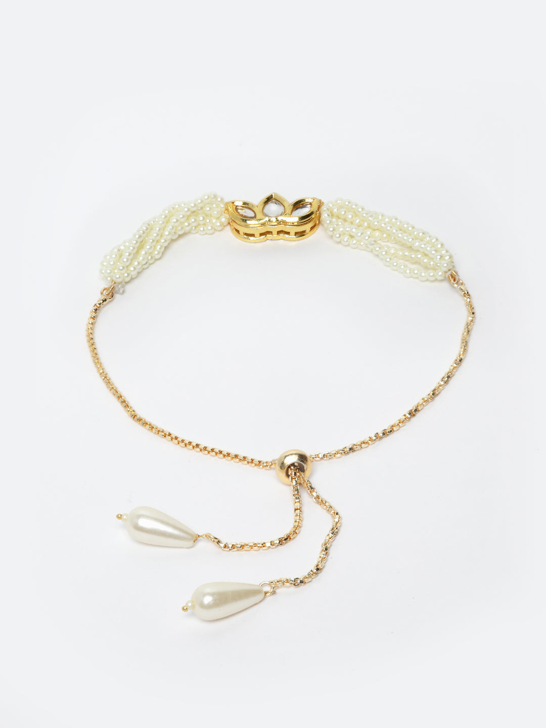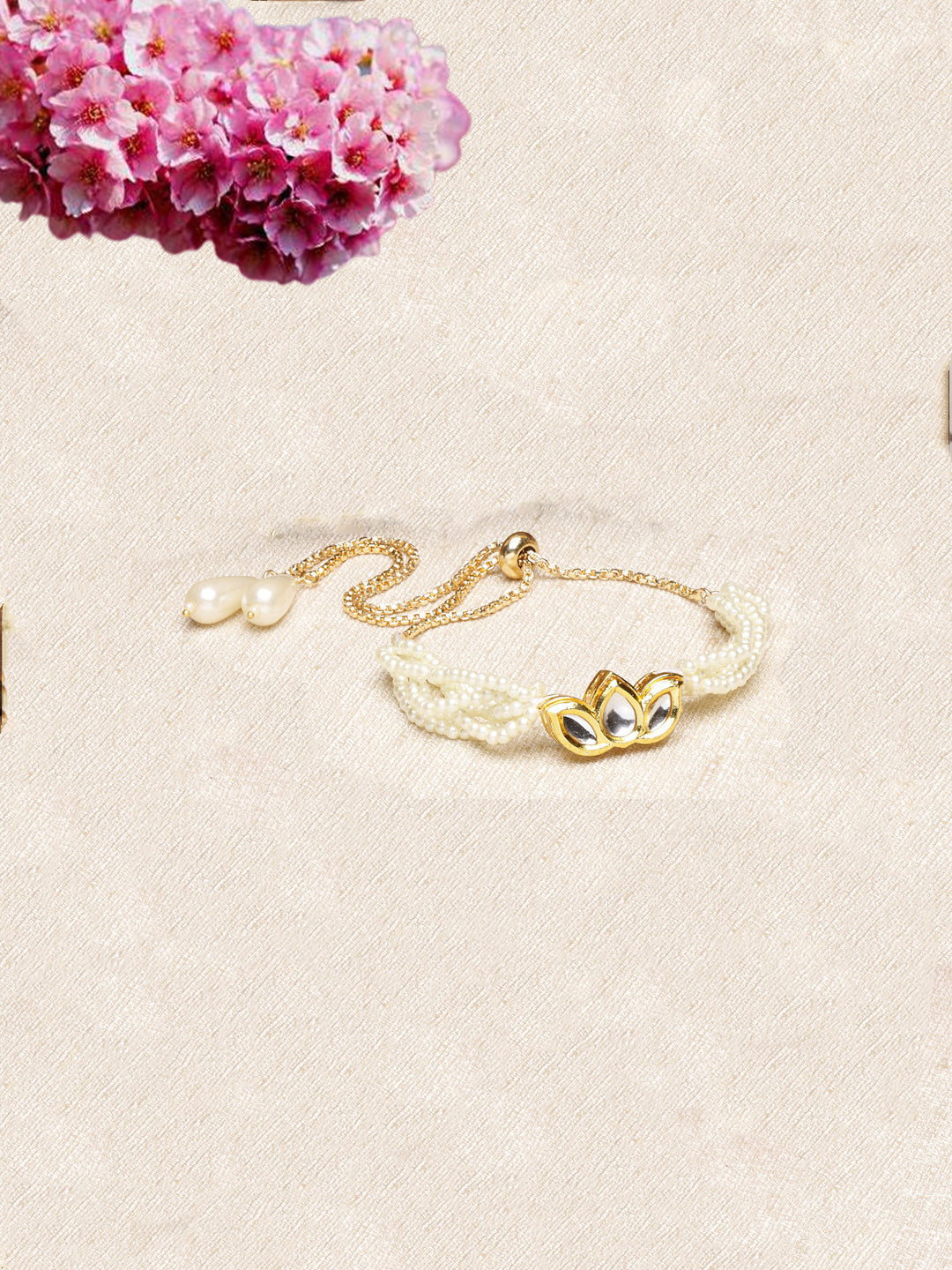 Pearl And Kamal Bracelet To Give U Elegance Of All Times.; Category Of Jewellery Is Hand Jewellery; Sub Category Is Bracelets; Ideal For Women; Color Is Gold, White Cream; Gemstones Used - Kundan, Pearls, Natural Stones; Plating Is Gold-Plated; Base Metal Is Alloy; Other Material Used - Adjustable Chain; Size Is Freesize; Adjustable - Yes; Weight Is 9 Gms; Mesaurements - Width Of Bracelet = 1.3 Cm; Diameter Of Bracelet =6.03 Cm; Circumference Of Bracelet = 18.95 Cm; Adjustable - Yes; Content 1 Bracelet