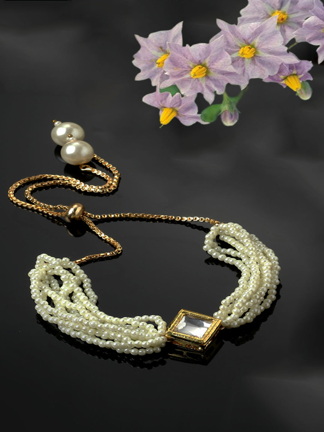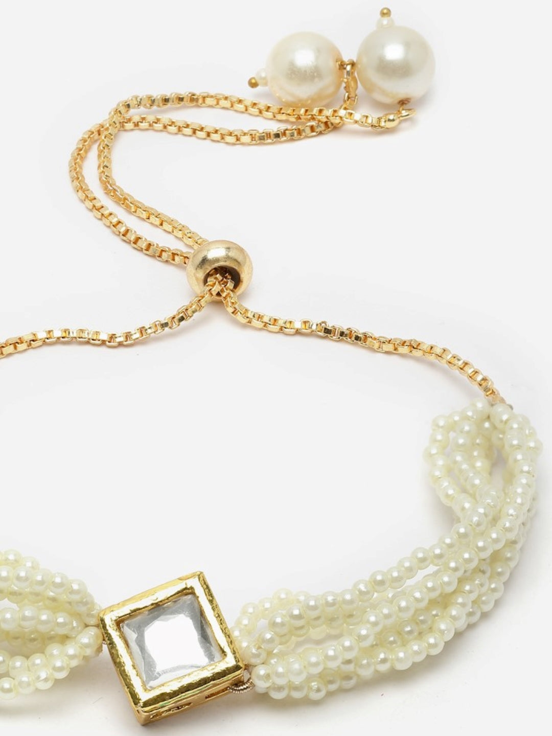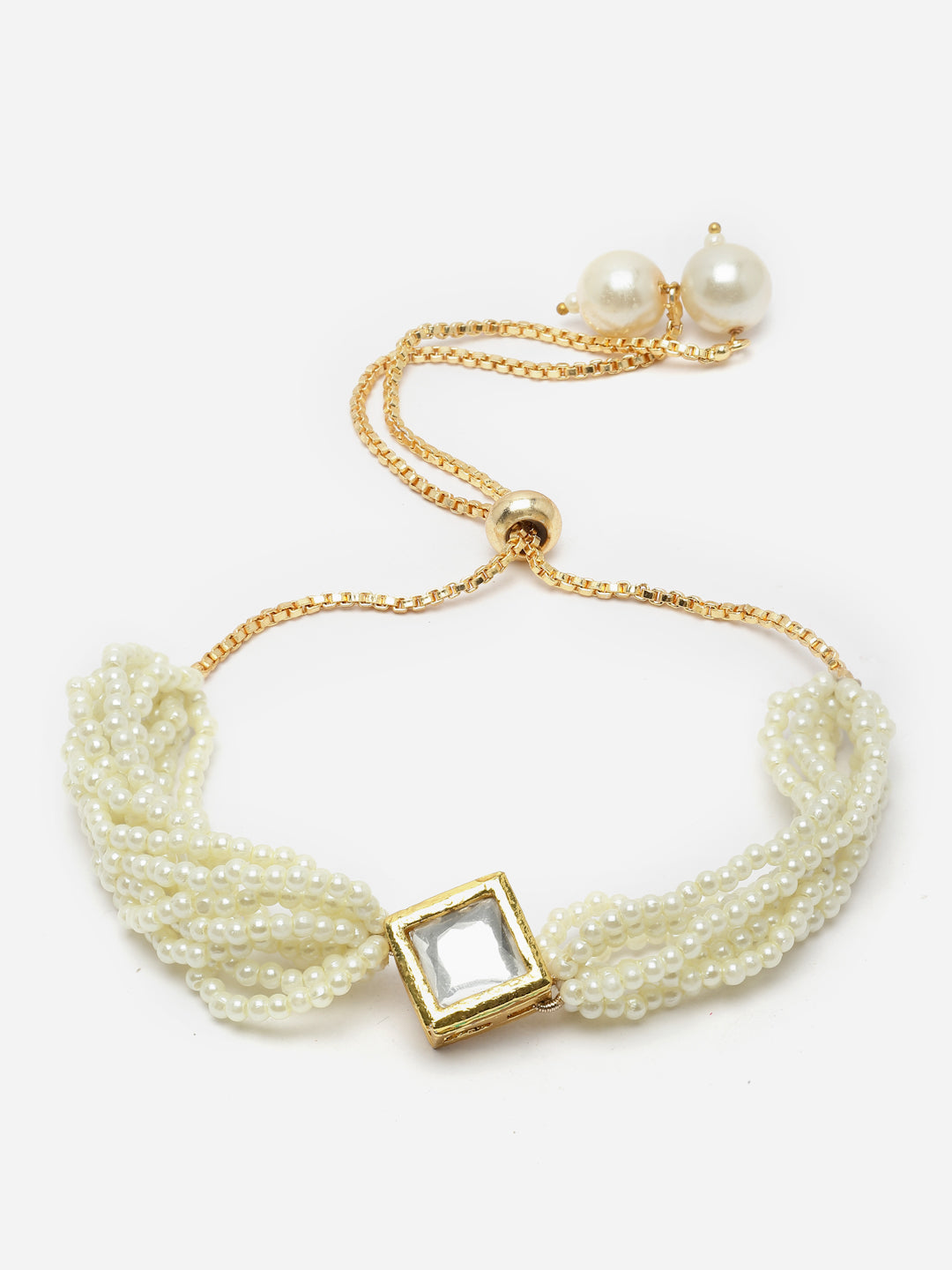 Sqaure Kundan Simple Bracelet; Category Of Jewellery Is Hand Jewellery; Sub Category Is Bracelets; Ideal For Women; Color Is Gold, White, Cream; Gemstones Used - Kundan, Pearls, Natural Stones; Plating Is Gold-Plated; Base Metal Is Alloy; Other Material Used - Adjustable Chain; Size Is Freesize; Adjustable - Yes; Weight Is 13 Gms; Mesaurements - Width Of Bracelet = 1.6 Cm; Diameter Of Bracelet =6.03 Cm; Circumference Of Bracelet = 18.95 Cm; Adjustable - Yes; Content 1 Bracelet