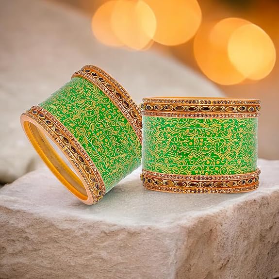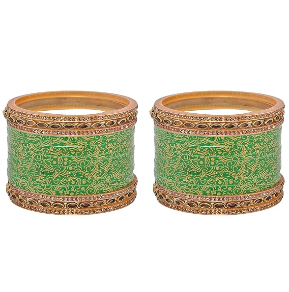 Bridal Bangle Set Wedding Punjabi Chuda Designer Chura Cz Stone With Kundan Stone Green Color Small Size Choora