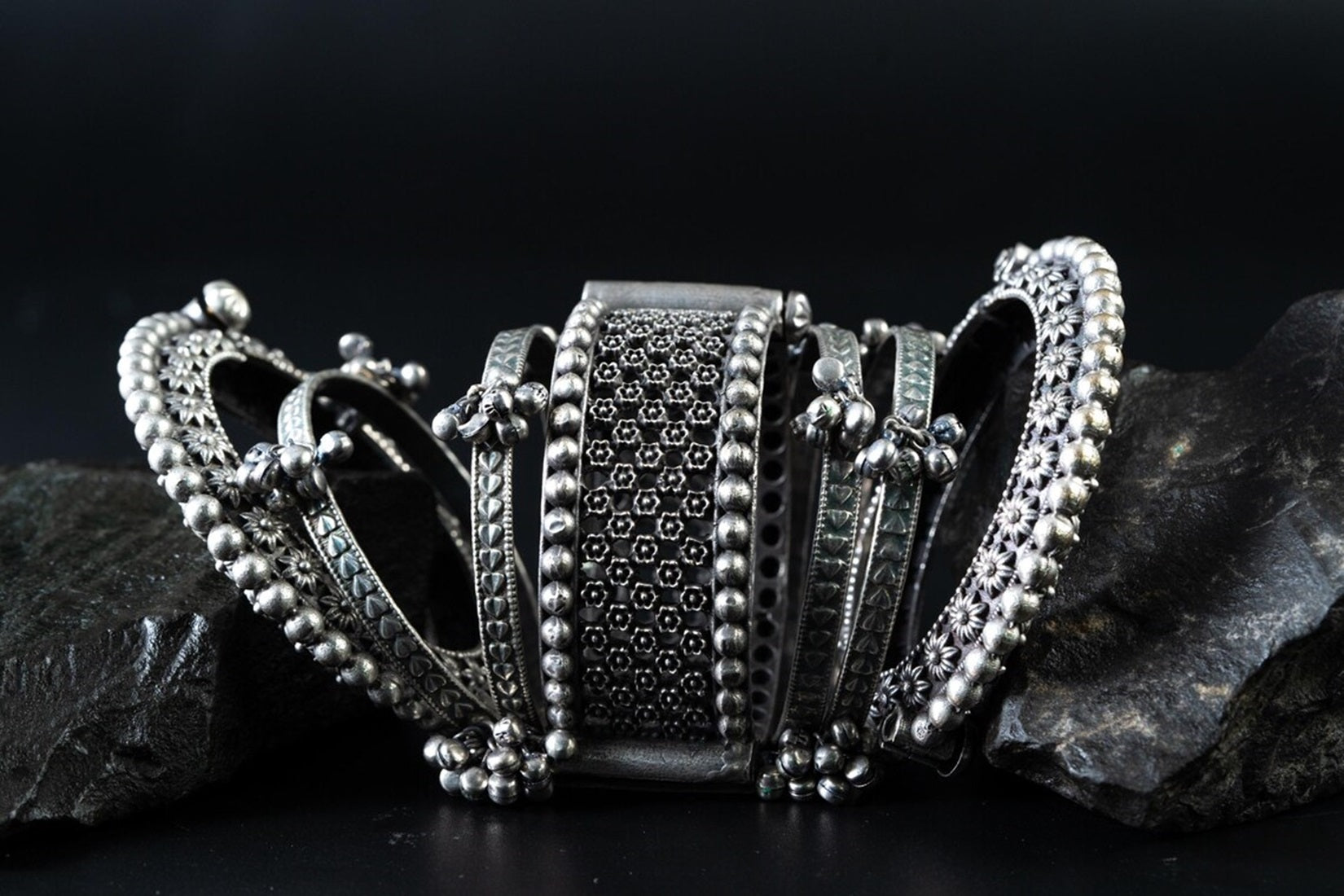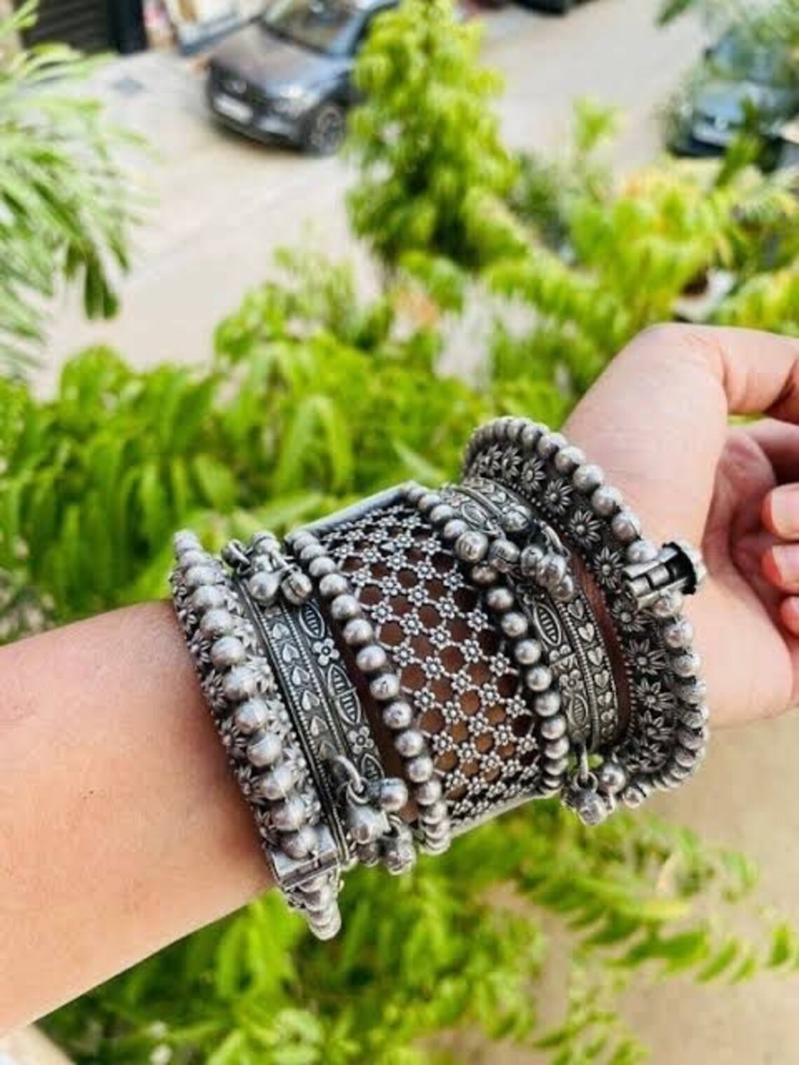 Bangles Set Silver Plated Hand Kada Bracelet Antique Silver Look Openable Kada Broad Bracelet Ghunghroo Bangle Gifts Wedding Hand Bangles
