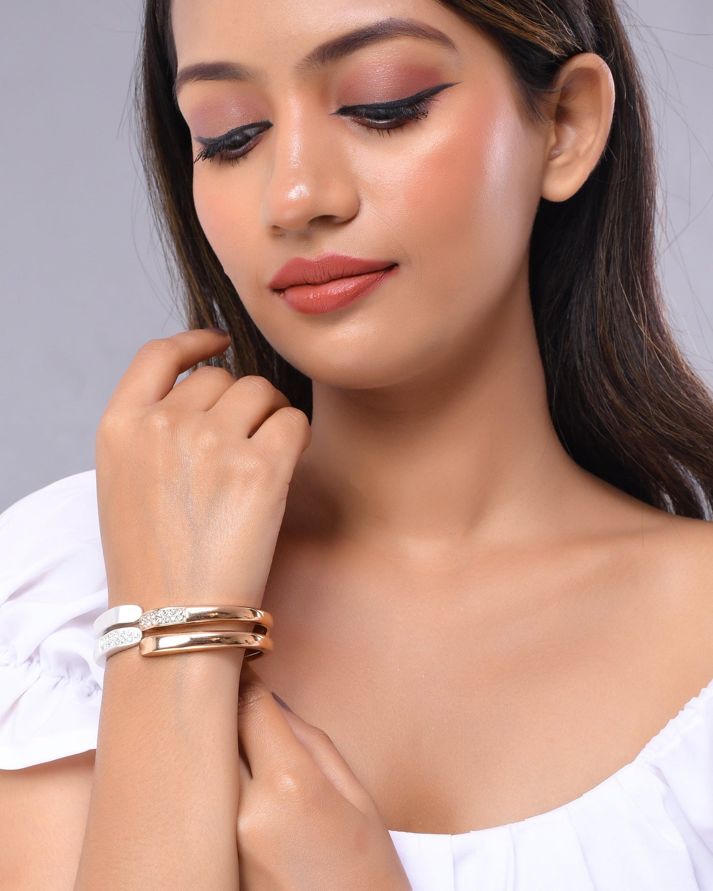This Product Description Showcases The Voj Women Stainless Steel Gold And Silver Plated Diamond Bracelet. Crafted With High-Quality Stainless Steel, This Bracelet Exudes Elegance And Sophistication. The Gold And Silver Plating Adds A Touch Of Glamour, Making It A Versatile Accessory For Any Occasion. The Bracelet Features A Stunning Diamond Accent, Adding A Subtle Sparkle To Your Wrist. With Its Durable Construction And Timeless Design, This Bracelet Is A Must-Have Addition To Any Jewelry Collection.