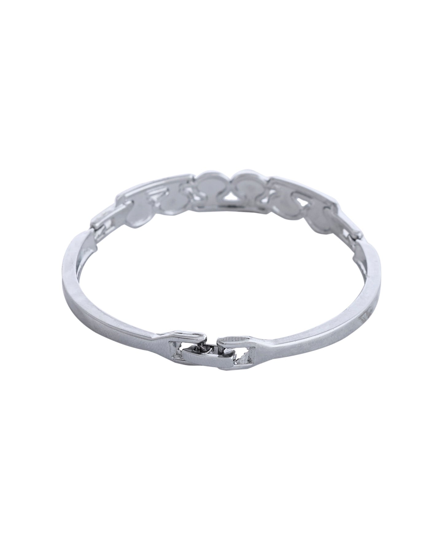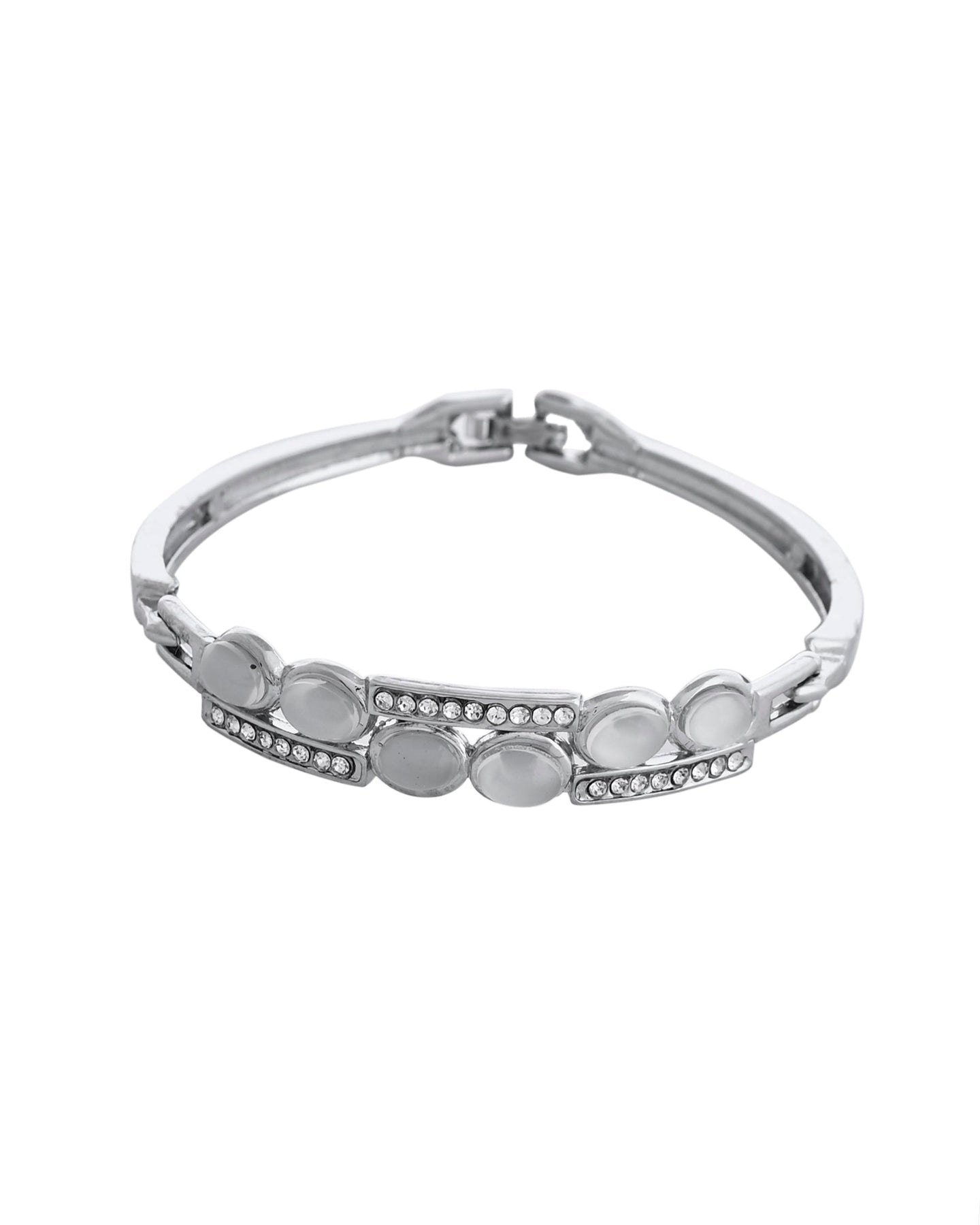 This Silver Plated Stone Studded Kada Bracelet Exudes Timeless Elegance And Sophistication. Featuring Shimmering Stones Set In A Sleek Silver-Plated Design, It Offers A Bold Yet Refined Look. Ideal For Both Casual And Formal Occasions, This Bracelet Adds A Touch Of Luxury And Style To Any Outfit, Making It A Must-Have Accessory For Those Who Appreciate Classic And Contemporary Fashion.