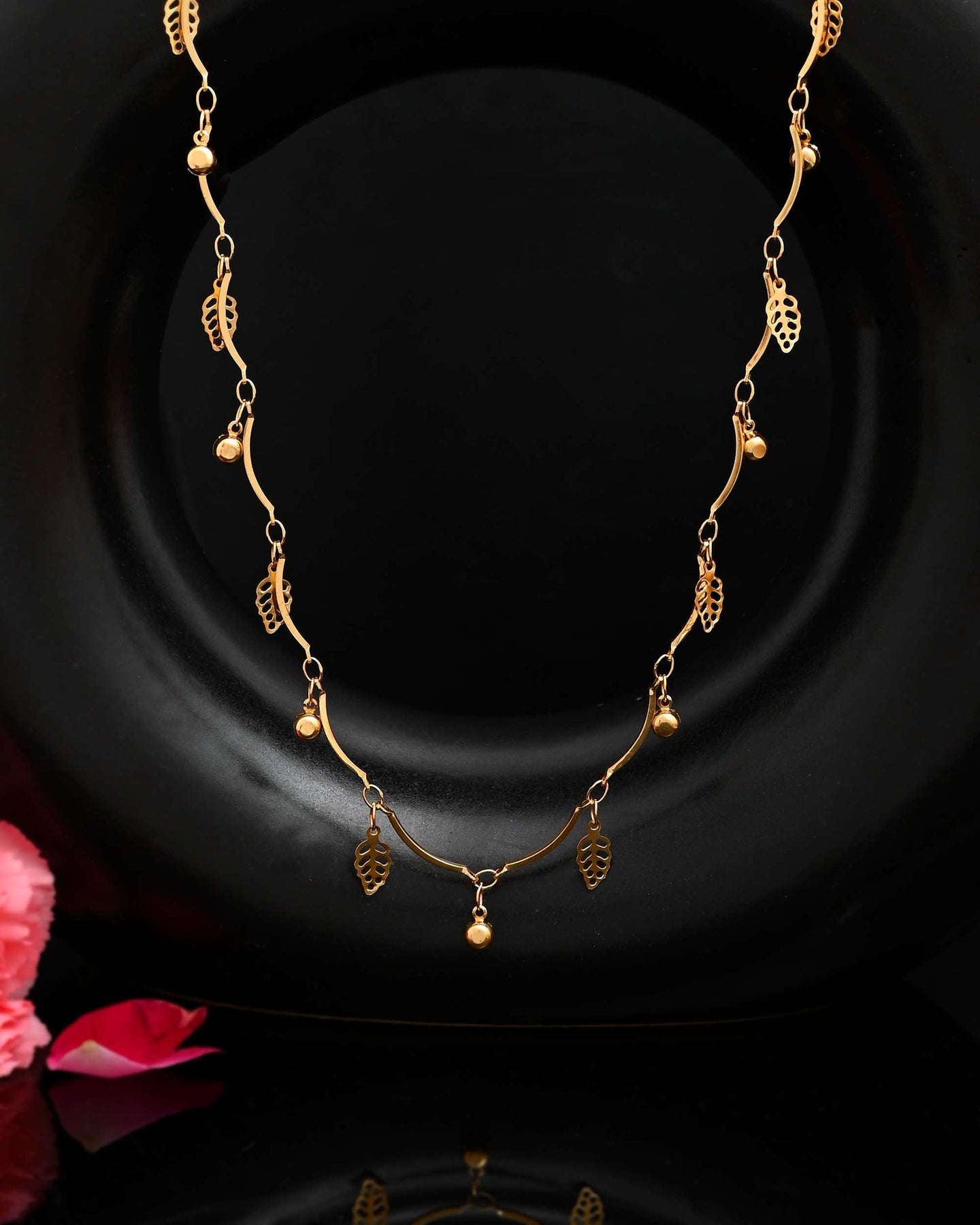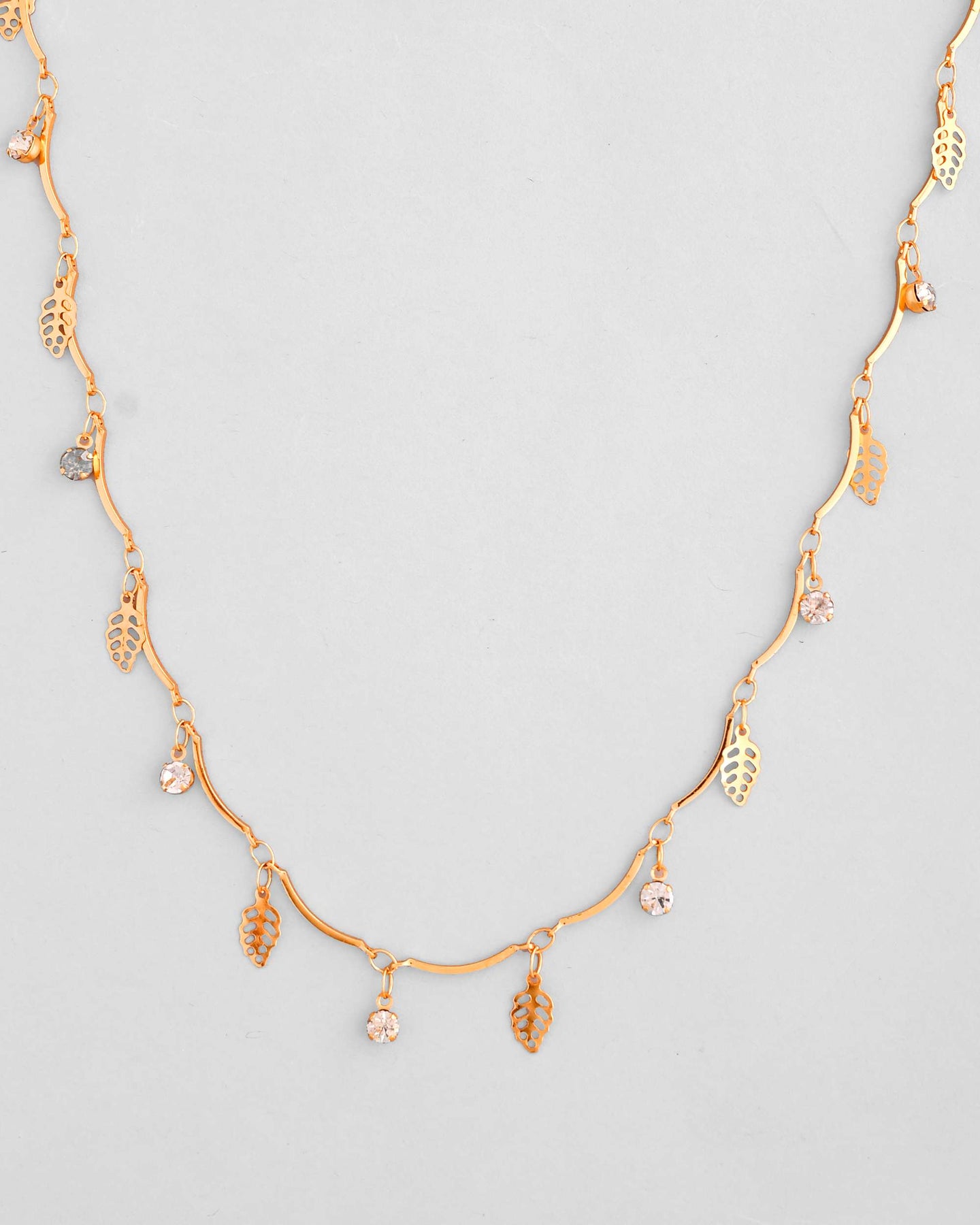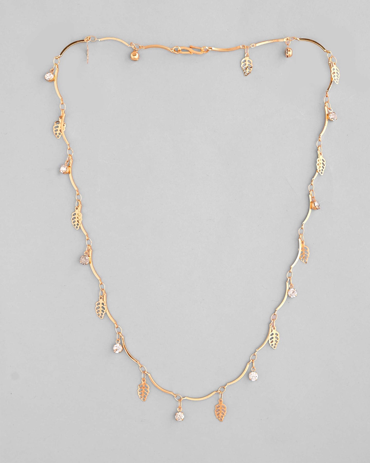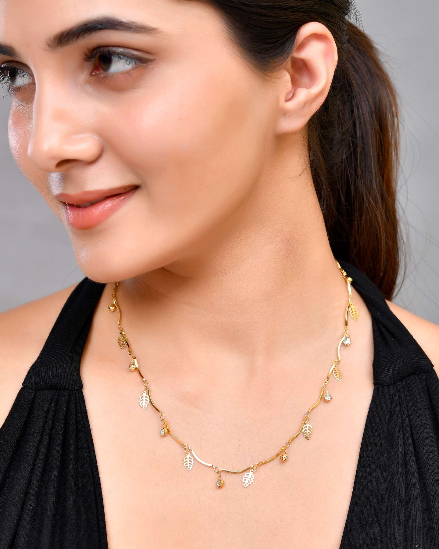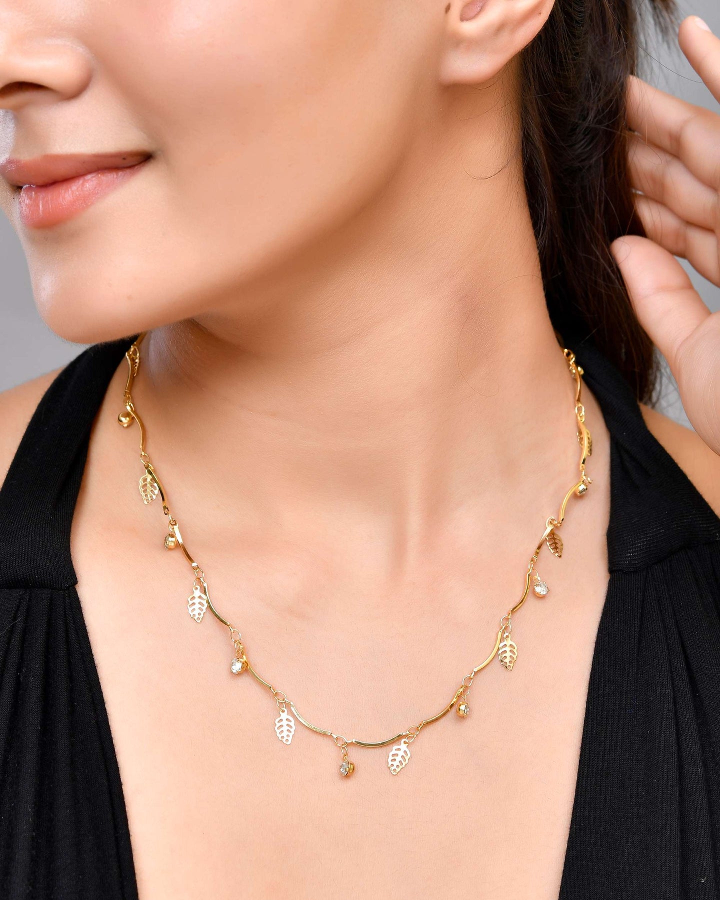 Make a statement with our gold-plated designer chain for women, adorned with stunning AD stones and a charming leaf motif. This exquisite piece combines elegance and artistry, featuring intricate details that catch the light beautifully. Perfect for adding a touch of glamour to any outfit, it’s ideal for both casual and formal occasions. Elevate your jewelry collection with this unique and stylish accessory!
