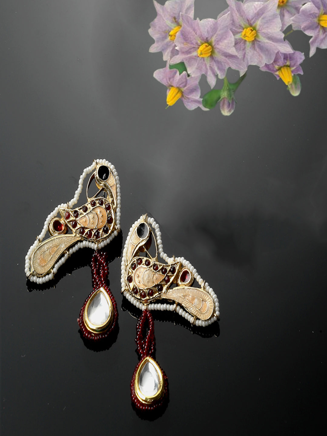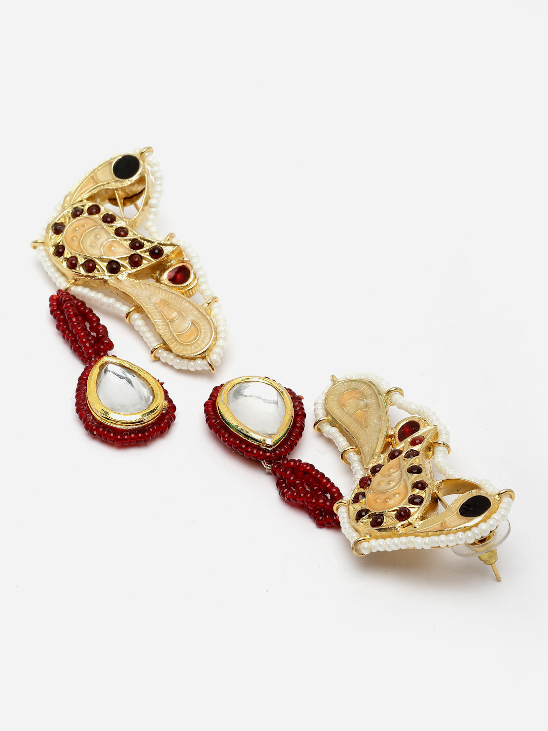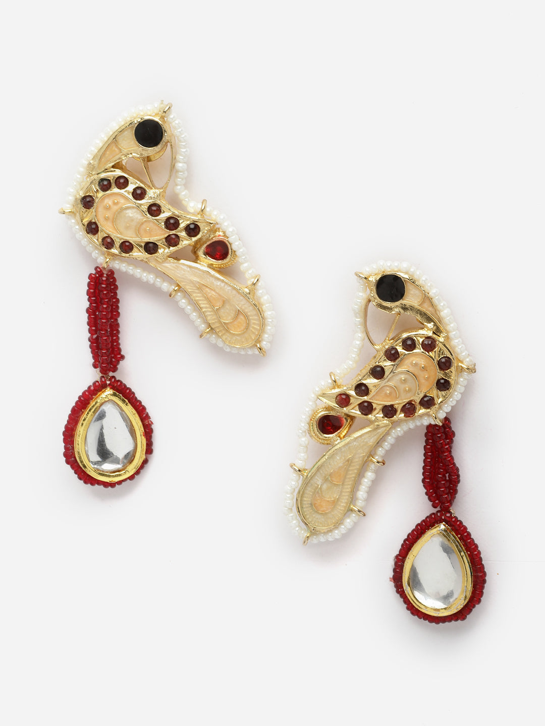 Red Touched Paecock Earring; Category Of Jewellery Is Earring; Sub Category Is Drop; Ideal For Women; Color Is Peach, Red, Pink, Black, White Gold; Gemstones Used - Kundan, Pearls, Natural Stones; Plating Is Gold-Plated; Base Metal Is Alloy; Other Material Used - Closure Stopper; Size Is Freesize; Adjustable - No; Weight Is 22 Gms; Mesaurements - Length Of Earring= 7 Cm; Width Of Earring =2.5 Cm; Adjustable - No; Content 1 Pair Earring