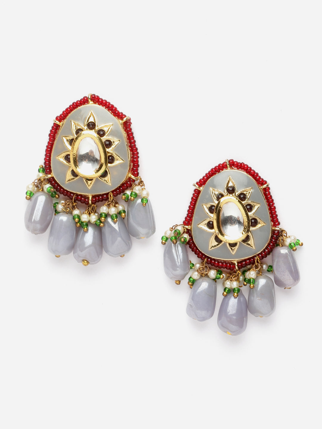 Grey Meenakari With Red Gheri.... Stud Earring; Category Of Jewellery Is Earring; Sub Category Is Drop; Ideal For Women; Color Is Grey, Red, Green, Gold, White; Gemstones Used - Kundan, Pearls, Natural Stones; Plating Is Gold-Plated; Base Metal Is Alloy; Other Material Used - Closure Stopper; Size Is Freesize; Adjustable - No; Weight Is 30 Gms; Mesaurements - Length Of Earring= 5.2 Cm; Width Of Earring =3.5 Cm; Adjustable - No; Content 1 Pair Earring