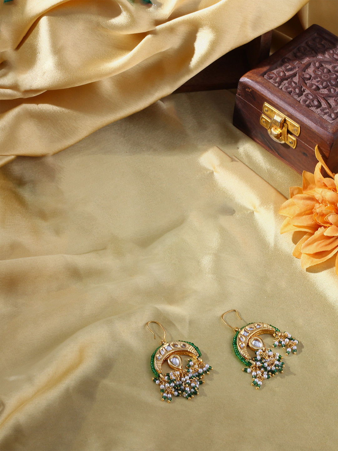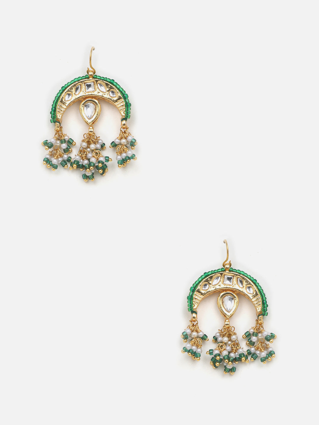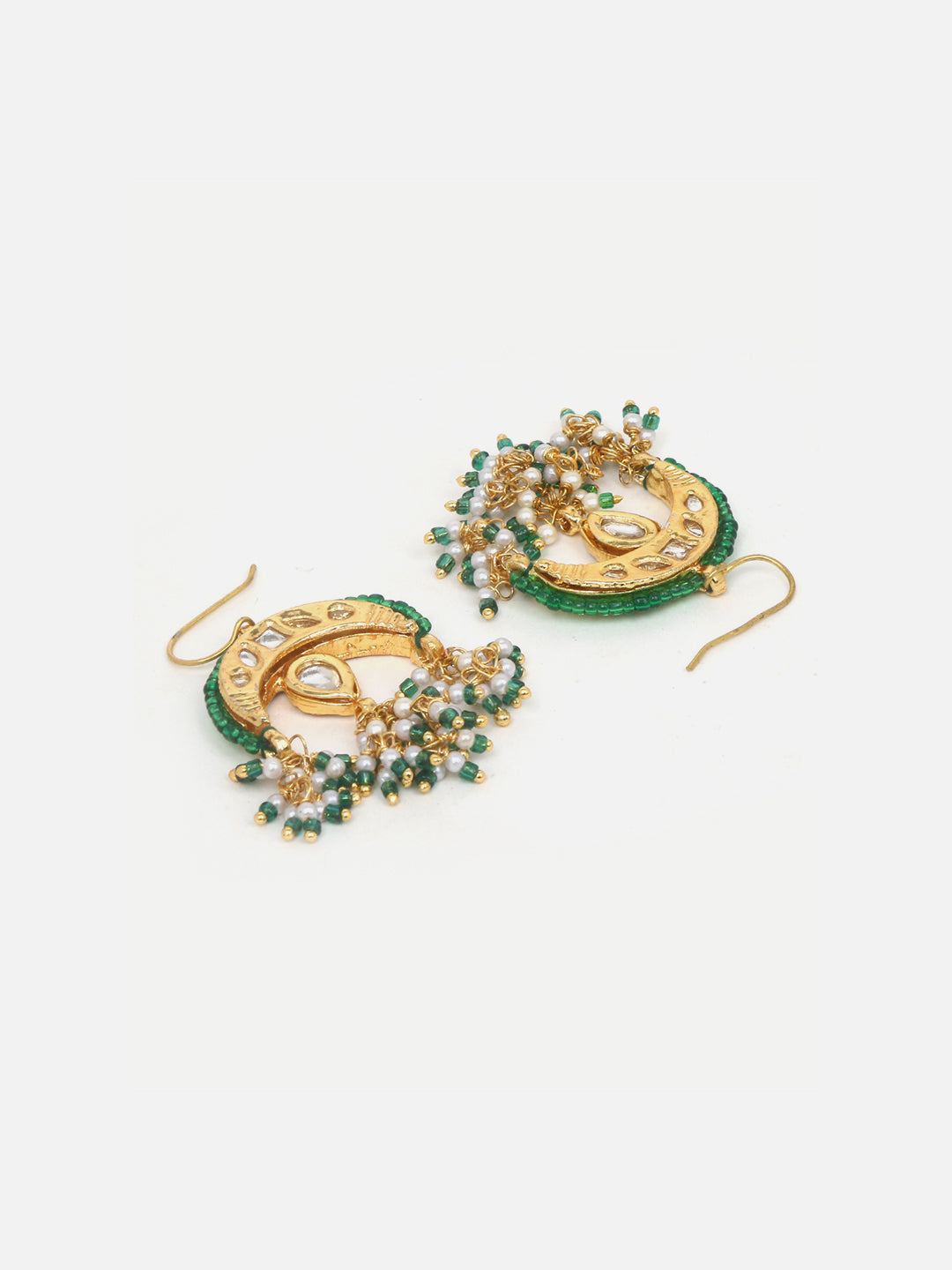 Green And Gold Chand Earring Trending; Category Of Jewellery Is Earring; Sub Category Is Drop; Ideal For Women; Color Is Green, Cream, Gold, White; Gemstones Used - Kundan, Pearls, Natural Stones; Plating Is Gold-Plated; Base Metal Is Alloy; Other Material Used - Hook; Size Is Freesize; Adjustable - No; Weight Is 14 Gms; Mesaurements - Length Of Earring= 5.2 Cm; Width Of Earring =3.5 Cm; Adjustable - No; Content 1 Pair Earring