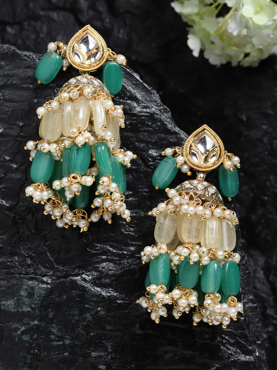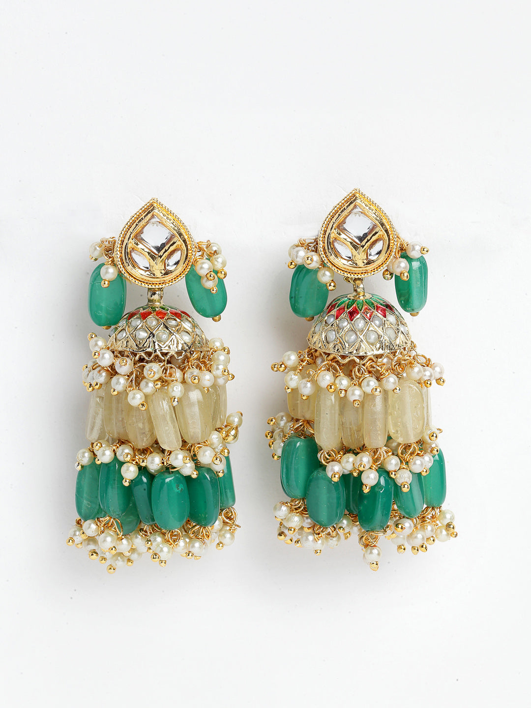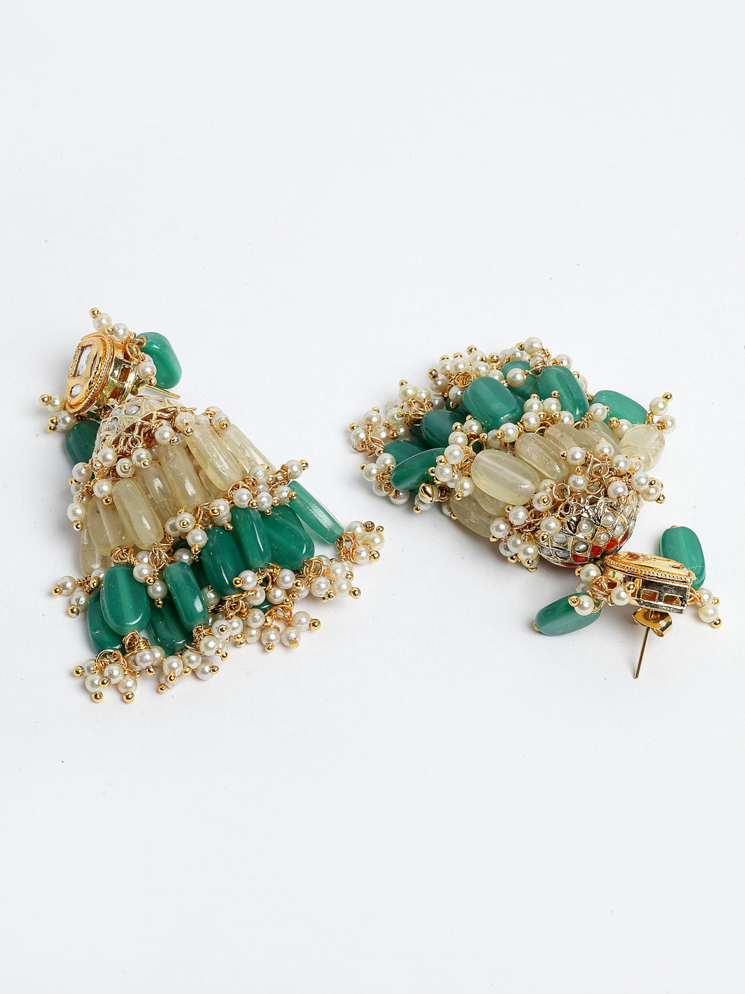 Handcrafted Earring With Tinch Of Yellow Sapphire And Green Sapphire Along With Handmade Pearol Jhumki Is What We Need To Gflaunt This Festive Season. Super Classy And Elegant Earring Is What We Need To Flaunt; Category Of Jewellery Is Earring; Sub Category Is Jhumka; Ideal For Women; Color Is Green, Yellow, White, Gold; Gemstones Used - Kundan, Pearls, Natural Stones; Plating Is Gold-Plated; Base Metal Is Alloy; Other Material Used - Closure Stopper; Size Is Freesize; Adjustable - No; Weight Is 61 Gms; Mesaurements - Length Of Earring= 7 Cm; Width Of Earring =6 Cm; Adjustable - No; Content 1 Pair Earring