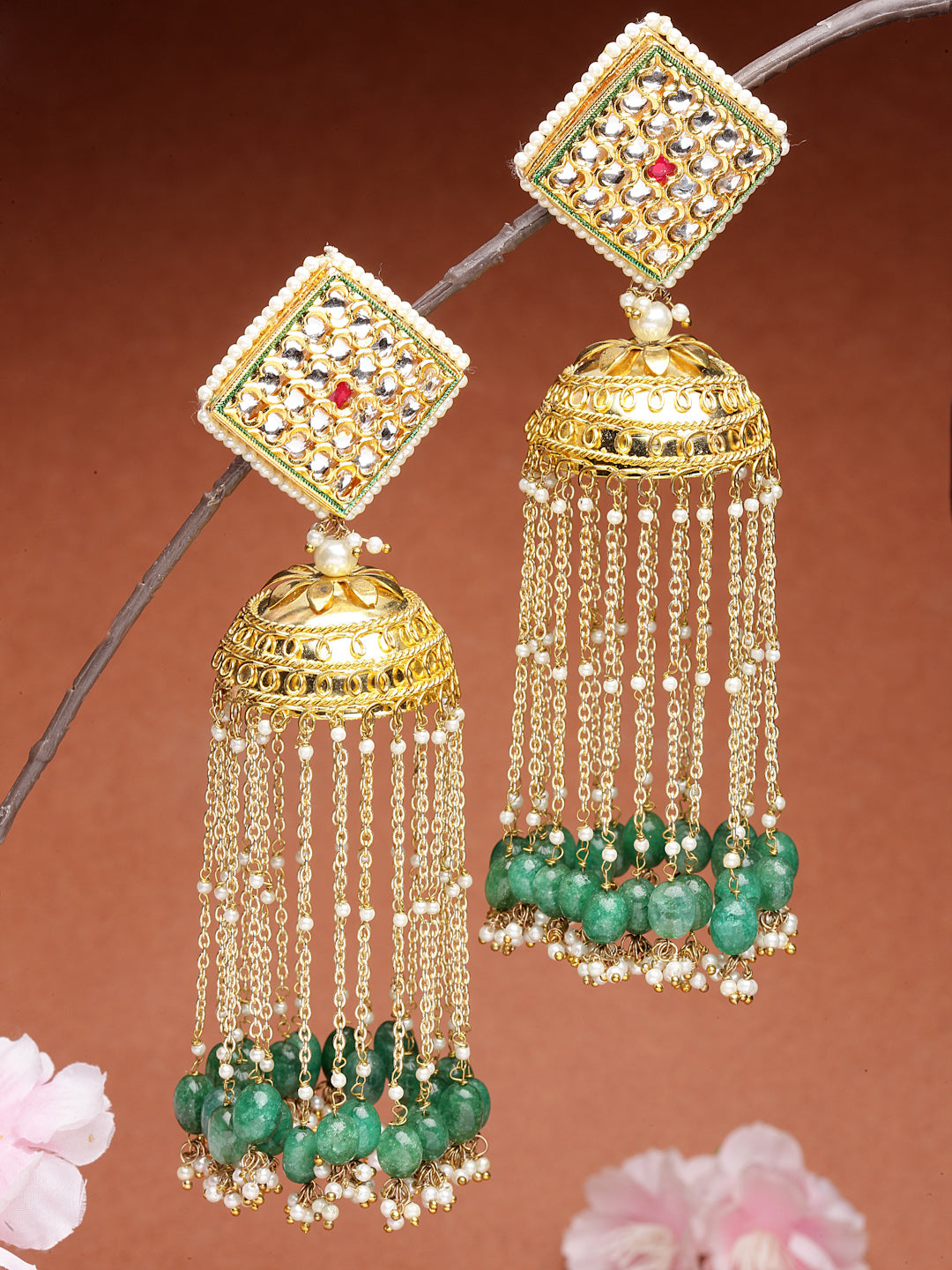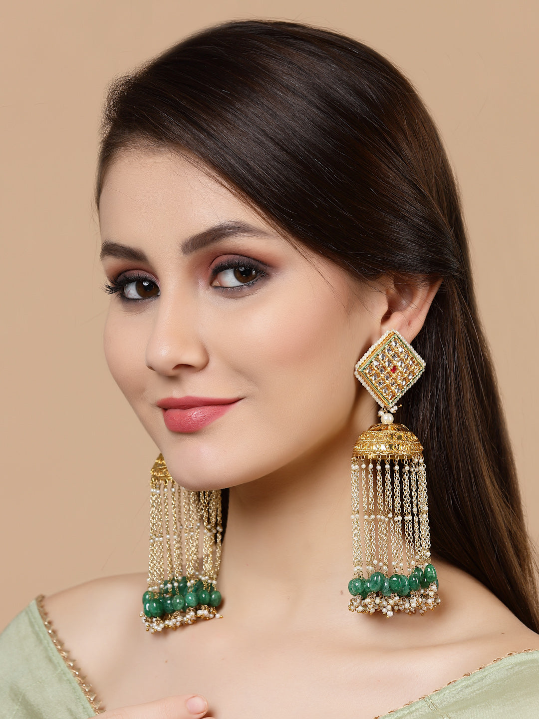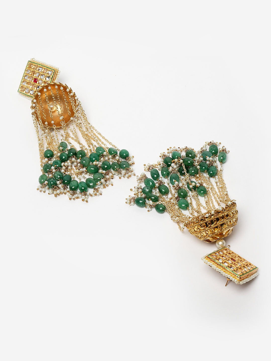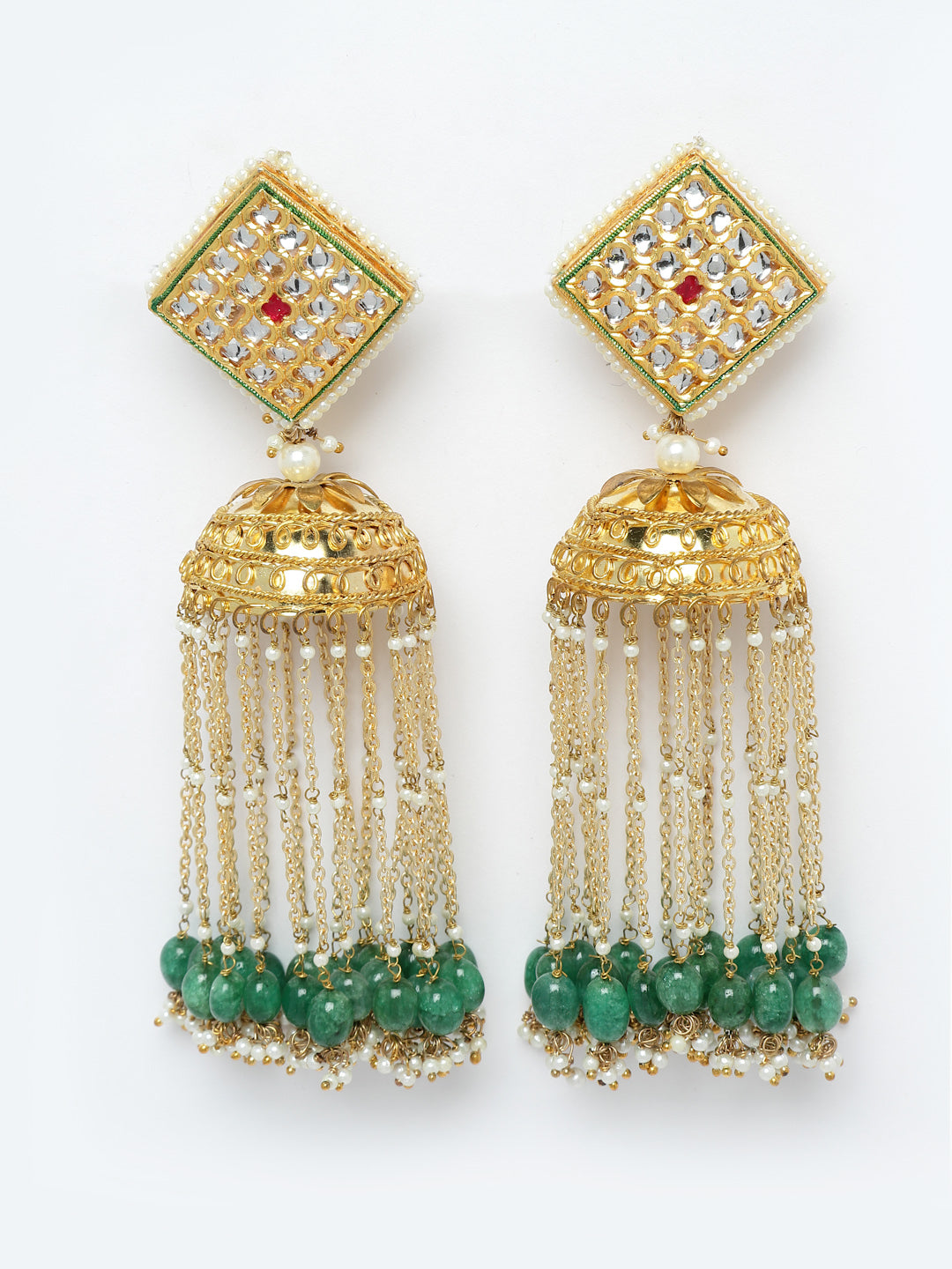 Kundan With Gold Jhumki With Work Of Pearl Looping Is What Makes This Pc Super Cute And Good For Any Mehndi Look.. Ps. We Can Vouch For The Weight Of These.. Super Light It Is.; Category Of Jewellery Is Earring; Sub Category Is Jhumka; Ideal For Women; Color Is Green, Gold, White; Gemstones Used - Kundan, Pearls, Natural Stones, Faux Emerald; Plating Is Gold-Plated; Base Metal Is Alloy; Other Material Used - Closure Stopper And Kanchain; Size Is Freesize; Adjustable - No; Weight Is 93 Gms; Mesaurements - Length Of Earring= 14 Cm; Width Of Earring =5 Cm; Adjustable - No; Content 1 Pair Earring