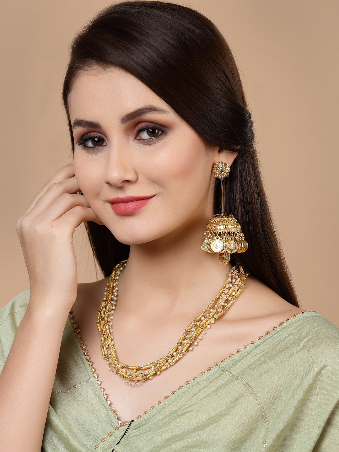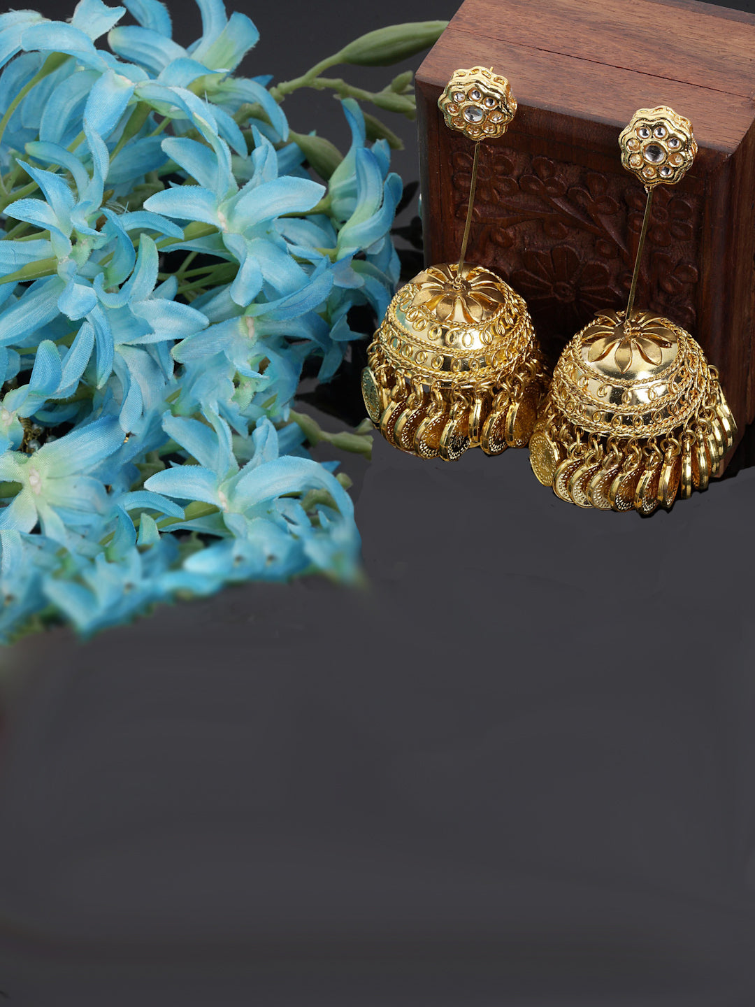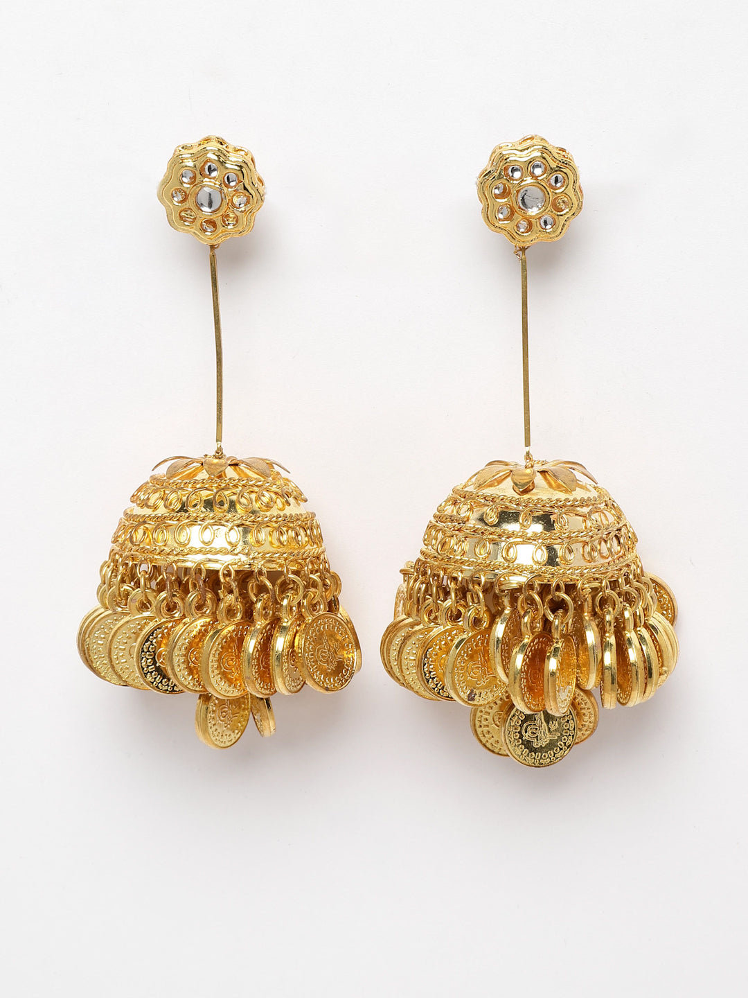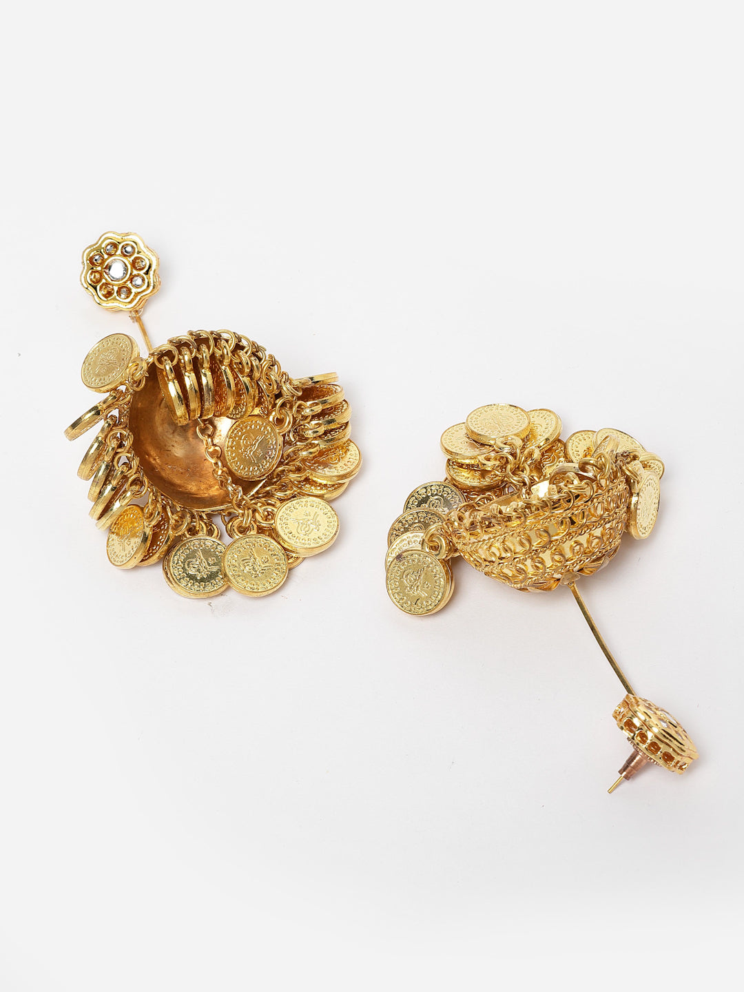 Entire Earring Of Gold With Gold Plating Jhumki And Gold Coin Hanging Boho Look Earring; Category Of Jewellery Is Earring; Sub Category Is Jhumka; Ideal For Women; Color Is Gold, White, Cream; Gemstones Used - Kundan, Natural Stones; Plating Is Gold-Plated; Base Metal Is Alloy; Other Material Used - Closure Stopper And Kanchain; Size Is Freesize; Adjustable - No; Weight Is 50 Gms; Mesaurements - Length Of Earring= 12 Cm; Width Of Earring =4.2 Cm; Adjustable - No; Content 1 Pair Earring