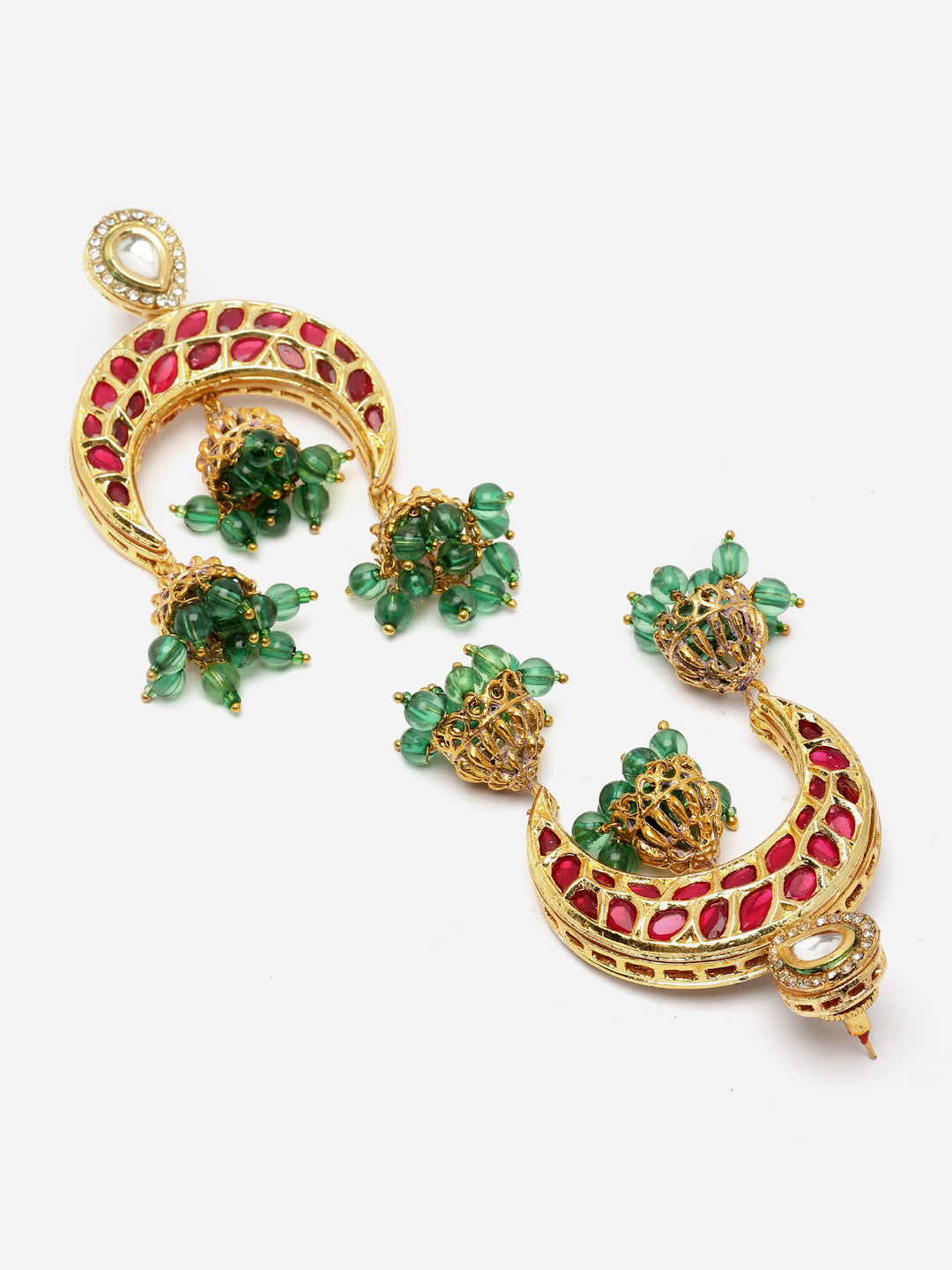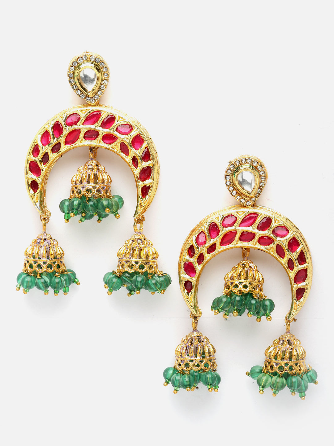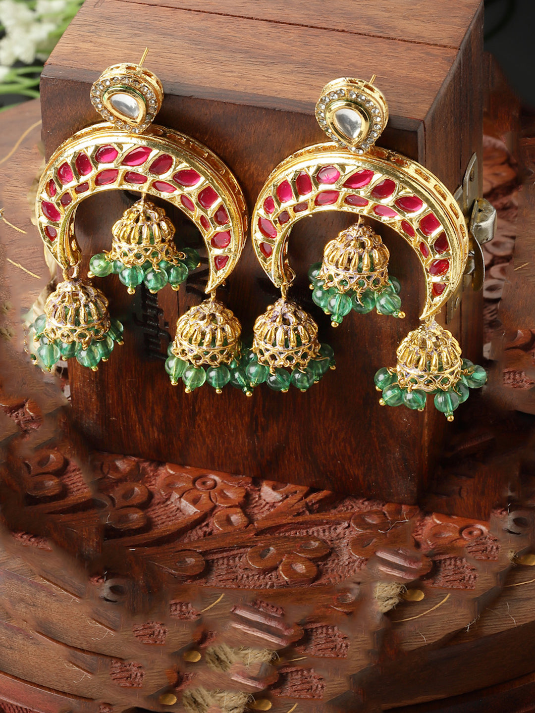 Temple Style Earring With Jhumki Look; Category Of Jewellery Is Earring; Sub Category Is Jhumka; Ideal For Women; Color Is Red, Green, Gold, Silver, White; Gemstones Used - Kundan, American Diamond, Pearls, Natural Stones; Plating Is Gold-Plated; Base Metal Is Alloy; Other Material Used - Closure Stopper; Size Is Freesize; Adjustable - No; Weight Is 50 Gms; Mesaurements - Length Of Earring= 7.2 Cm; Width Of Earring =4 Cm; Adjustable - No; Content 1 Pair Earring