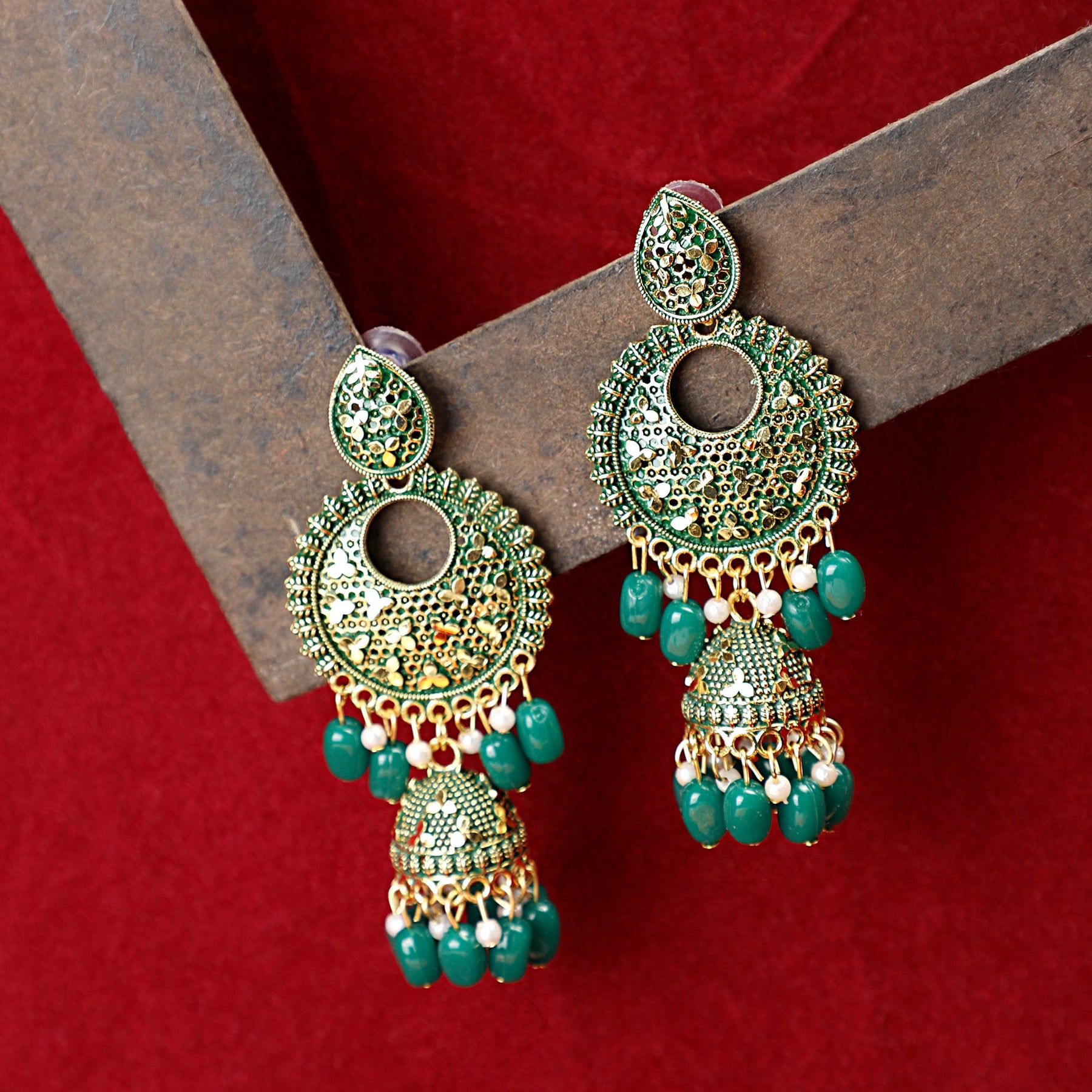 Mode Mania Gold Plated Green Enameled And Pearl Drop Jhumka Earring