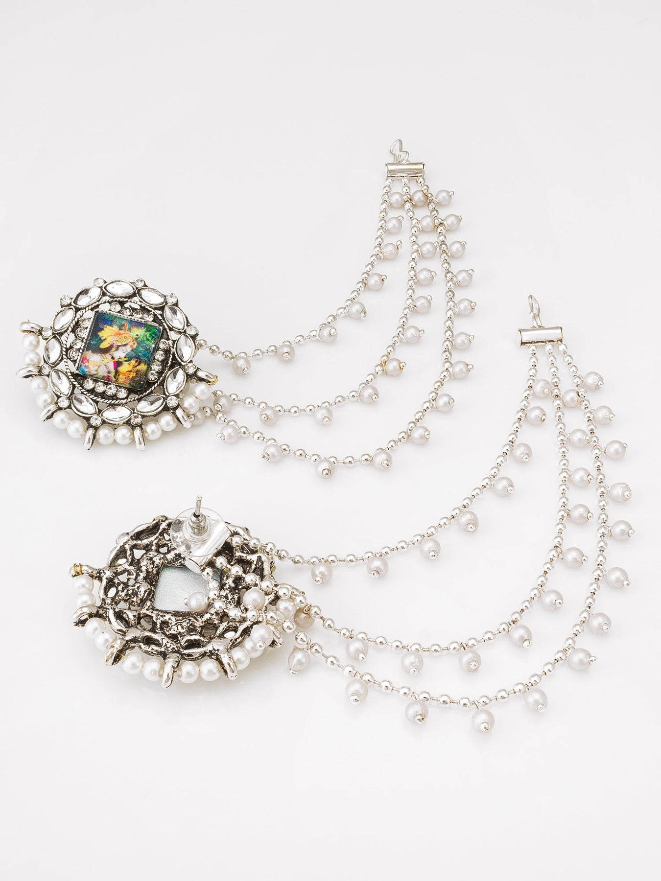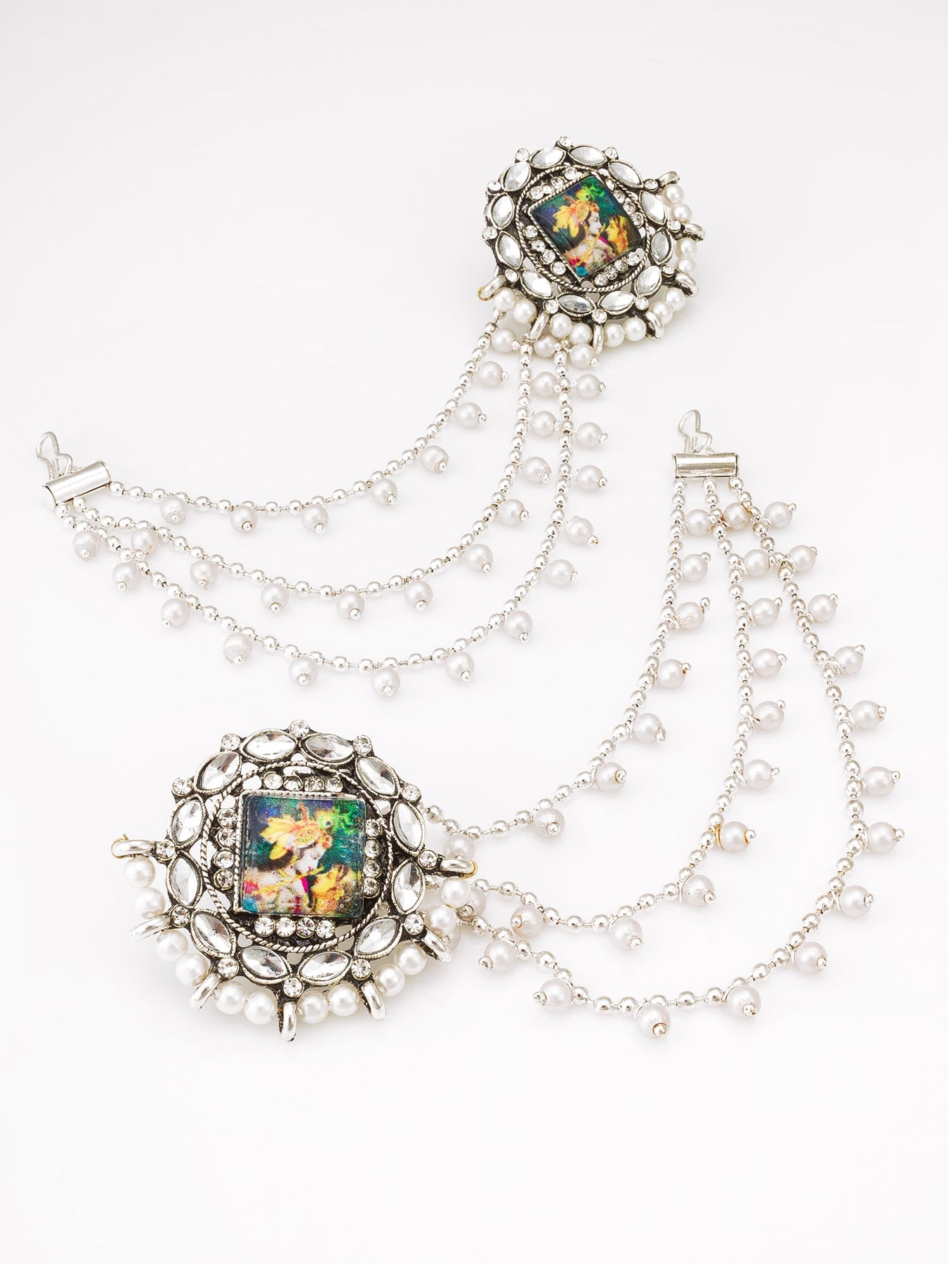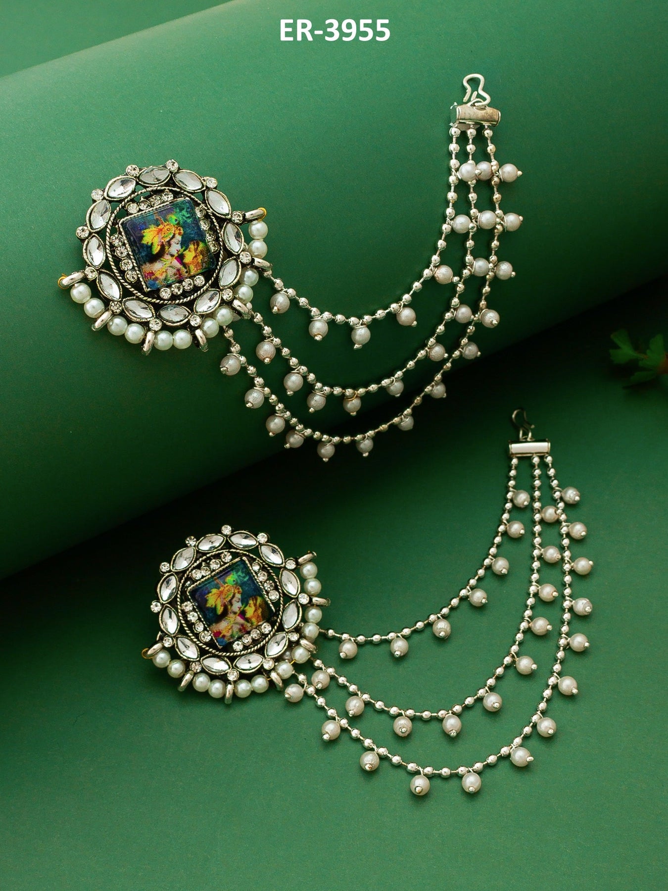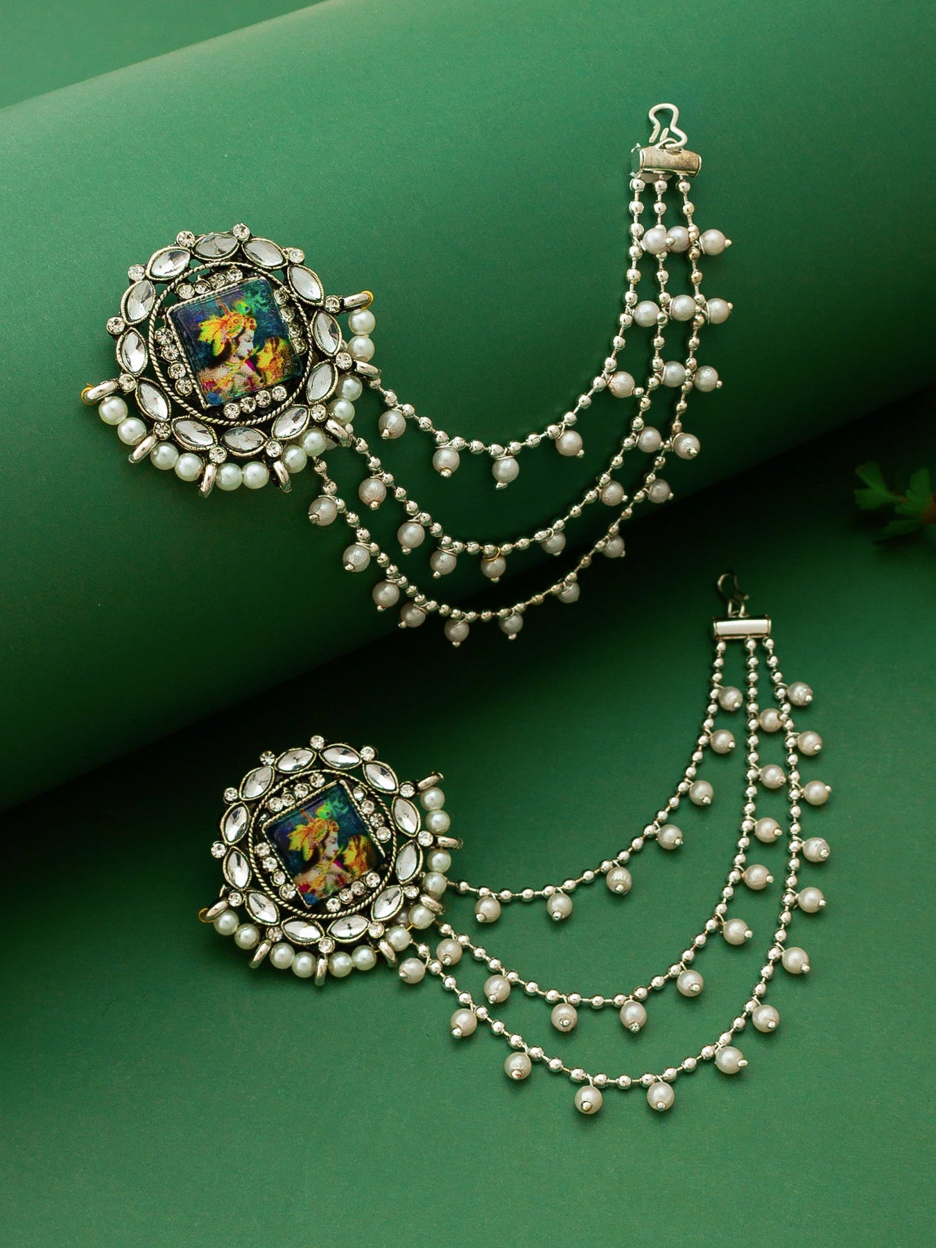 1. Introducing Our Exquisite Radha Krishna Silver Chain Linked Earrings, Featuring Two Pairs Of Earrings Adorned With Elegant Pearls And Sparkling Stones. 2. Crafted With Utmost Precision And Attention To Detail, These Earrings Are A Perfect Blend Of Traditional And Contemporary Design. 3. The Lustrous Pearls Add A Touch Of Sophistication, While The Shimmering Stones Create A Captivating Sparkle. 4. Made With High-Quality Materials, These Earrings Are Not Only Visually Stunning But Also Durable And Long-Lasting. 5. Whether You'Re Attending A Special Occasion Or Simply Want To Elevate Your Everyday Style, These Earrings Are A Must-Have Accessory That Will Effortlessly Enhance Any Outfit.