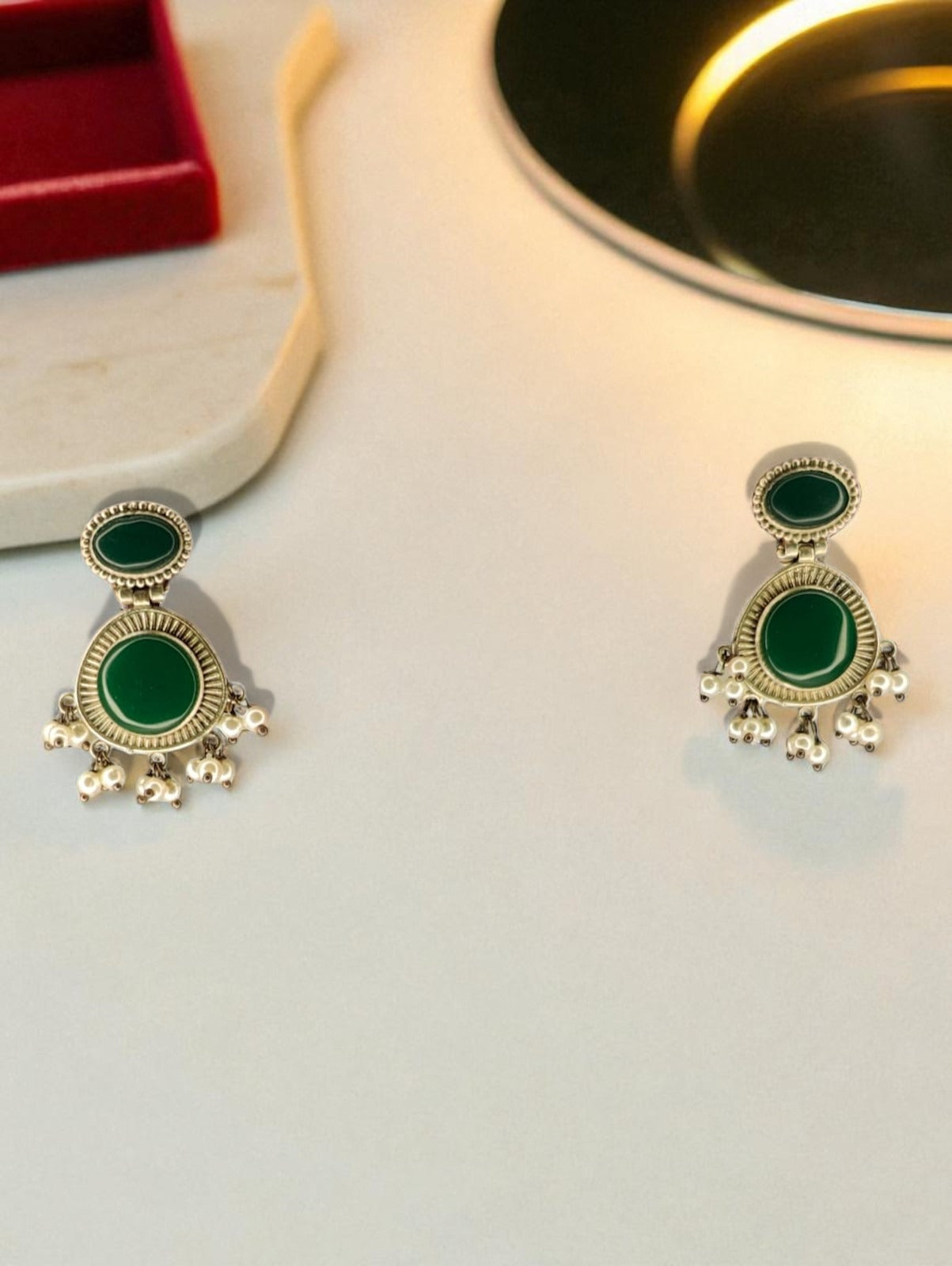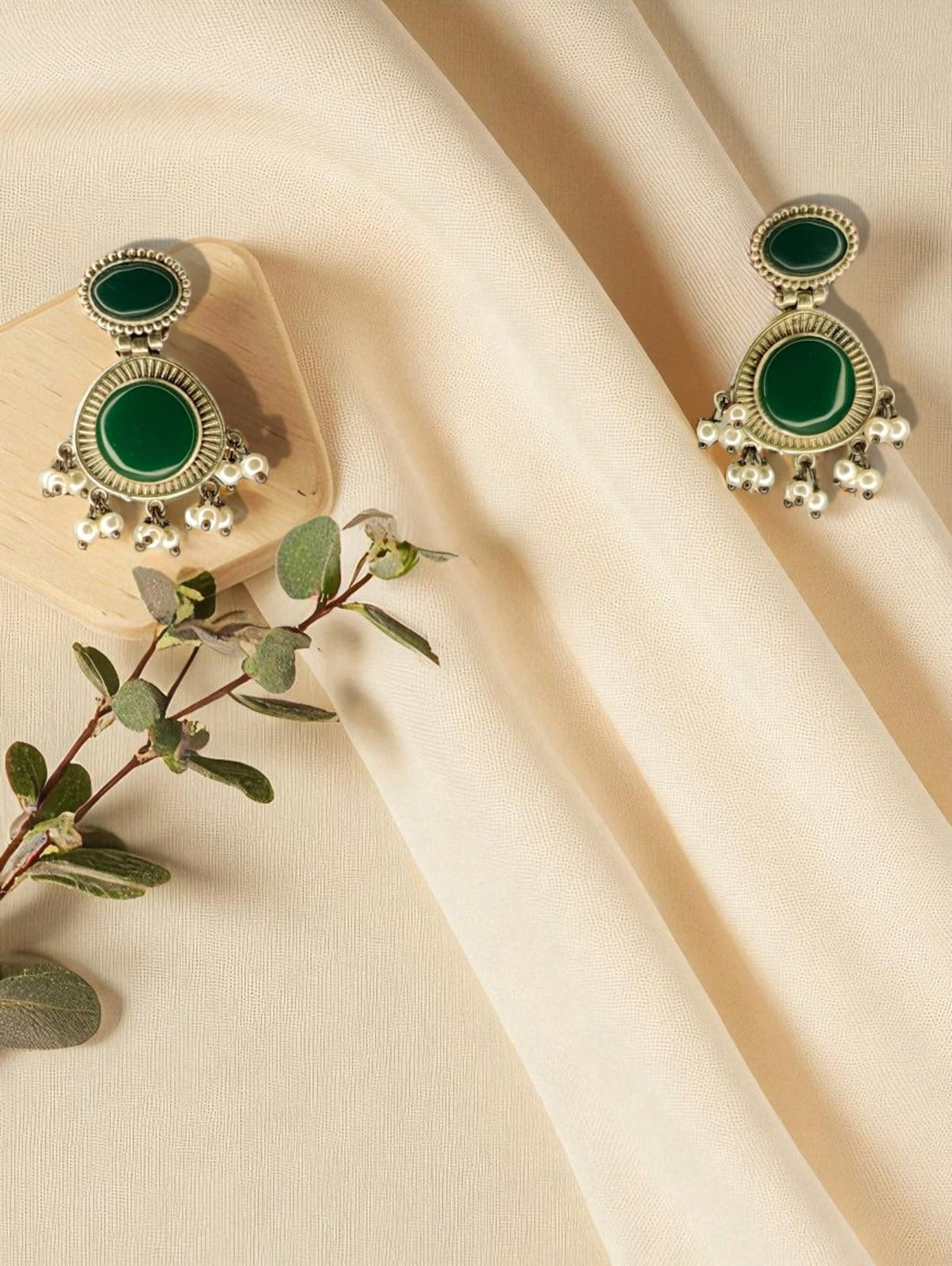 Add A Royal Touch To Your Ethnic Wardrobe With These Emerald Drop Antique Earrings From Golden Glamour. Designed In Oxidized Silver With Deep Emerald Green Stones, The Earrings Feature Charming Pearl-Style Danglers That Enhance Their Traditional Appeal. Lightweight And Elegant, They Are Ideal For Festive Occasions, Weddings, Or As A Thoughtful Gift.