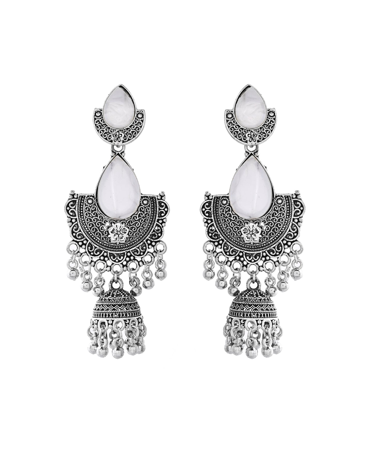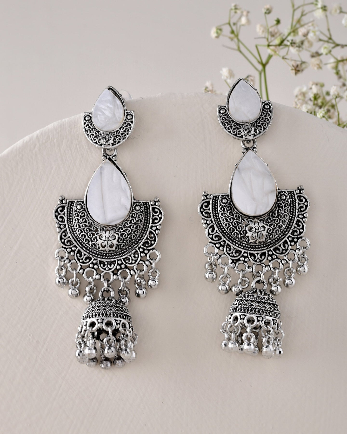 Elevate Your Ethnic Look With These Intricately Designed Oxidized Silver Half-Moon Earrings. Featuring Delicate Filigree Work And A Floral Motif, The Earrings Are Adorned With Small Silver Beads And Jhumka Drops, Adding A Touch Of Elegance And Charm. The Lightweight Design Ensures Comfort While Making A Bold Statement, Perfect For Festive Occasions, Weddings, And Traditional Gatherings.