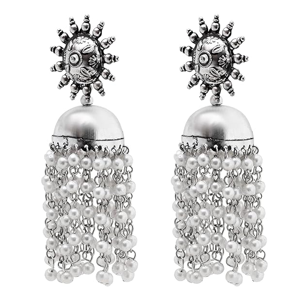 Women's Silver Colour Oxidised Earrings With White Pearl