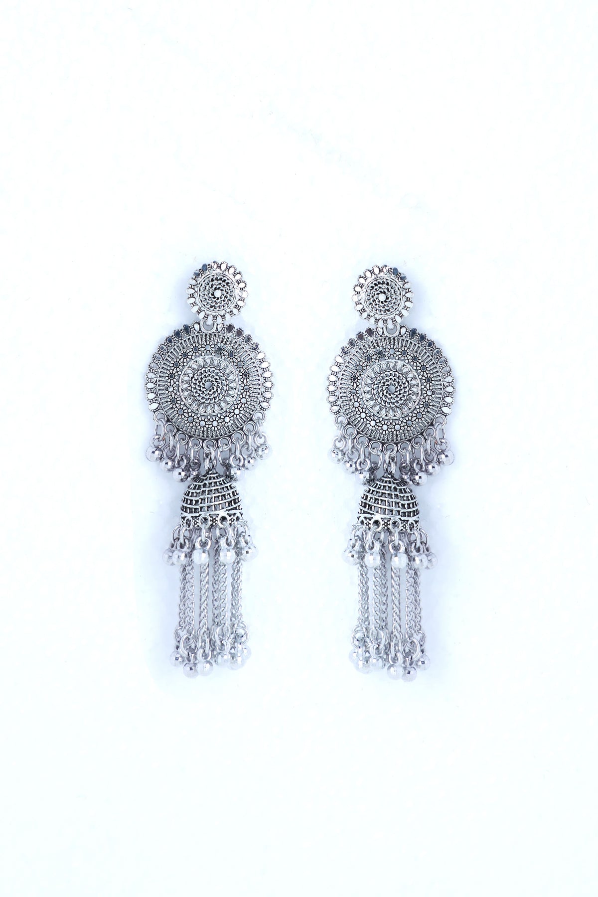 The earrings feature an oxidized silver-plated base adorned with delicate ghungharoo-style embellishments. The oxidized finish adds a vintage touch, while the ghungharoo elements exude a rhythmic and cultural allure. The meticulous detailing creates a captivating design that gracefully sways with every movement, adding a subtle musicality to your ensemble.
