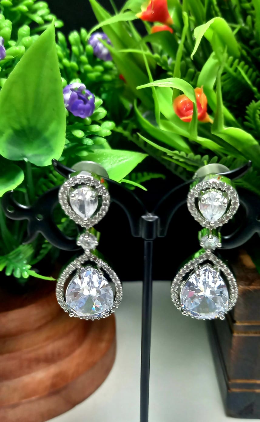 White Colour Indian Jewellery American Diamond White Polish Earrings Danglers With Shiny Cut Stone