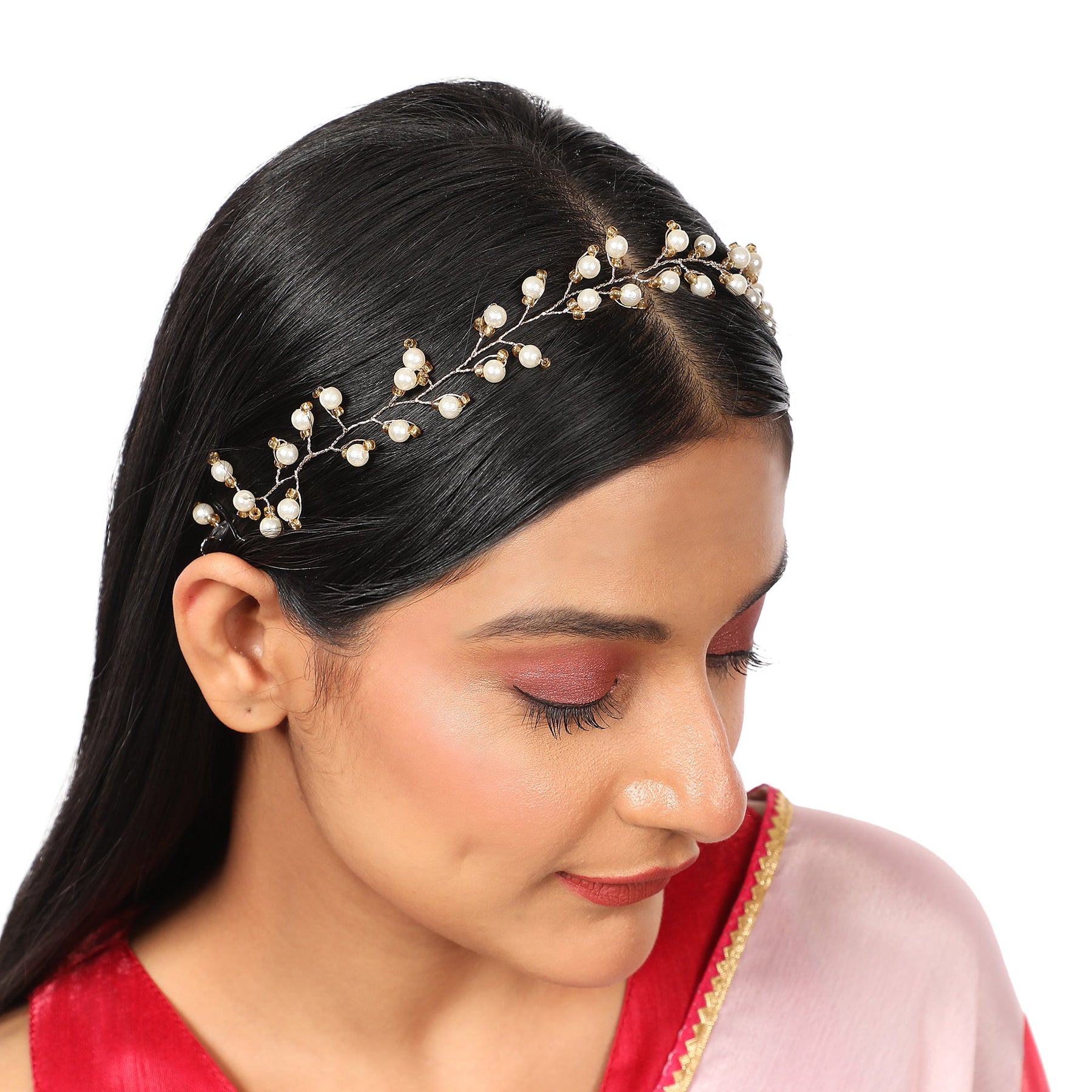 Mode Mania Statement Gold Plated Leaf Design Peal Studded Foldable Hair Accessory For Women And Girls