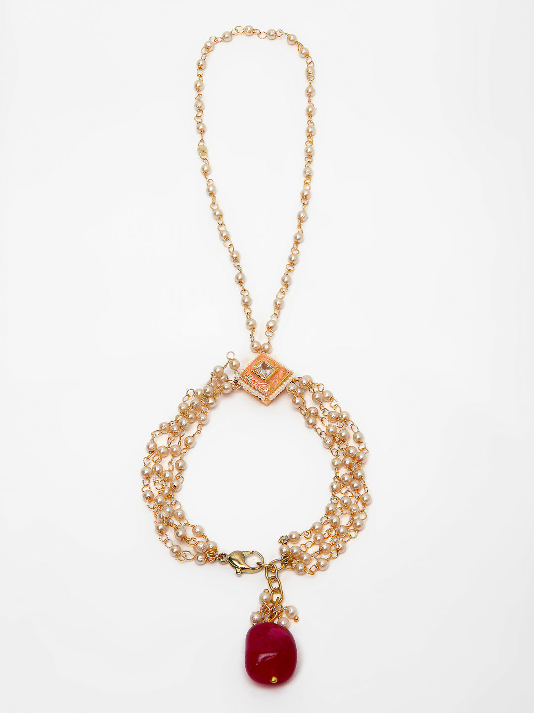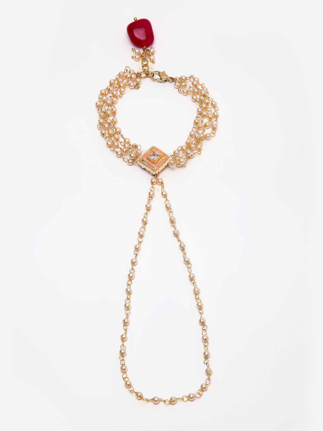 Red & White Hathful With Kundan & Pearls; Category Of Jewellery Is Hand Jewellery; Sub Category Is Hath Phool; Ideal For Women; Color Is Red, White, Gold; Gemstones Used - Kundan, Pearls, Natural Stones, Faux Ruby; Plating Is Gold-Plated; Base Metal Is Alloy; Other Material Used - Adjustable Chain; Size Is Freesize; Adjustable - Yes; Weight Is 11 Gms; Mesaurements - Width Of Hathful = 2 Cm; Diameter Of Hathful =6.03 Cm; Circumference Of Hathful = 18.95 Cm; Adjustable - Yes; Content 1 Hathful