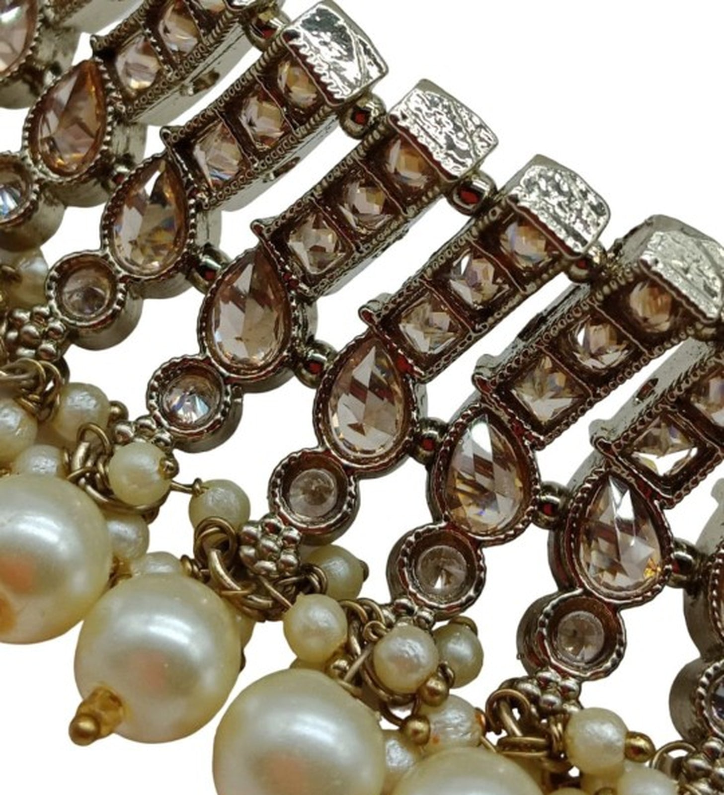 The Choker Necklace Showcases A Stunning Array Of Intricate Metalwork, Creating A Fan-Like Pattern That Gracefully Adorns The Neckline. Dangling Pearl Drops Add A Touch Of Classic Beauty And Movement. The Coordinating Earrings Echo The Necklace'S Design, Featuring Ornate Metalwork And Pearl Embellishments That Frame The Face Beautifully.