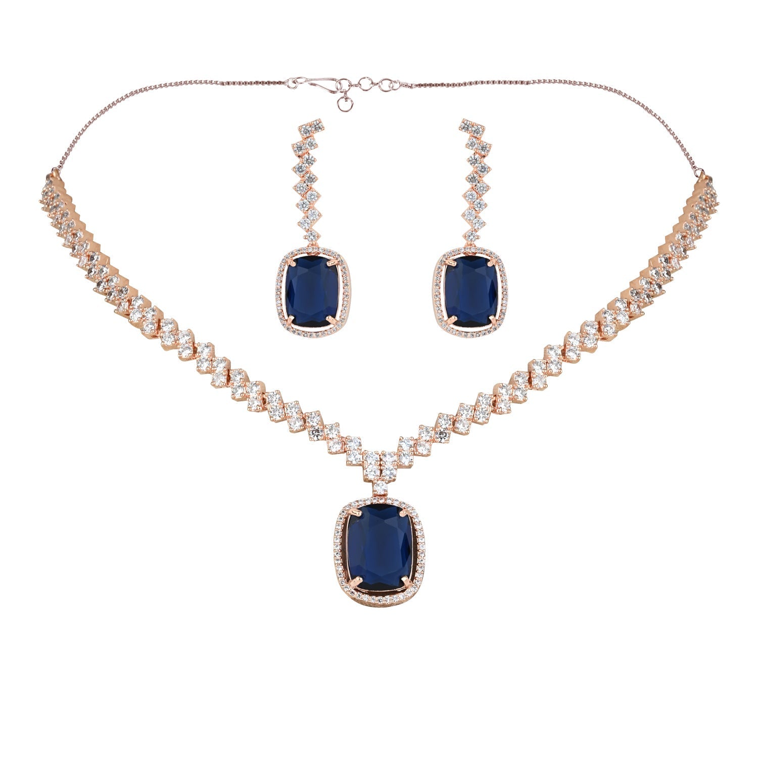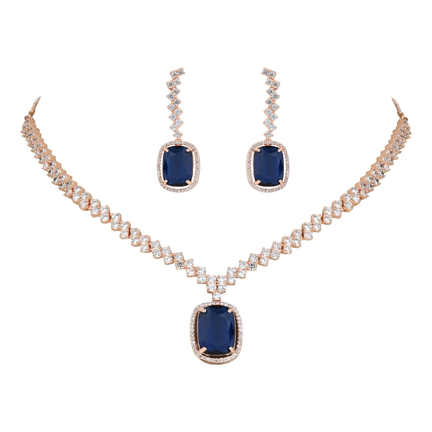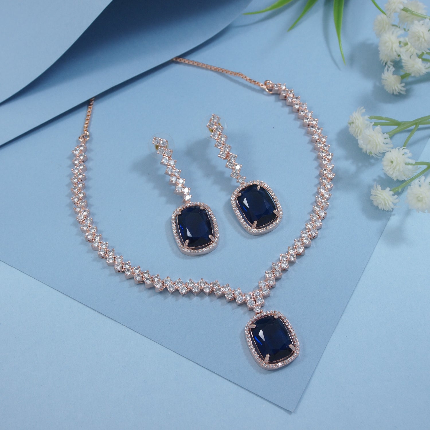 The Intricate Design Of The Necklace Is Accentuated By Crystal-Studded Embellishments, Adding A Layer Of Sophistication And Grace. The Set Includes Matching Drop Earrings, Perfectly Coordinated With The Necklace, Featuring A Rose Gold Finish, Cubic Zirconia, And Crystal Detailing For A Cohesive And Glamorous Look. Ideal For Special Occasions, Weddings, Or Festive Events, This Jewellery Set Offers A Perfect Blend Of Modern Style And Classic Beauty, Making It An Essential Addition To Any Jewellery Collection. The Secure Clasp And Comfortable Earrings Ensure Ease Of Wear, Allowing You To Enjoy The Spotlight Effortlessly.