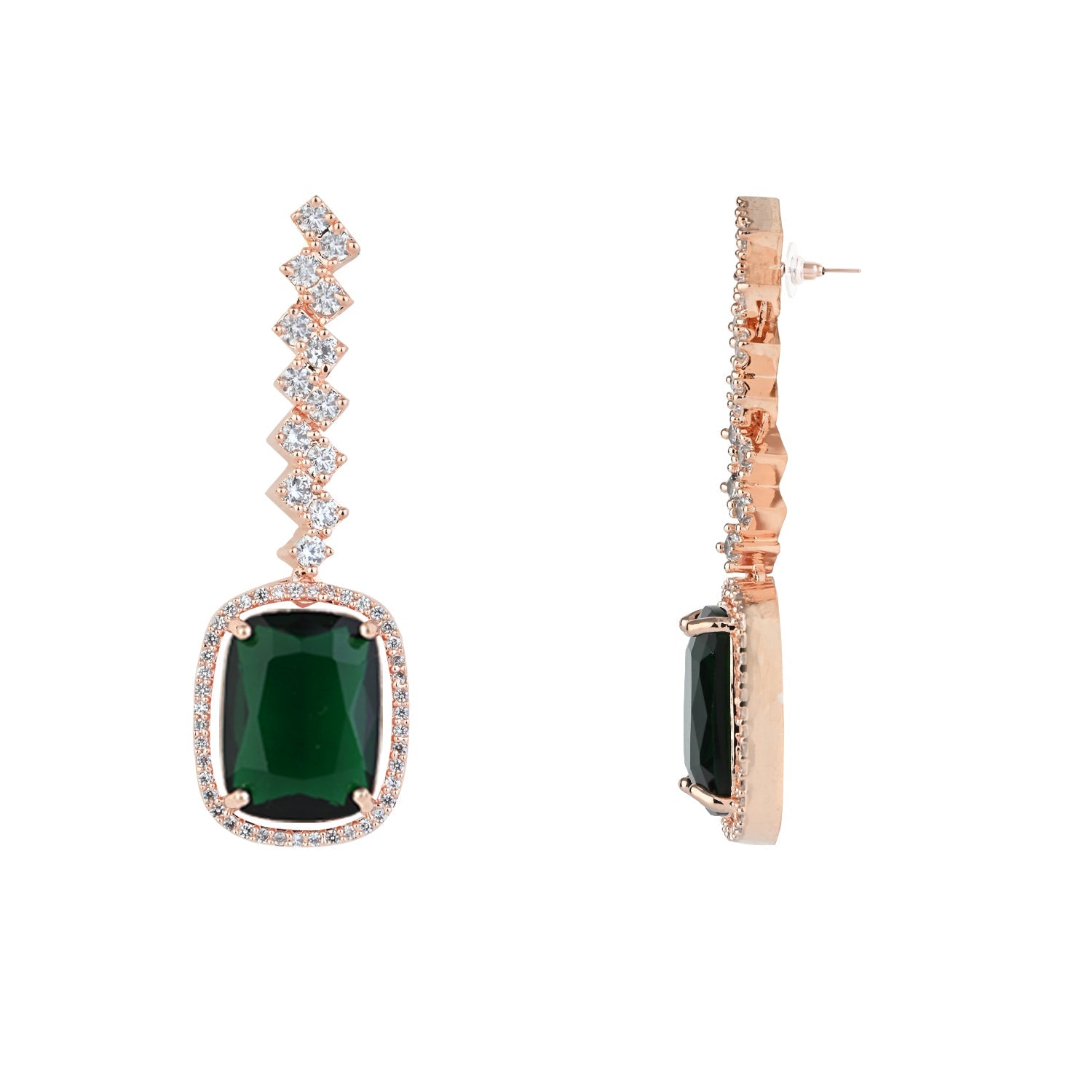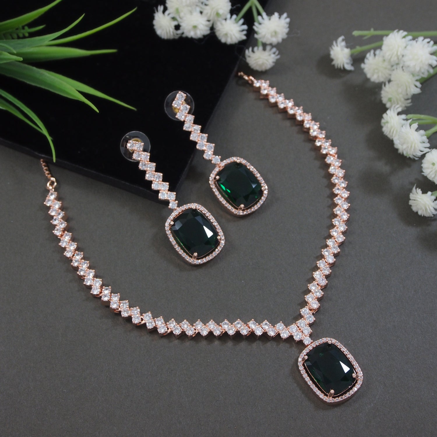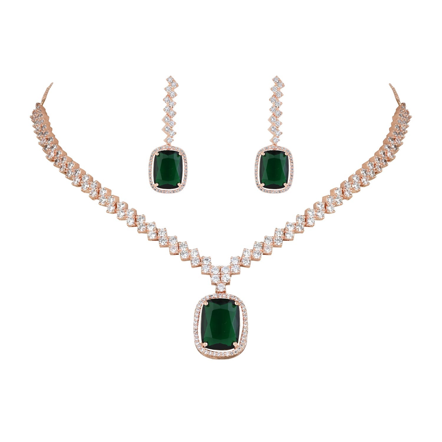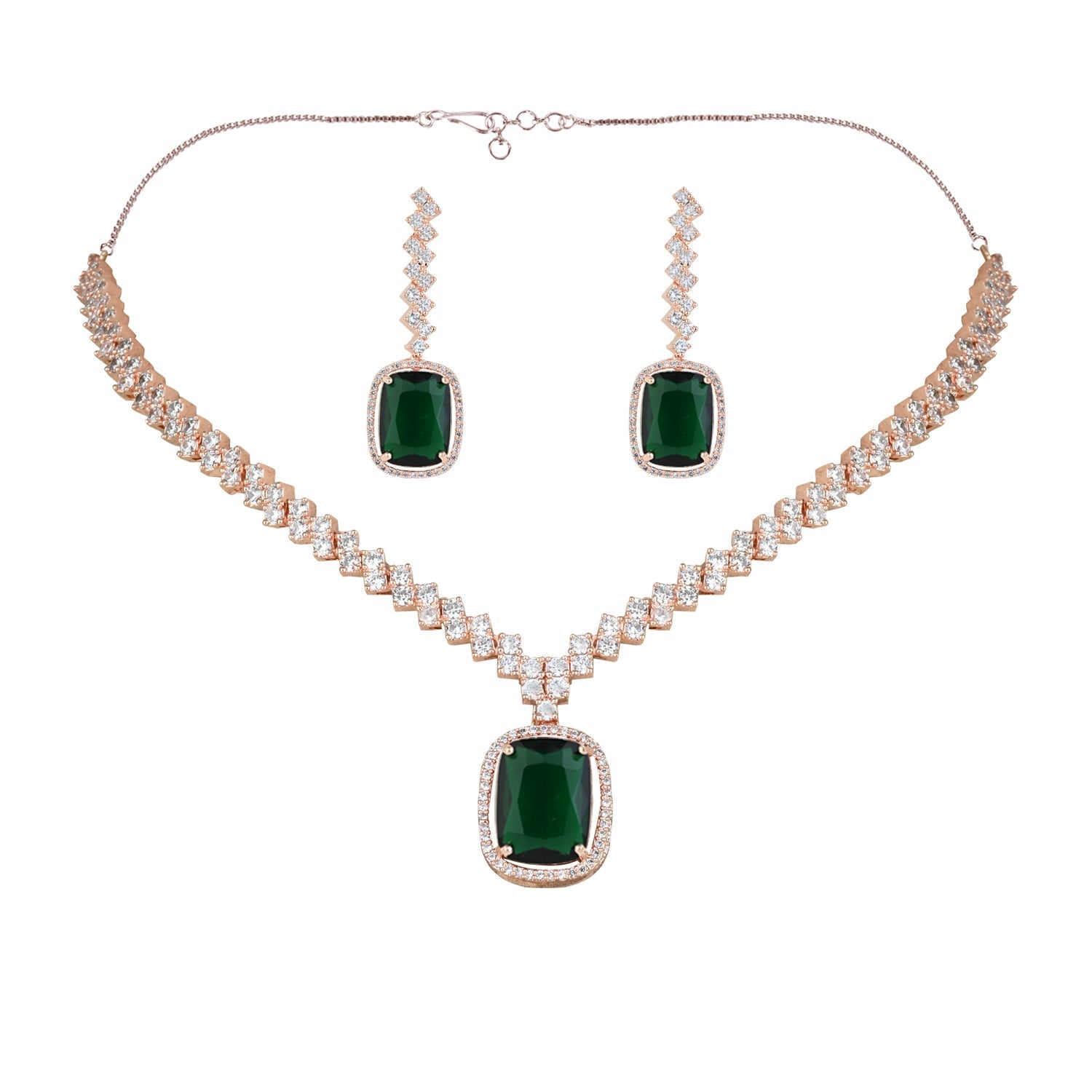 The Intricate Design Of The Necklace Is Accentuated By Crystal-Studded Embellishments, Adding A Layer Of Sophistication And Grace. The Set Includes Matching Drop Earrings, Perfectly Coordinated With The Necklace, Featuring A Rose Gold Finish, Cubic Zirconia, And Crystal Detailing For A Cohesive And Glamorous Look. Ideal For Special Occasions, Weddings, Or Festive Events, This Jewellery Set Offers A Perfect Blend Of Modern Style And Classic Beauty, Making It An Essential Addition To Any Jewellery Collection. The Secure Clasp And Comfortable Earrings Ensure Ease Of Wear, Allowing You To Enjoy The Spotlight Effortlessly.