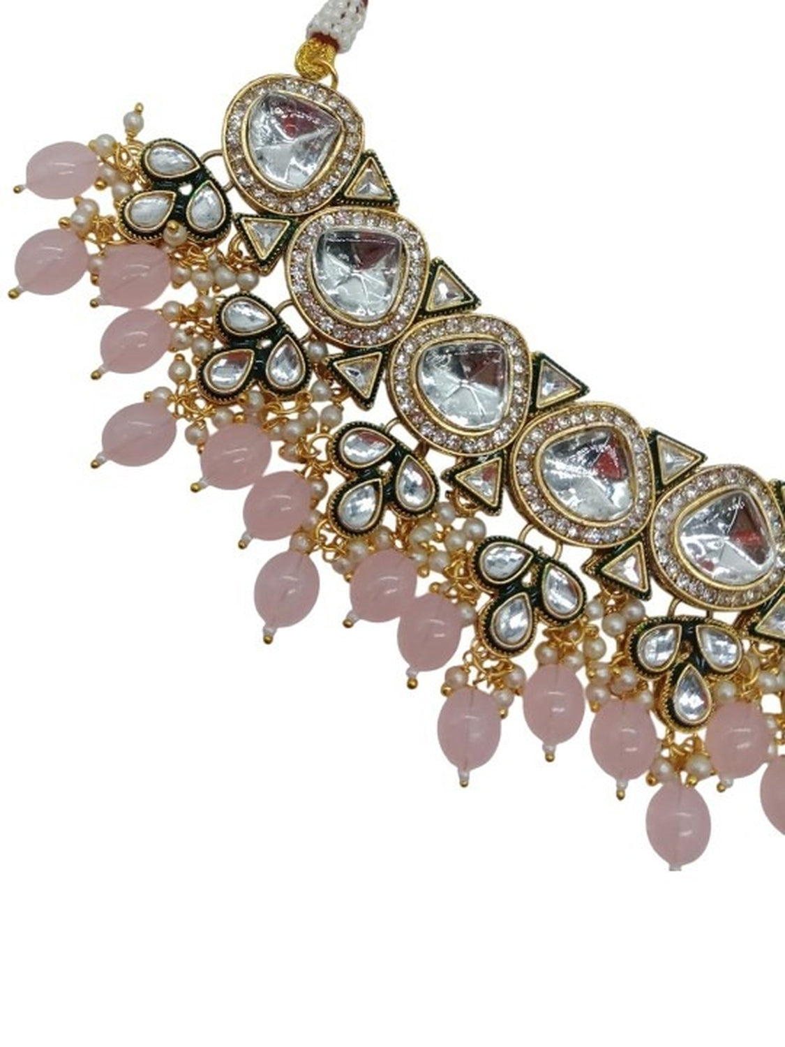 A Beautifully Handcrafted Gold-Plated Choker Necklace, Adorned With Sparkling Kundan Stones And Elegant Bead Droplets