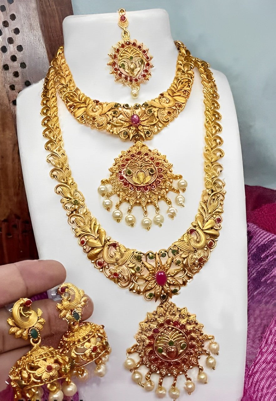 Crafted With Meticulous Attention To Detail, This Set Embodies Traditional Indian Artistry With A Contemporary Flair. The Gold-Plated Finish Gives A Rich, Luxurious Look While Remaining Affordable. Colored Stones And Pearls Add A Touch Of Elegance And Sophistication.
