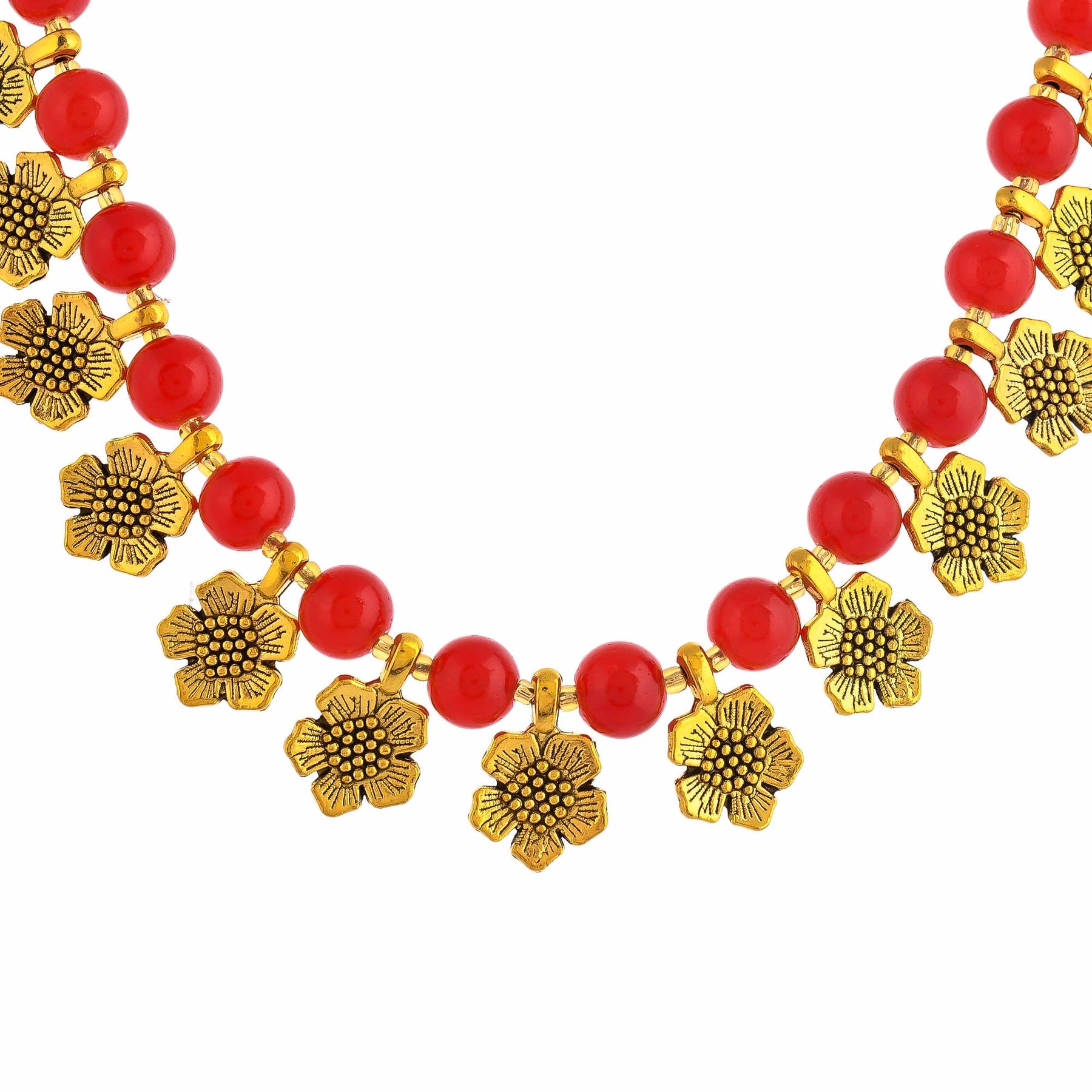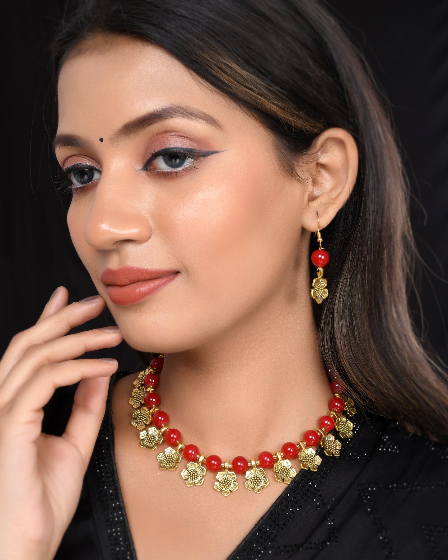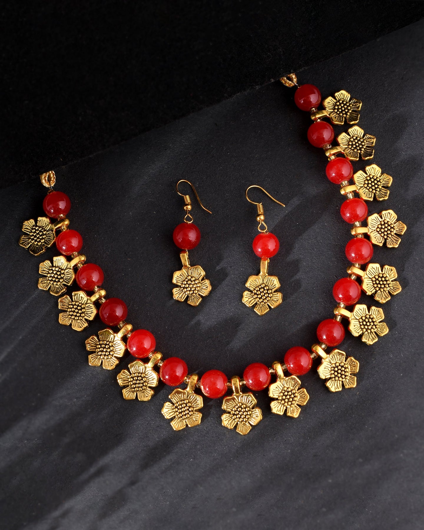 Women's Shine Beads Ethnic Gold Flower Necklace With Earring Set | Gemstone Jewellery Set