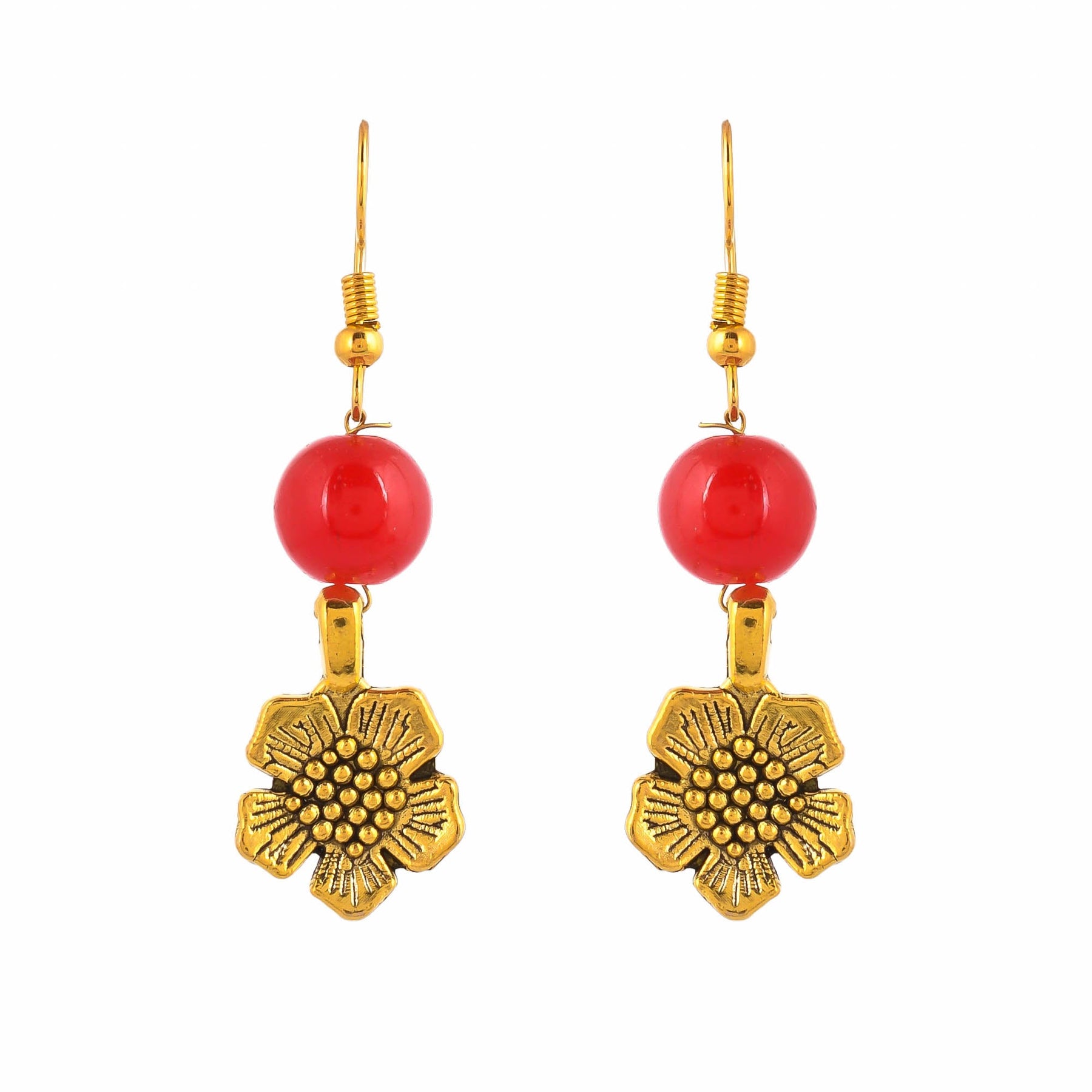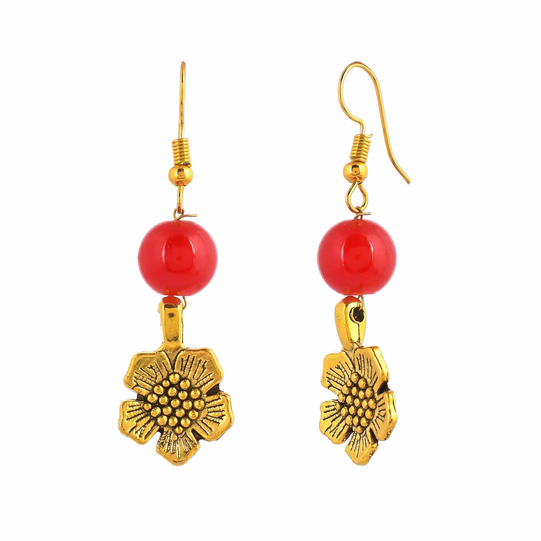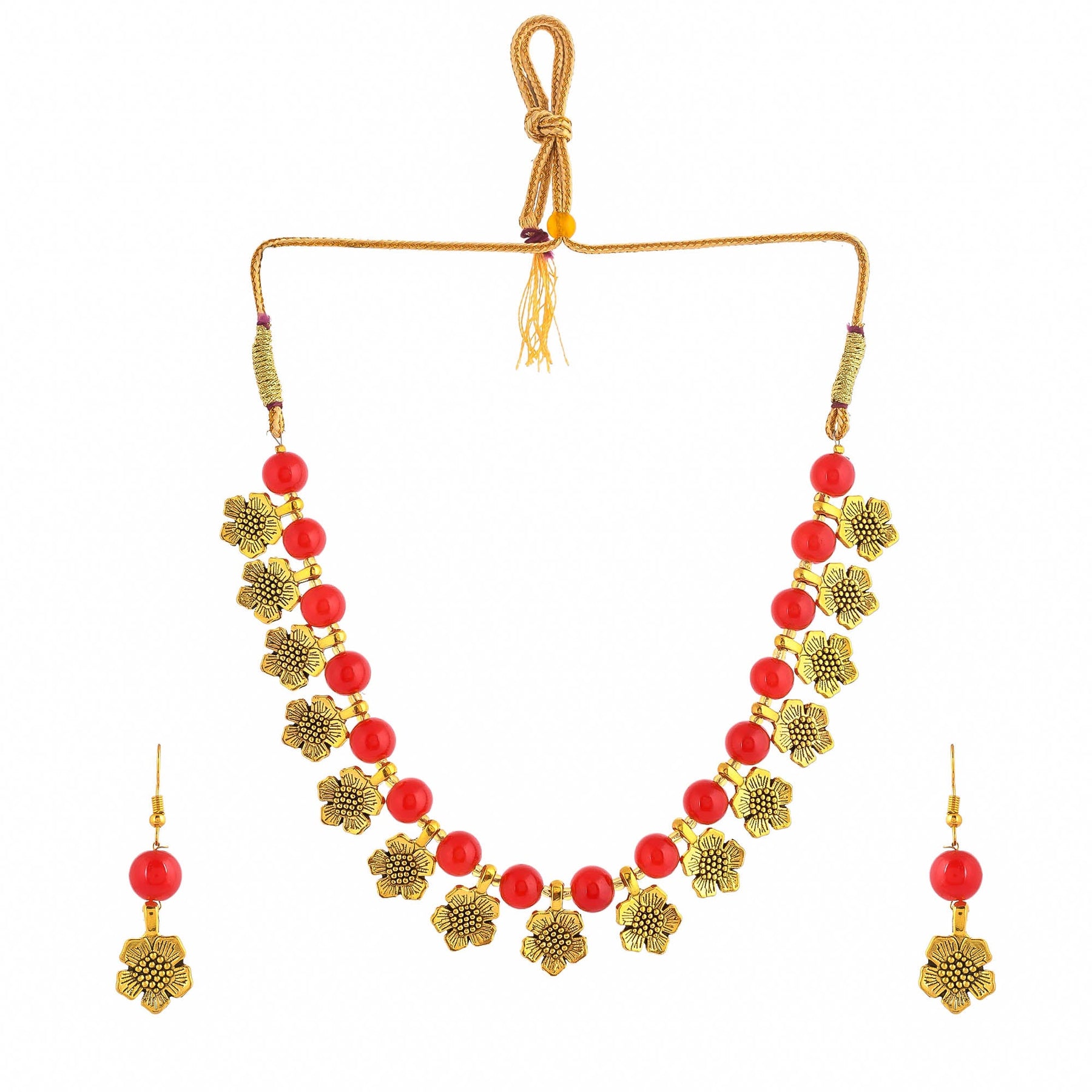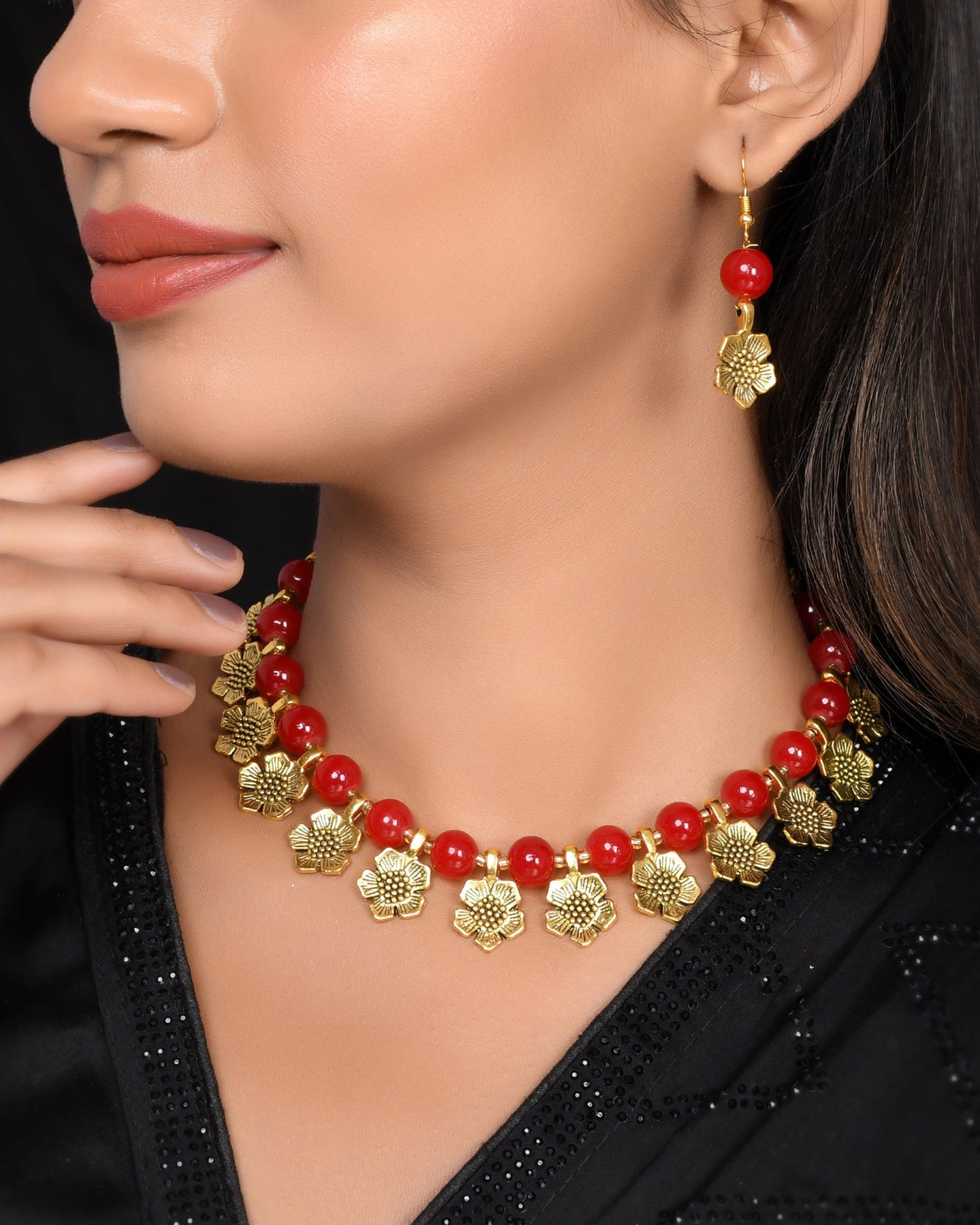 Women's Shine Beads Ethnic Gold Flower Necklace With Earring Set | Gemstone Jewellery Set