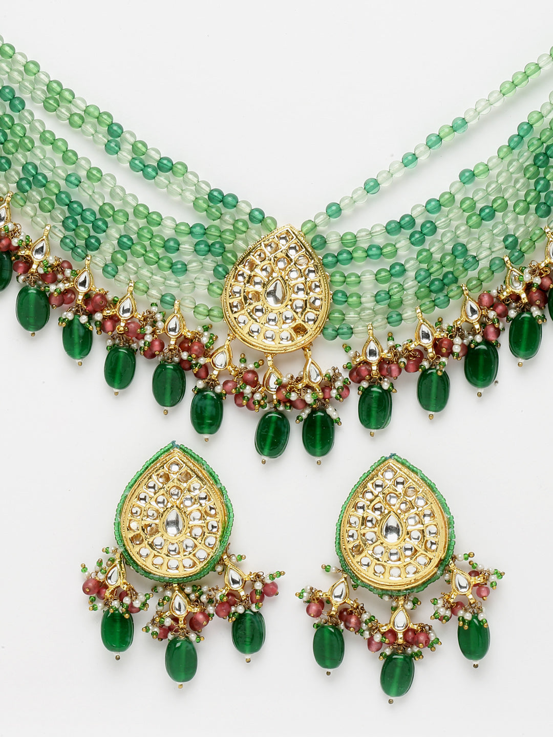 Kundan Paan Pendel With Ombrey Shades Of Green And Pink Is What Makes This Pc Unique And Stylish; Category Of Jewellery Is Jewellery Set; Sub Category Is Necklace With Earring; Ideal For Women; Color Is Green, Pink, Gold, White; Gemstones Used - Kundan, Pearl, Natural Stones, Faux Emerald; Plating Is Gold-Plated; Base Metal Is Alloy; Other Material Used - Adjustable Dori; Size Is Freesize; Adjustable - Yes; Weight Is 167 Gms; Mesaurements - Length Of Earring= 8.1 Cm; Width Of Earring =3.6 Cm; Length Of Necklace =34 Cm; Width Of Necklace = 5 Cm; Adjustable - Yes; Content 1 Necklace And 1 Pair Earring