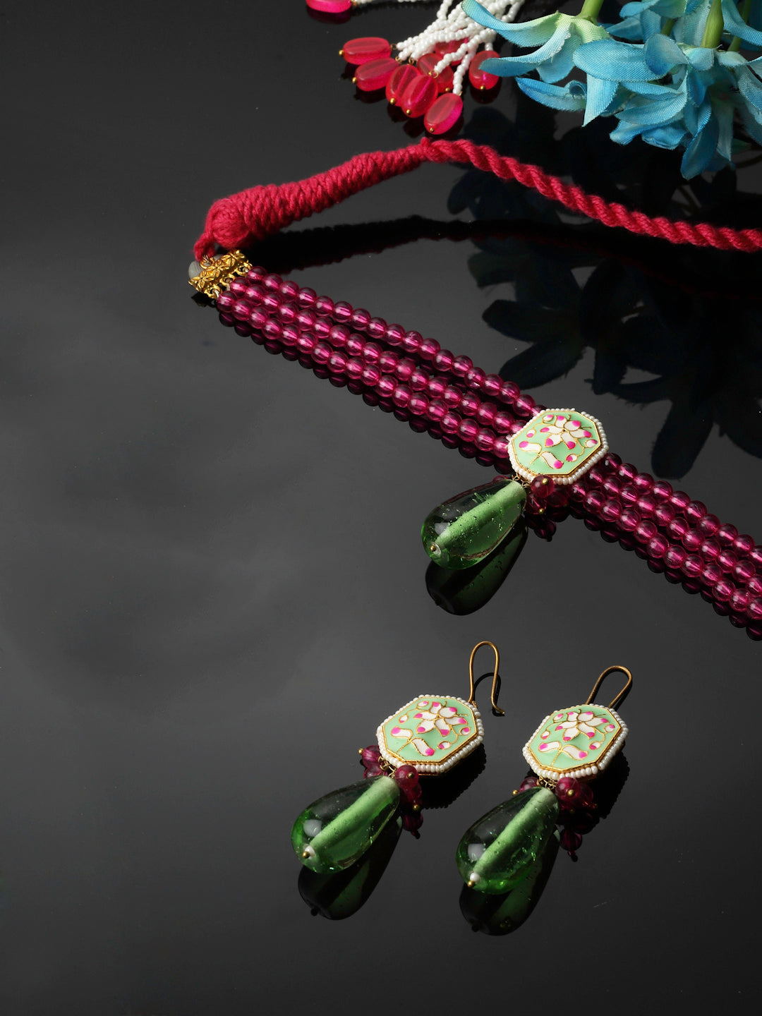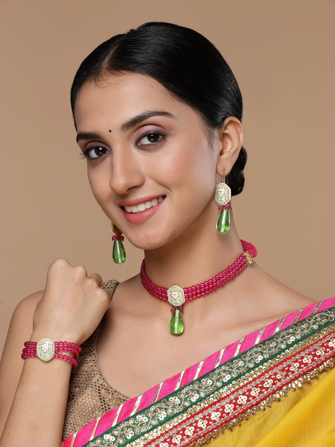 Pink And Green Is Fab For This Season Jewellery; Category Of Jewellery Is Jewellery Set; Sub Category Is Necklace With Earring; Ideal For Women; Color Is Green, Pink, Gold, White; Gemstones Used - Kundan, Pearls, Natural Stones; Plating Is Gold-Plated; Base Metal Is Alloy; Other Material Used - Adjustable Dori; Size Is Freesize; Adjustable - Yes; Weight Is 50 Gms; Mesaurements - Length Of Earring= 6 Cm; Width Of Earring =2.3 Cm; Length Of Necklace =42 Cm; Width Of Necklace = 2 Cm; Adjustable - Yes; Content 1 Necklace 1 Pair Earring