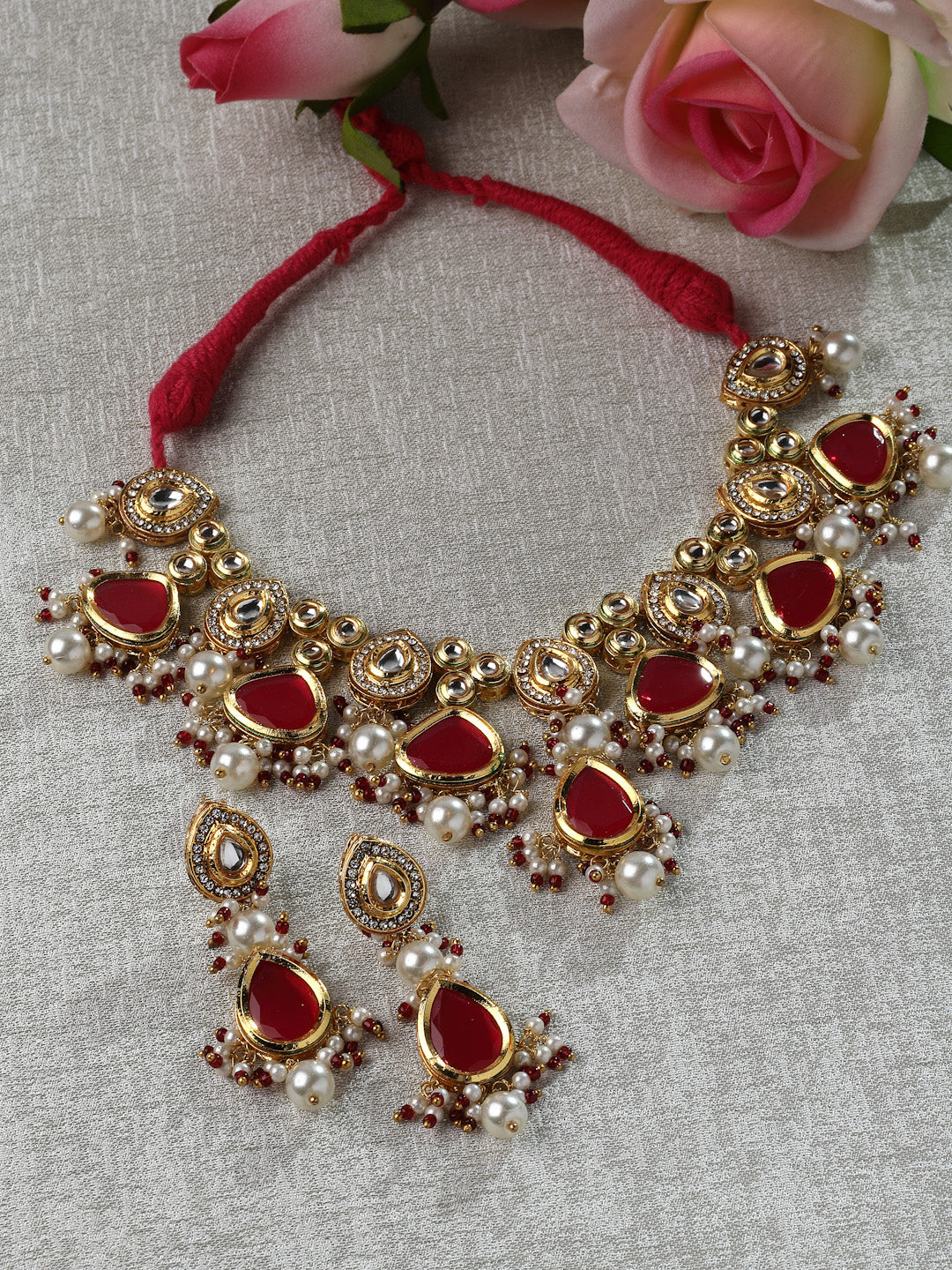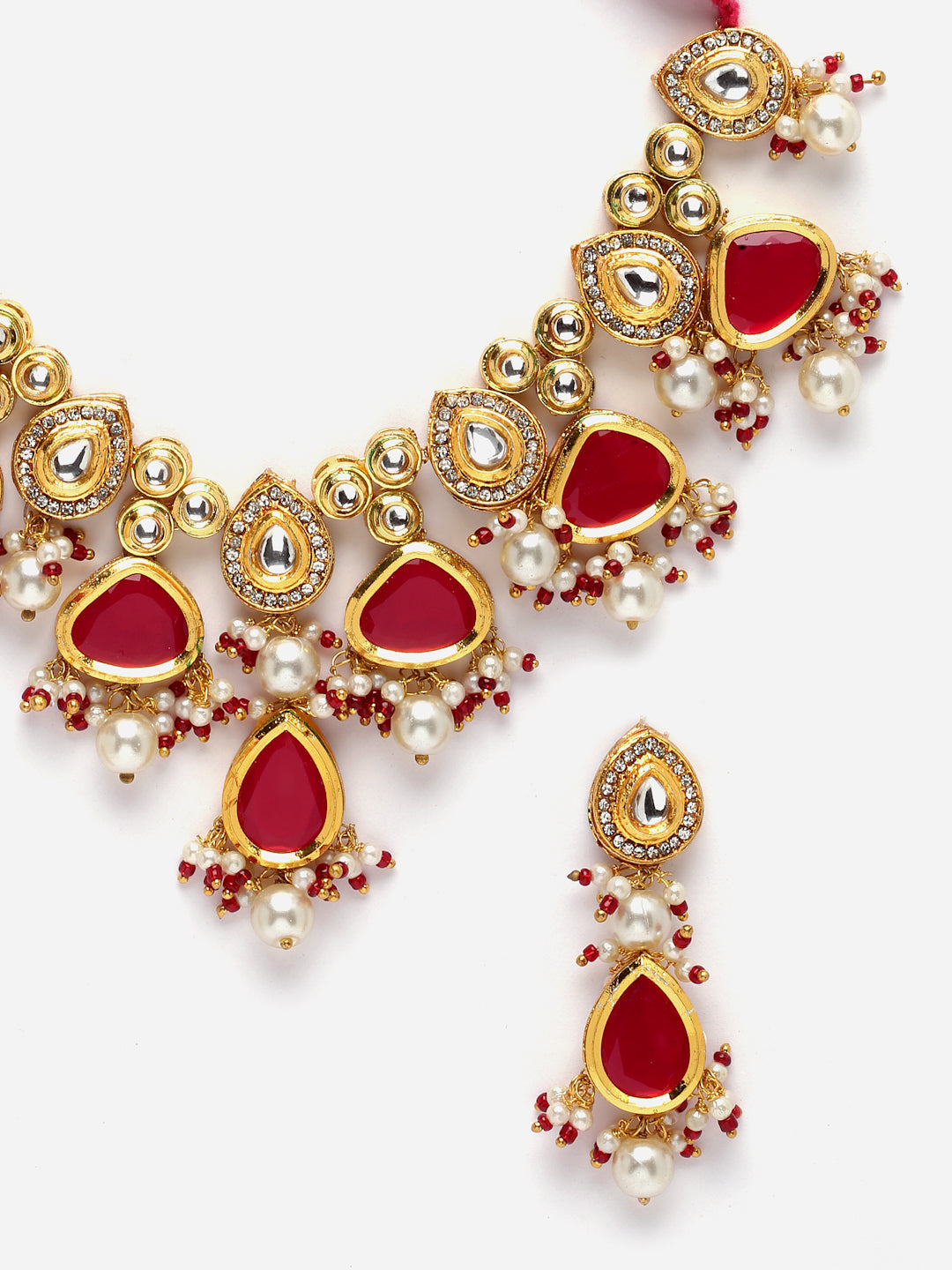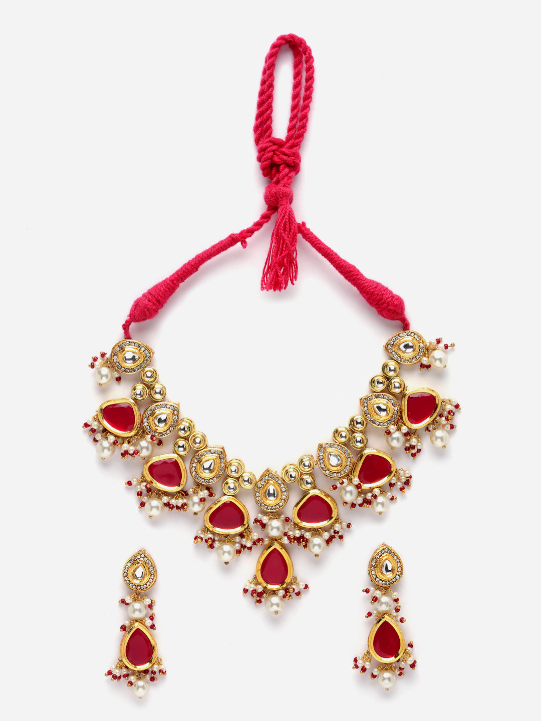 Kundan And Color Of Pop Up Neck Pc Makes This C Unique And Beautiful; Category Of Jewellery Is Jewellery Set; Sub Category Is Necklace With Earring; Ideal For Women; Color Is Pink, Red, Gold, White; Gemstones Used - Kundan, American Diamond, Pearls, Natural Stones, Faux Ruby; Plating Is Gold-Plated; Base Metal Is Alloy; Other Material Used - Adjustable Dori; Size Is Freesize; Adjustable - Yes; Weight Is 110 Gms; Mesaurements - Length Of Earring= 6 Cm; Width Of Earring =2 Cm; Length Of Necklace =46 Cm; Width Of Necklace = 7 Cm; Adjustable - Yes; Content 1 Necklace 1 Pair Earring