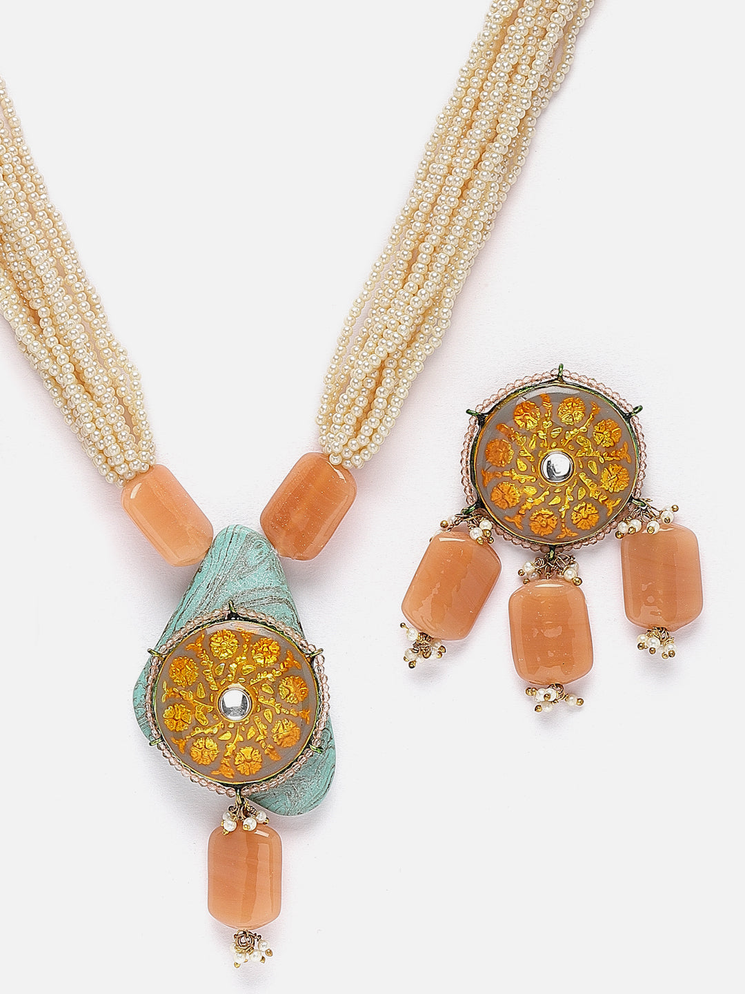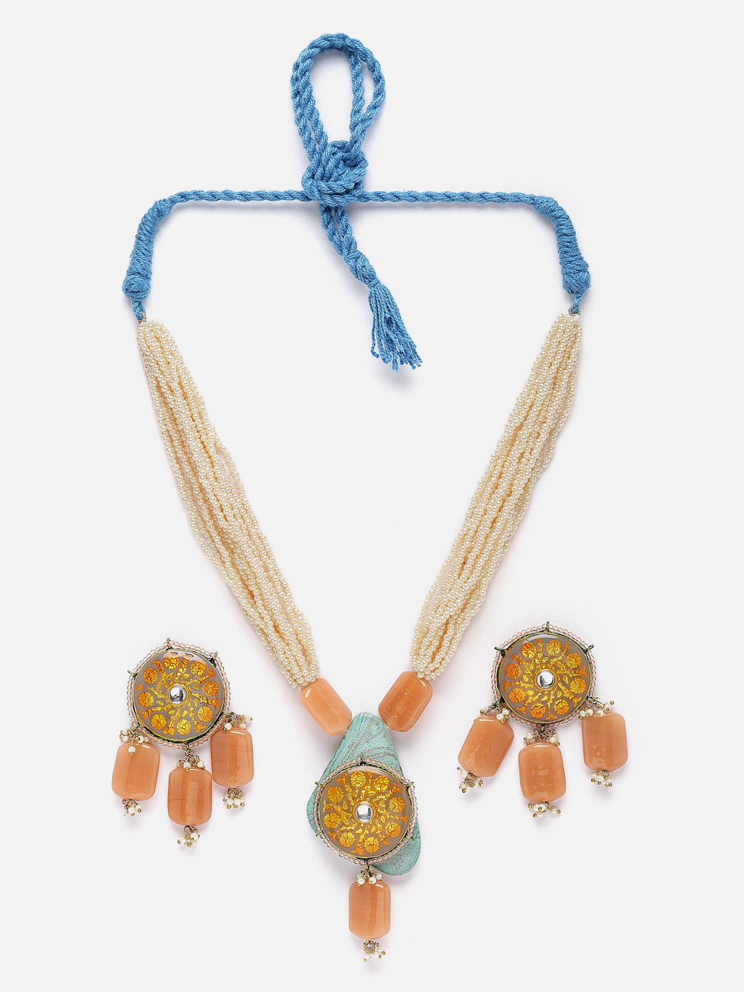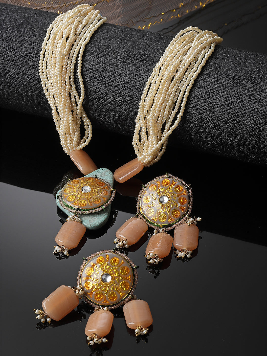 Grey And Peach Necklace Set With Earring; Category Of Jewellery Is Jewellery Set; Sub Category Is Necklace With Earring; Ideal For Women; Color Is Orange, Grey, Peach, Green, Yellow, Blue, Cream, White, Gold ; Gemstones Used - Kundan, Pearls, Natural Stones; Plating Is Gold-Plated; Base Metal Is Alloy; Other Material Used - Adjustable Dori; Size Is Freesize; Adjustable - Yes; Weight Is 100 Gms; Mesaurements - Length Of Earring= 7 Cm; Width Of Earring =5 Cm; Length Of Necklace =67 Cm; Width Of Necklace = 10 Cm; Adjustable - Yes; Content 1 Necklace 1 Pair Earring