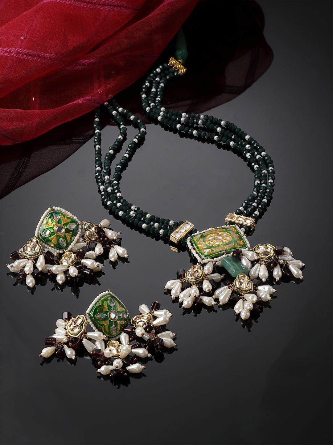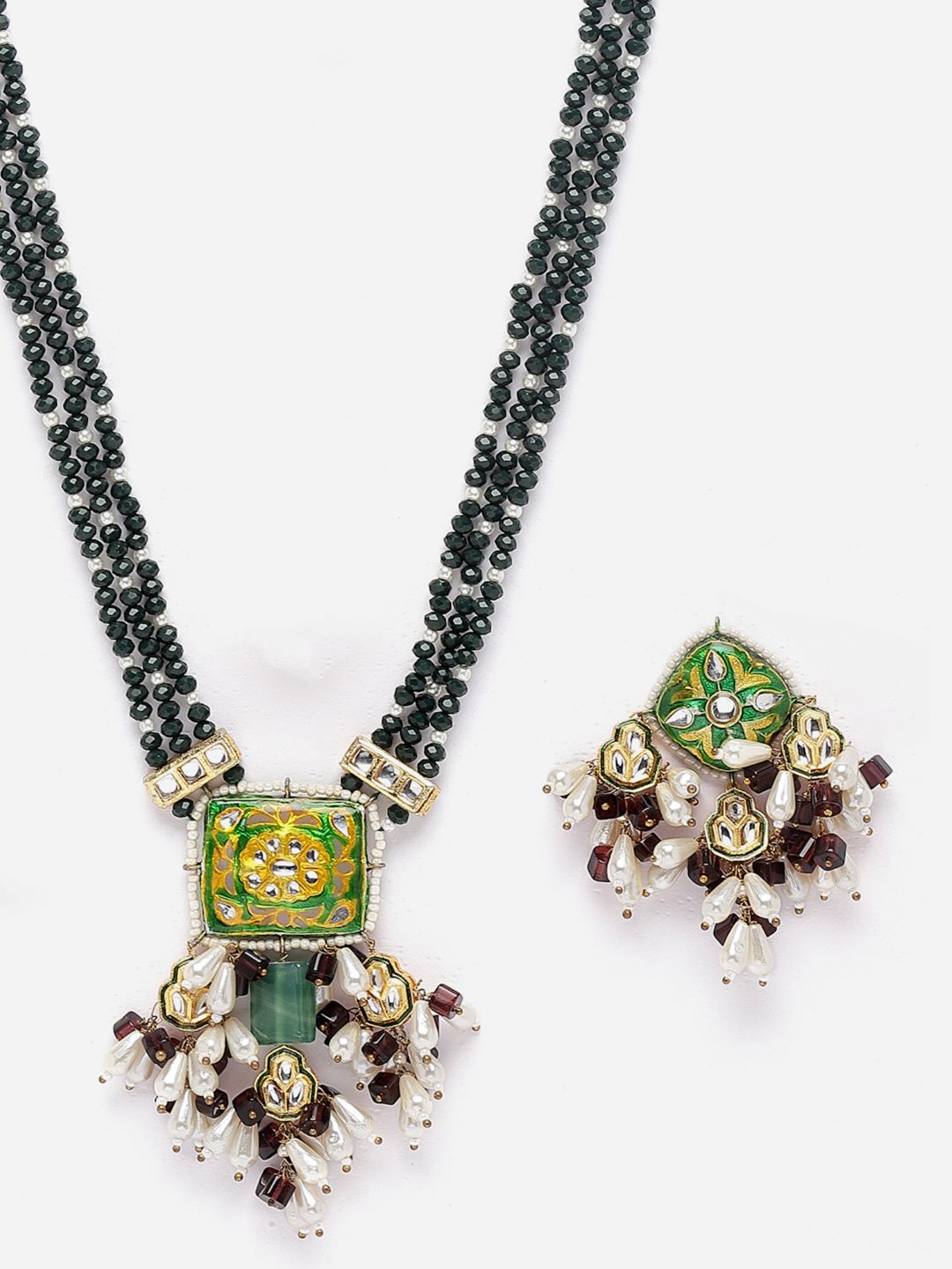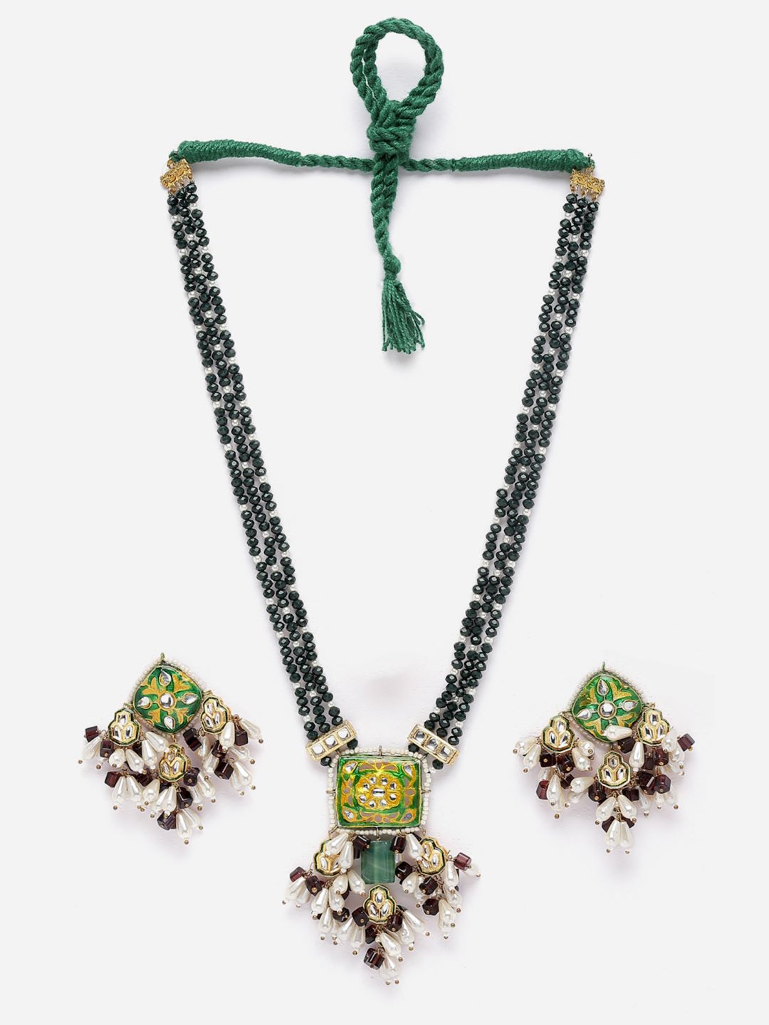 Green And Purple Hanging Neck Pc With Earring Meenakari ; Category Of Jewellery Is Jewellery Set; Sub Category Is Necklace With Earring; Ideal For Women; Color Is Green, Yellow, Purple, Grey, White, Gold ; Gemstones Used - Kundan, Pearls, Natural Stones; Plating Is Gold-Plated; Base Metal Is Alloy; Other Material Used - Adjustable Dori; Size Is Freesize; Adjustable - Yes; Weight Is 104 Gms; Mesaurements - Length Of Earring= 7 Cm; Width Of Earring =4 Cm; Length Of Necklace =60 Cm; Width Of Necklace = 10 Cm; Adjustable - Yes; Content 1 Necklace 1 Pair Earring