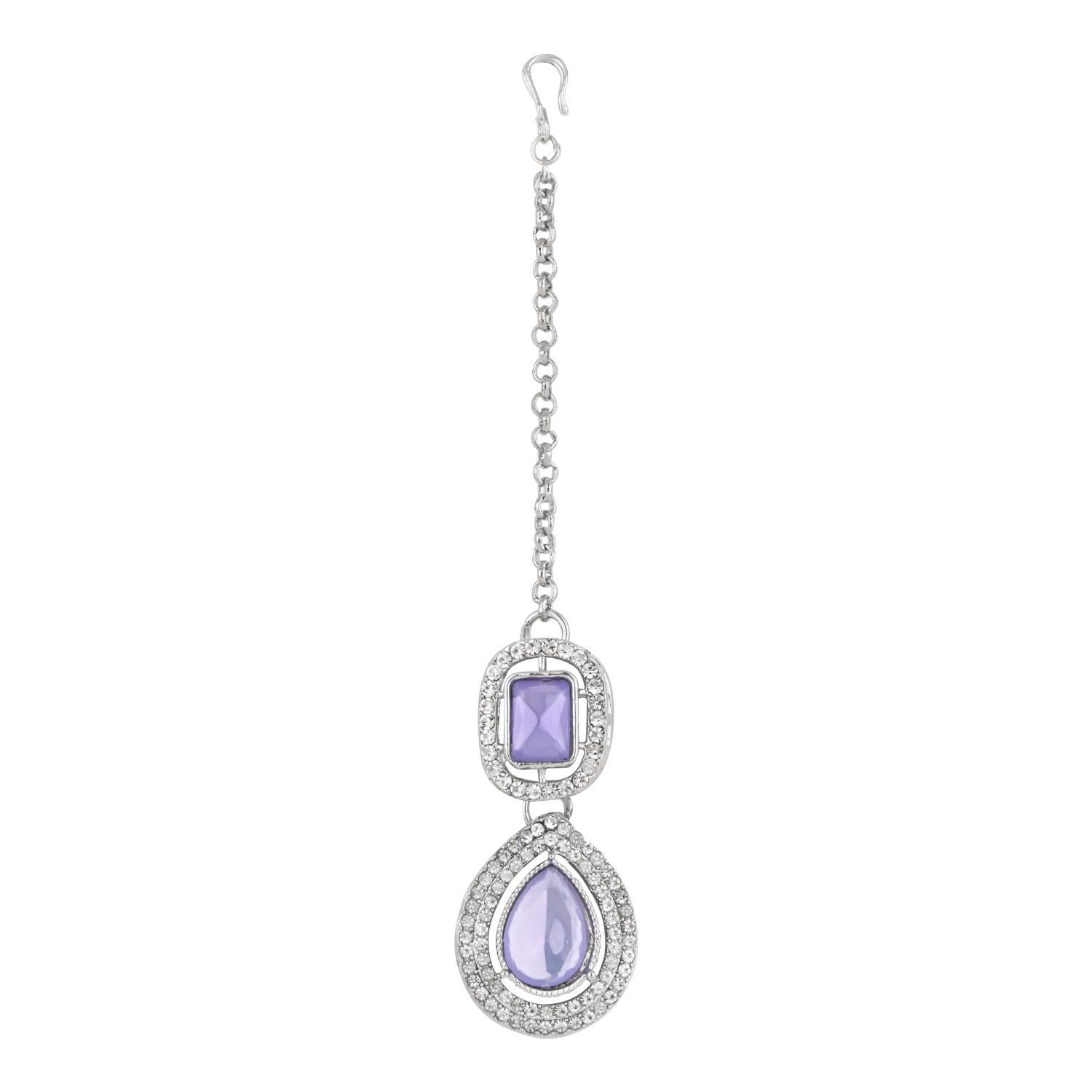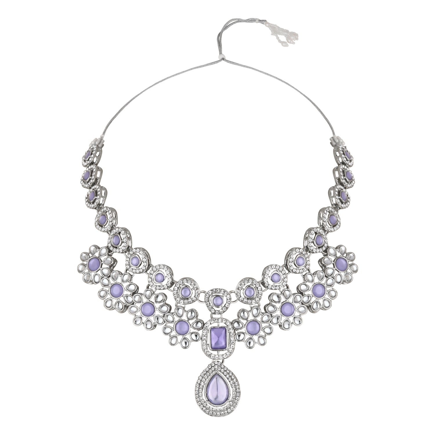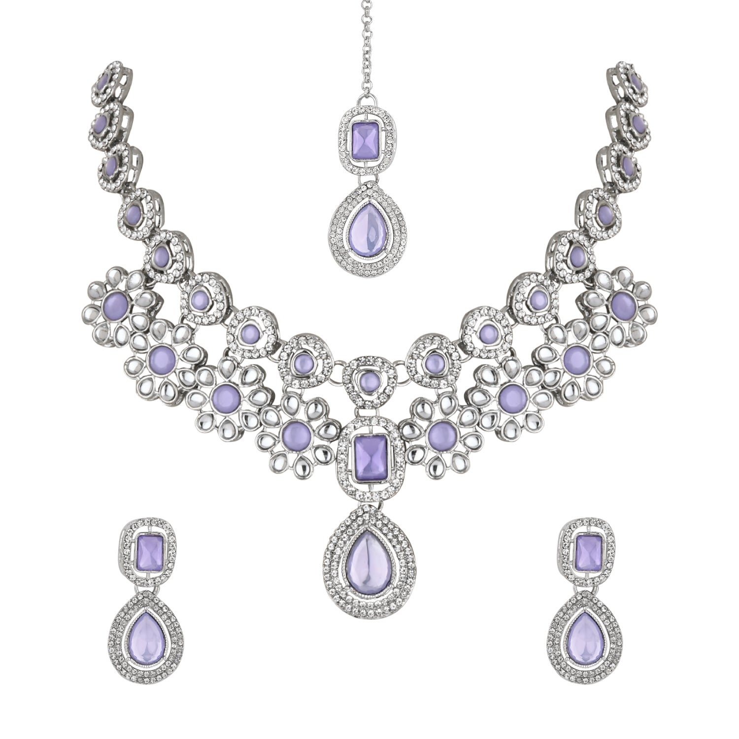 The silver-plated choker necklace set consists of a necklace, a pair of earrings, and a maang tikka. The necklace features kundan studded with pearl beaded in it, giving it an elegant and traditional look. The stones and pearls are set in a beautiful pattern, adding a touch of sophistication and grace to the necklace. The necklace is secured with drawstring closures, which make it easy to adjust the size to fit comfortably around the neck. This is an important feature, as it ensures that the necklace will be comfortable to wear for extended periods of time. The necklace is secured with drawstring closures, which make it easy to adjust the size to fit comfortably around the neck. This is an important feature, as it ensures that the necklace will be comfortable to wear for extended periods of time. The earrings and maang tikka are also adorned with stones and pearls, which match the pattern of the necklace. The earrings have a beautiful design, which makes them easy and comfortable to wear. The maang tikka is a traditional Indian hair accessory that can be worn with the necklace and earrings to complete the look.
