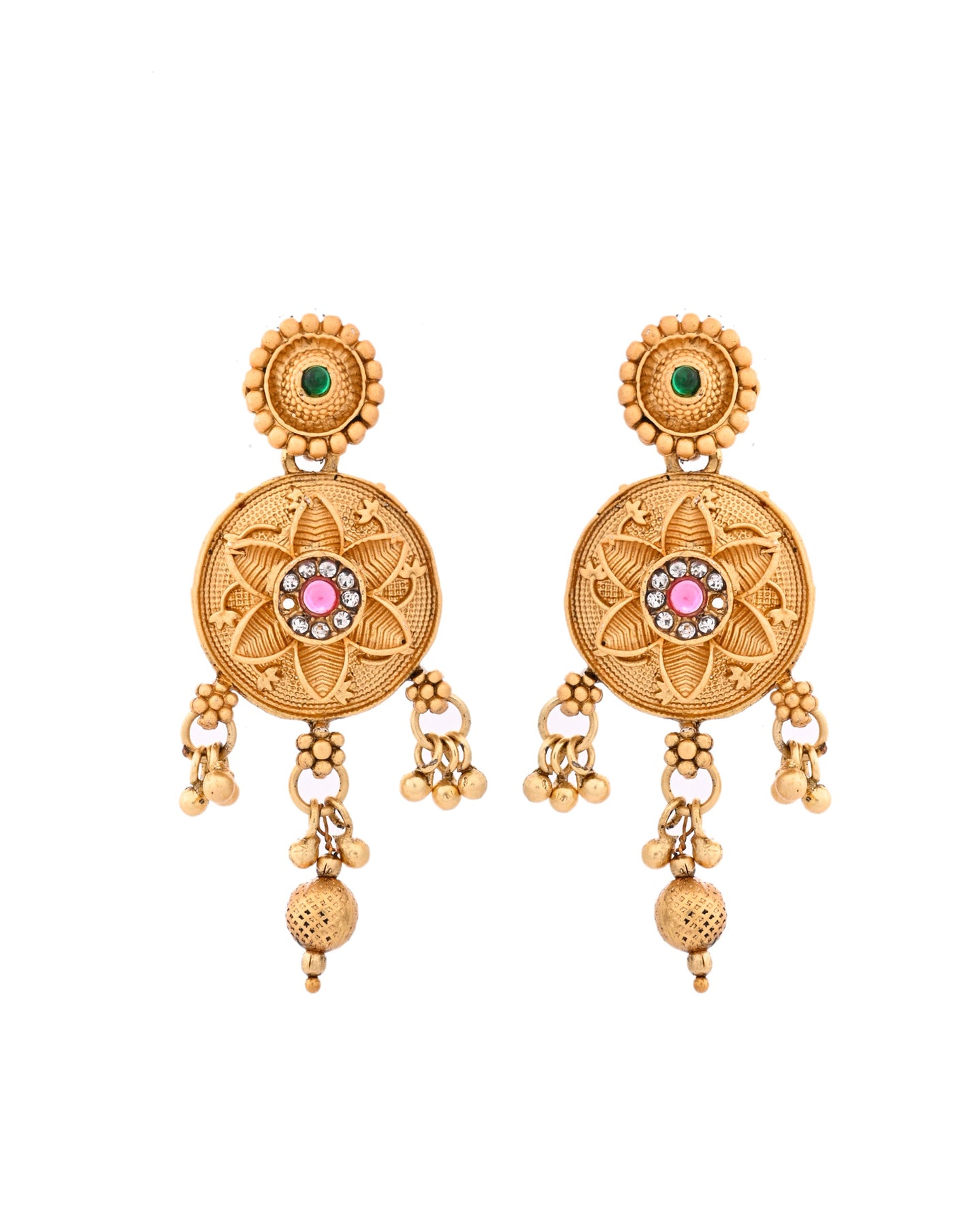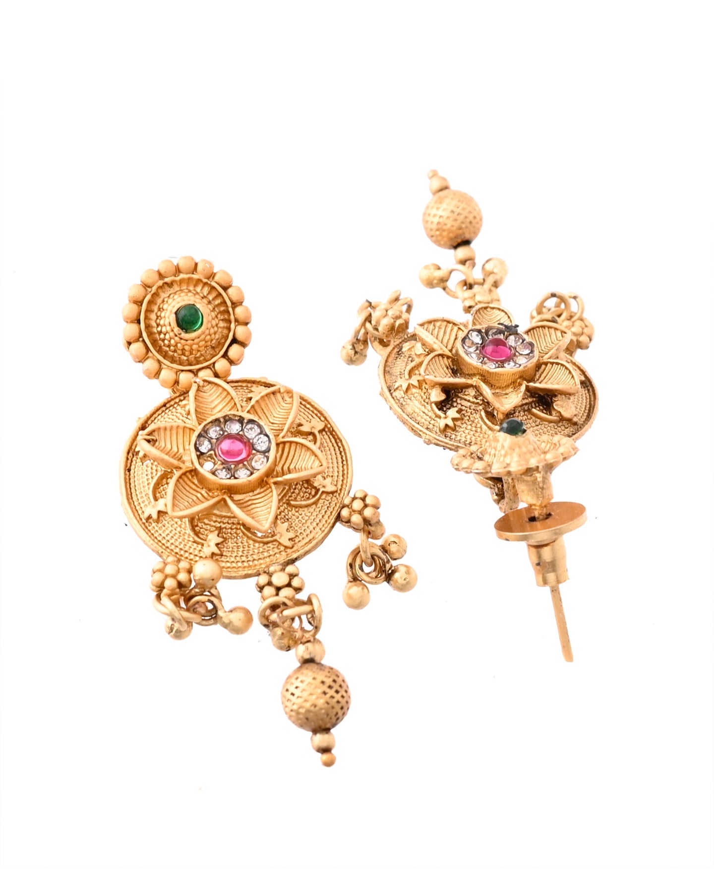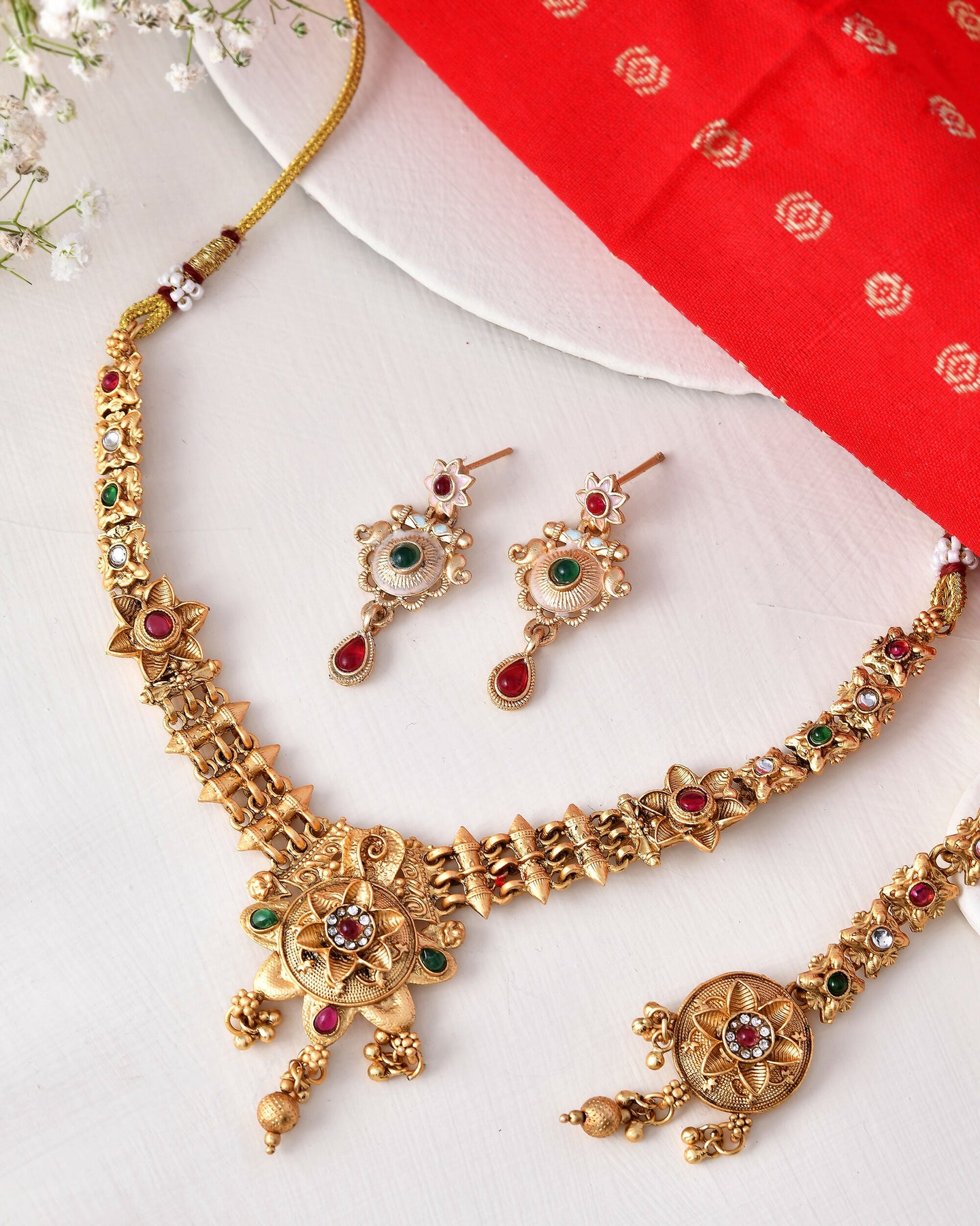 Channel The Rich Heritage Of Indian Craftsmanship With This Antique Gold-Plated Temple Jewelry Set. The Necklace Features A Traditional Design With Intricate Floral And Deity Motifs, Highlighted By Red And Green Gemstones. The Earrings Complement The Set Beautifully With A Matching Antique Finish And Delicate Detailing. This Set Is Perfect For Weddings, Festive Occasions, And Cultural Celebrations, Adding A Touch Of Regal Elegance To Any Outfit.