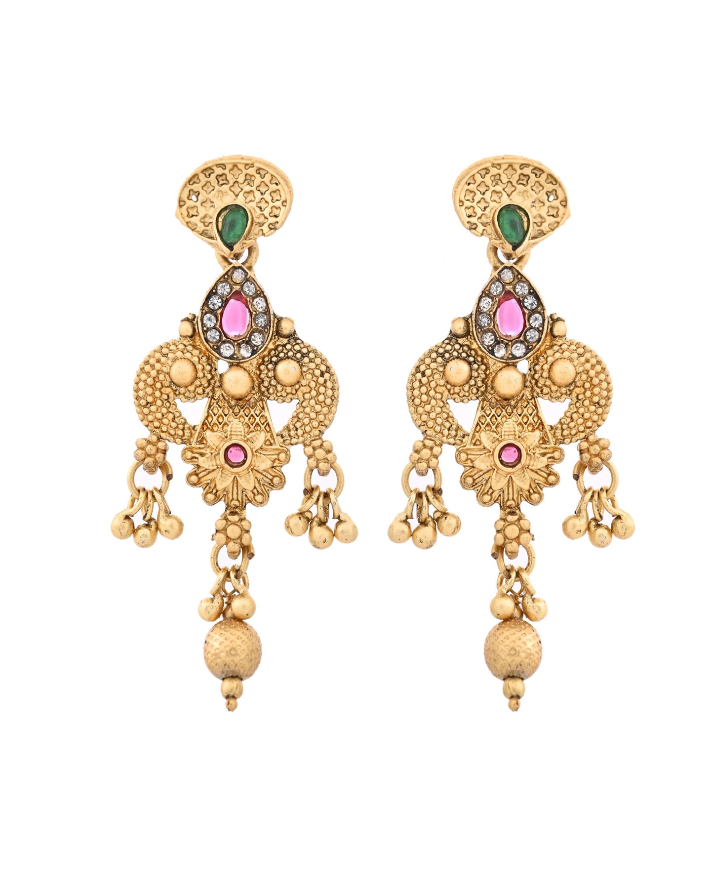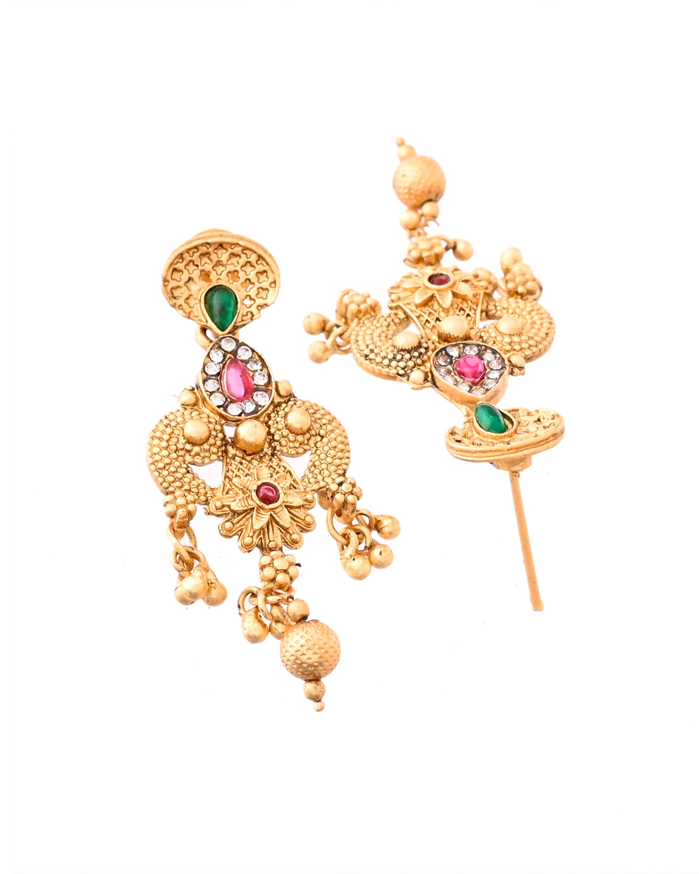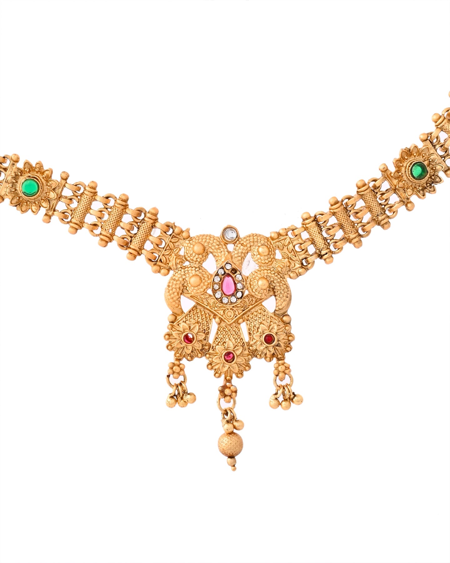 This Antique Gold-Plated Bridal Temple Necklace Set Is A Stunning Example Of Traditional Indian Craftsmanship. The Set Features Intricately Detailed Gold Motifs Adorned With Red And Green Gemstones, And White Pearl Beads, Giving It A Rich And Regal Look. The Necklace Has A Classic Temple Design With Traditional Patterns And Deity-Inspired Elements. Matching Earrings With Similar Detailing Complete The Look, Making It Perfect For Weddings, Festive Occasions, And Cultural Events.