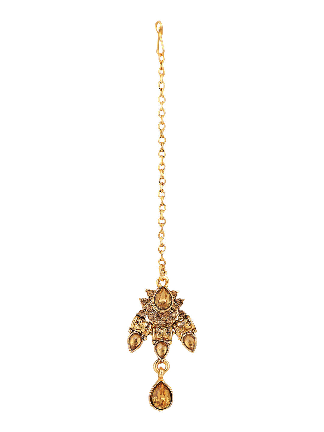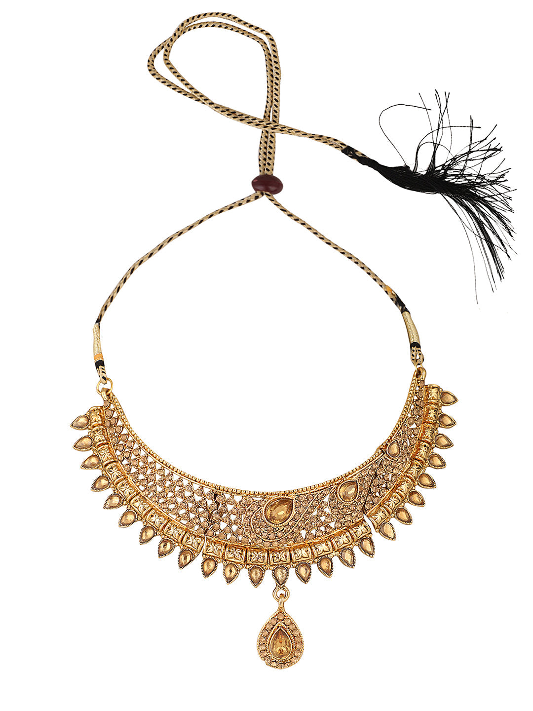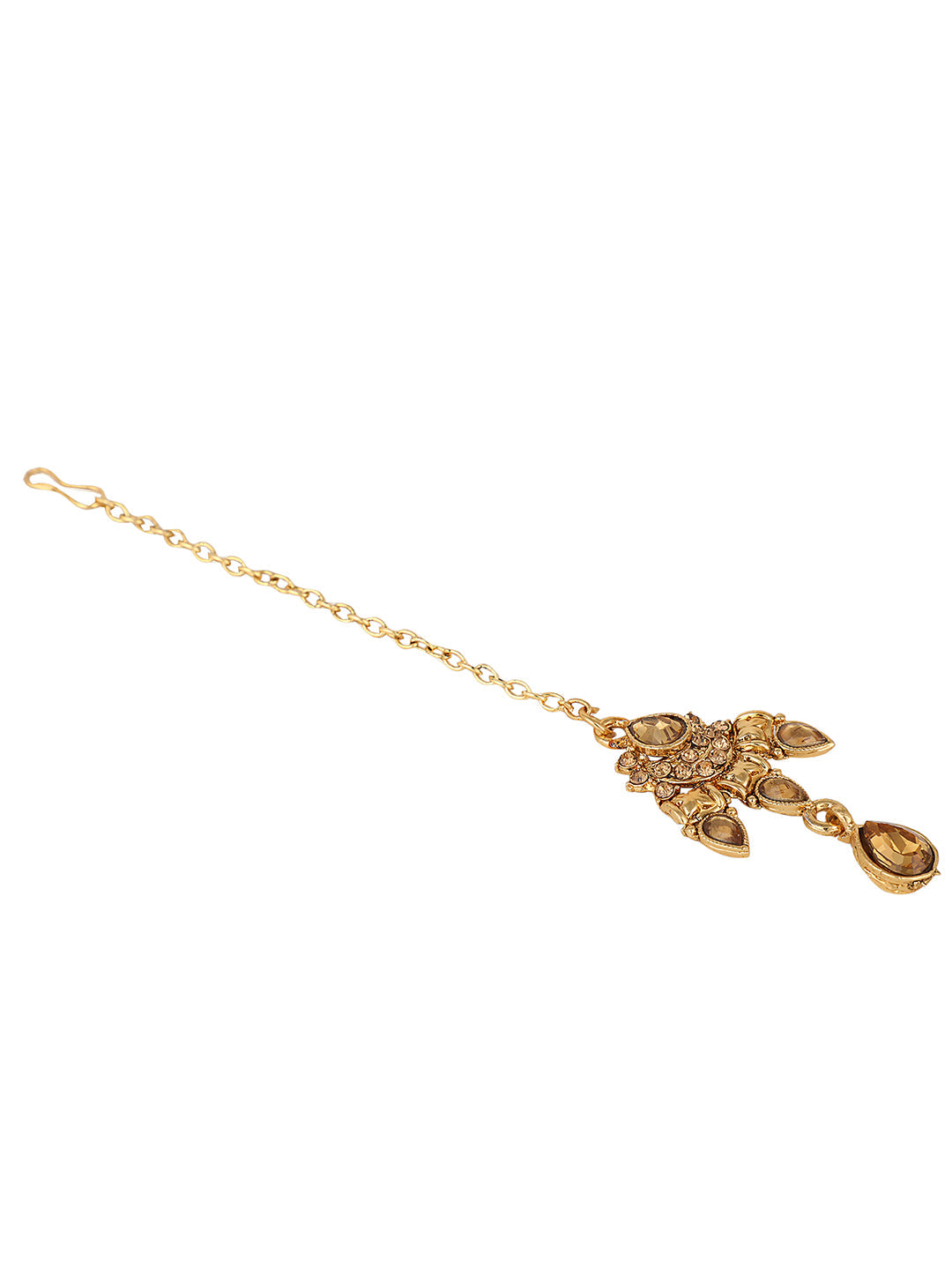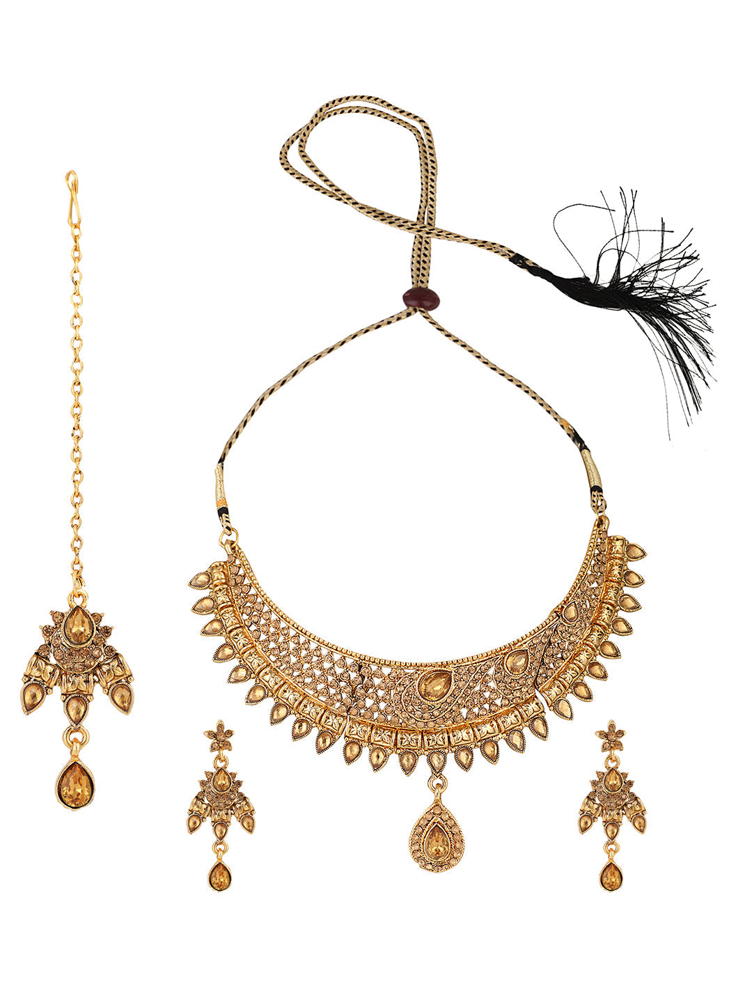 Designer Gold Plated Traditional Matte Finish Necklace With Earring Maangtika, Secured With Draw String Closure, Fits On All Attire